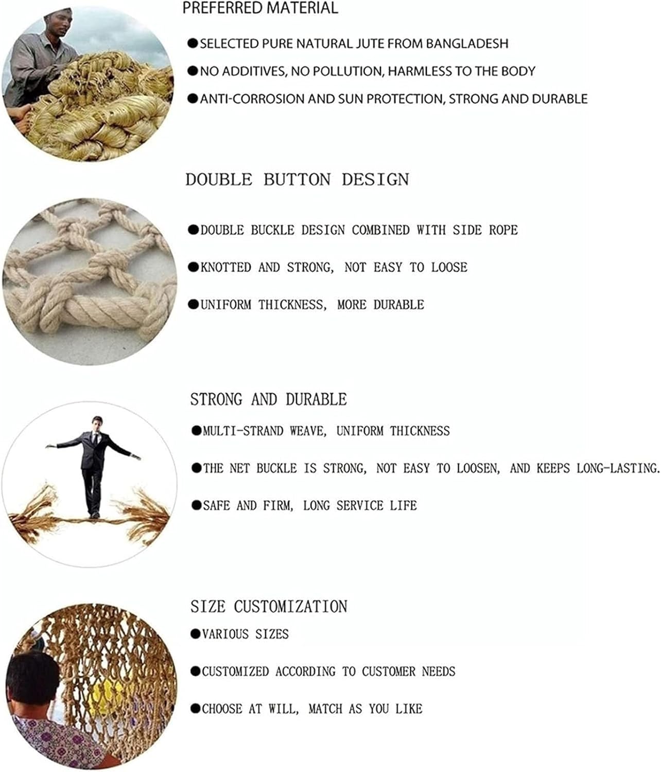 Personalizzata in base alle esigenze, la nostra corda di rete di sicurezza presenta un diametro di 8 mm con una distanza tra le maglie di 10 cm. Ideale per varie applicazioni, questa resistente cassaforte Presentazione della nostra rete in corda di canapa di alta qualità, realizzata in iuta di alta qualità per una maggiore durata ed ecologicità. Questa rete versatile presenta una robusta capacità portante ed è semplice da installare: basta appenderlo a un gancio o fissarlo con cinghie. Progettato per resistere al sole e alla pioggia, è perfetto sia per uso interno che esterno, aggiungendo un tocco di stile a vari ambienti. Sperimenta l'arte della nostra rete da pesca meticolosamente realizzata, progettata da un maestro tessitore con 20 anni di esperienza. Questa rete è caratterizzata da un modello a maglia uniforme ottenuto attraverso tecniche tradizionali, garantendo durata e affidabilità. Ogni nodo è accuratamente fissato a mano, utilizzando un metodo unico che migliora la forza, rendendo questa rete da pesca una scelta affidabile per tutte le vostre esigenze di pesca. Applicazione multifunzionale: decorare una rete di sicurezza non solo può creare una barriera di sicurezza, ma anche creare una forte atmosfera retrò per te e creare un ambiente domestico caldo. Può essere utilizzato come soffitto in varie scene, nonché per la decorazione della parete, reti di corda da arrampicata, pareti divisorie interne o ganci, amache e altri scopi. Artigianato ingegnoso: un maestro con 20 anni di esperienza nella tessitura tesse una rete utilizzando tecniche tradizionali, ottenendo una maglia uniforme. Fissaggio manuale puro, utilizzando un metodo unico di annodatura tra la rete per ottenere non cadere mai.