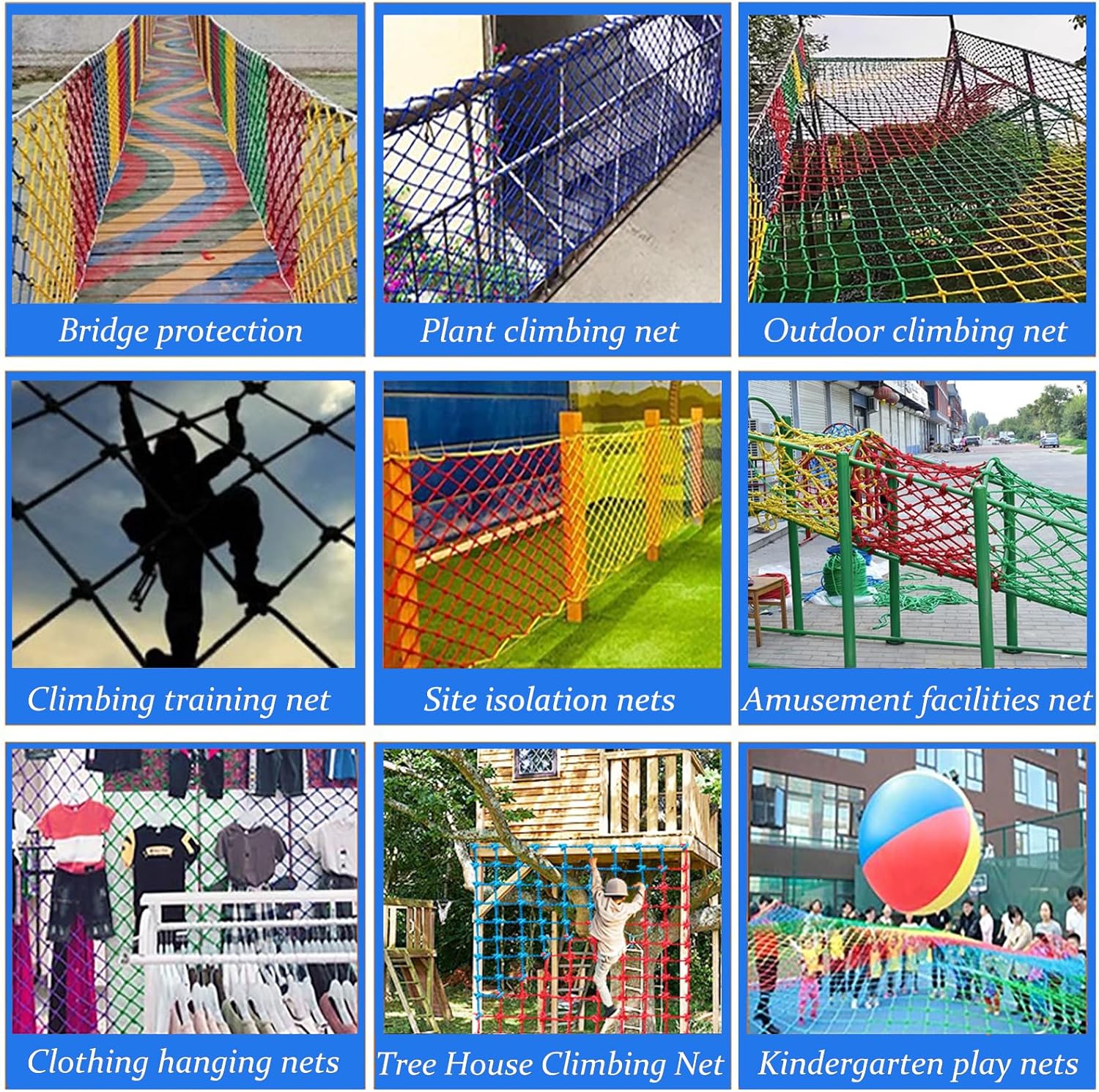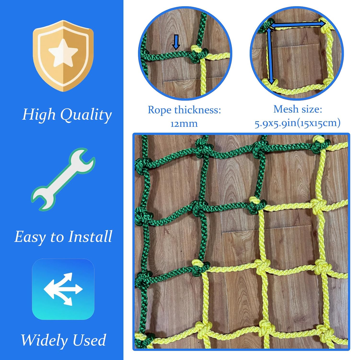 specifiche a rete: offriamo una varietà di dimensioni per soddisfare le tue diverse esigenze. questa rete di arrampicata interna ed esterna può supportare oltre 650 libbre. la rete di arrampicata pesante ha un diametro della corda di circa 0,47 pollici (12 mm) e una dimensione della mesh di circa 5,9 x 5,9 pollici (15 x 15 cm). fibra di poliestere ad alta resistenza: questa rete di arrampicata è realizzata con fibra di poliestere di alta qualità, meticolosamente tessuta a mano per garantire la durata e la resistenza all'usura. uso versatile: questa rete da arrampicata è adatta a una varietà di strutture ricreative all'aperto, come altalene, pareti da arrampicata, case per alberi, attrezzature da gioco, ponti di corda, campi da gioco nel cortile e cornici da arrampicata. aiuta a sviluppare la forza, migliorare il coordinamento e l'equilibrio e migliorare la forza di volontà e l'idoneità fisica. colori vibranti: questa rete di arrampicata sul parco giochi è disponibile in quattro colori vibranti per ispirare i bambini a scalare e giocare all'aperto, aiutandoli a sviluppare l'idoneità fisica. facile installazione: la rete di corda è facile da installare e può essere collegata a varie apparecchiature di gioco per soddisfare le tue esigenze.