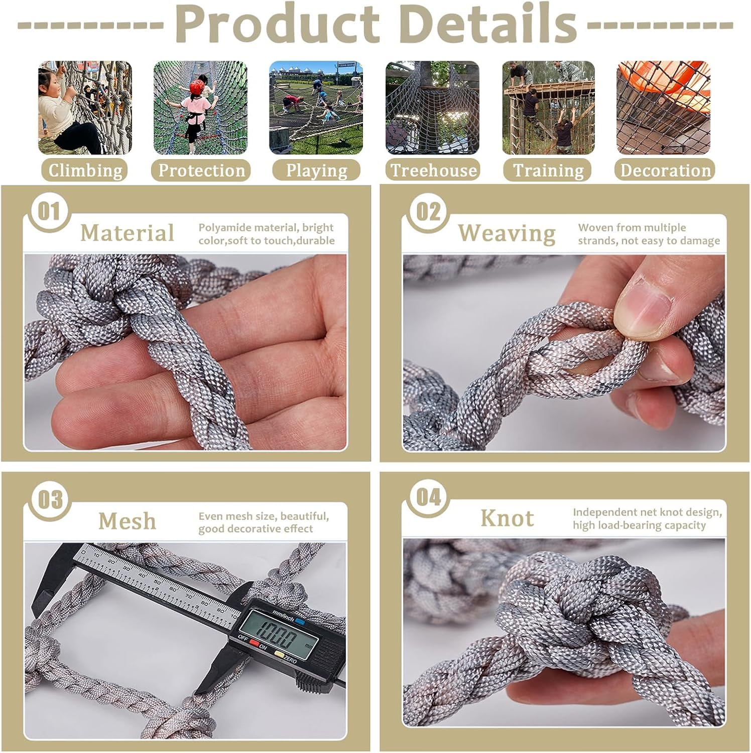 Rete in corda multiuso per arrampicata: questa robusta rete in corda è ideale per le impalcature del parco giochi e offre un'esperienza di arrampicata sicura per bambini e adulti. Promuove l'attività fisica e la coordinazione e può essere utilizzato in diverse aree esterne tra cui giardini e parchi. Incoraggia il gioco attivo con questo accessorio essenziale per l'arrampicata! Migliora le tue avventure con la nostra rete da arrampicata all'aperto con una spaziatura della griglia di 10 cm e un robusto diametro della corda di 12 mm. Disponibile in lunghezze da 1,0 a 4,0 metri e una larghezza di 1,0 metri, questa rete versatile è perfetta per bambini e adulti. Ideale per l'arrampicata, garantisce sicurezza e stabilità in tutte le tue attività outdoor. Personalizzazione: scegli tra diverse dimensioni di rete in corda tra cui spessore della corda, diametro della maglia e lunghezza*larghezza per soddisfare le tue esigenze specifiche. Questa robusta rete è ideale per attività all'aperto, arrampicata e aree gioco, offrendo versatilità e sicurezza per varie applicazioni. Perfetto per abbellire il vostro giardino o parco giochi. Nodi stabili della corda della rete da arrampicata: intrecciati a mano, con nodi più belli, più forti e più sicuri sulla connessione in rete, in modo da poter arrampicarsi meglio senza scivolare e godersi il divertimento dell'arrampicata. Personalizzazione: tutte le altre dimensioni della rete in corda, come spessore della corda, dimensione della maglia, lunghezza*larghezza, sono disponibili tra cui scegliere