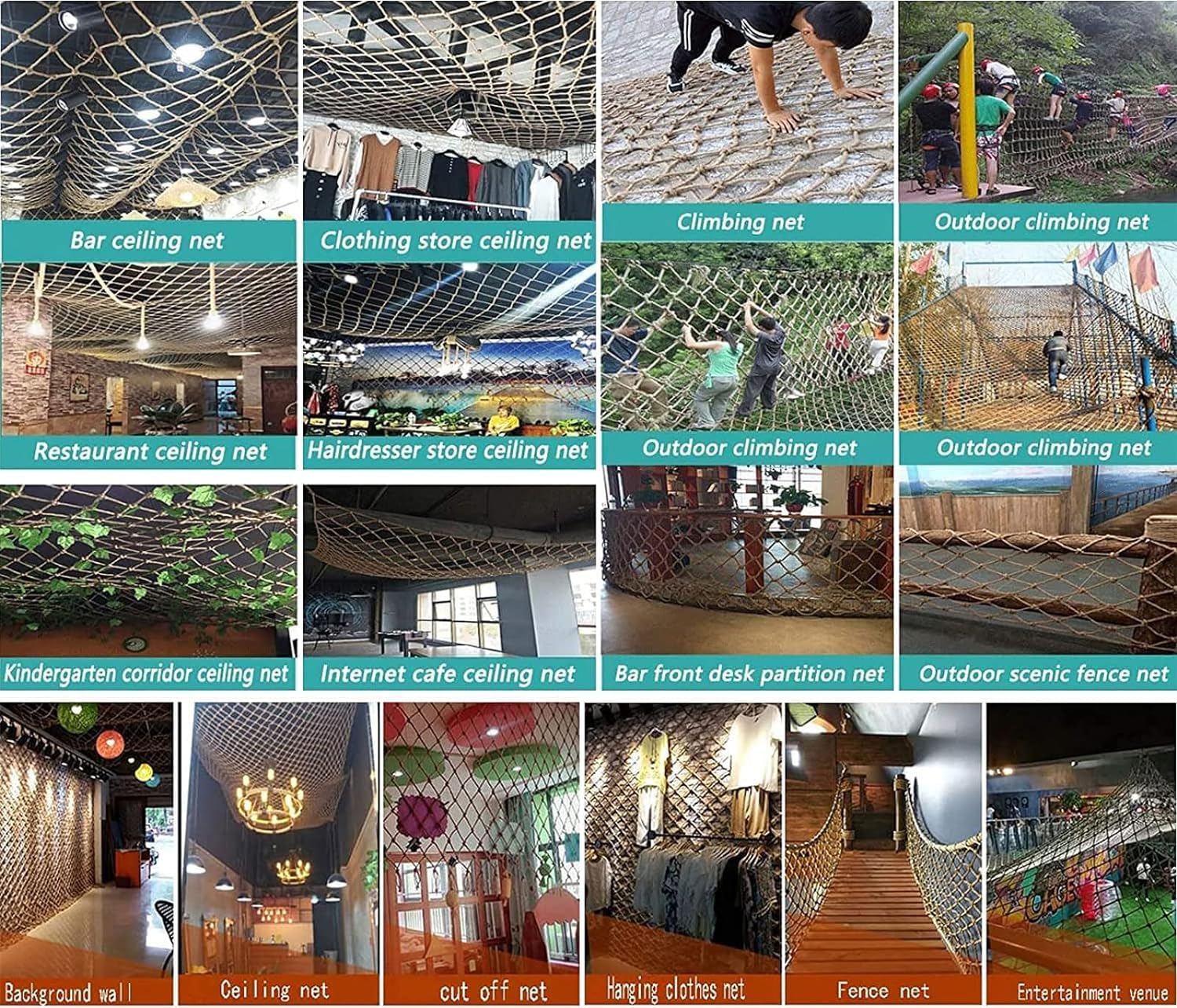 ★ 【Specifiche della rete in corda di canapa】 : Diametro della corda in canapa: 8 mm (0,31 pollici), Maglia della rete in corda: 10 cm (3,94 pollici); Abbiamo una varietà di dimensioni tra cui scegliere. Se hai bisogno di personalizzare la rete da carico da arrampicata di altre dimensioni e specifiche, contattaci via e-mail. ★ 【Materiale della rete di corda】 : La rete di sicurezza da arrampicata è realizzata a mano con corda di iuta di alta qualità. Ha un colore brillante, uno stress uniforme e non è facile cadere. È intrecciato a più fili, resistente agli agenti atmosferici e all'usura, rendendo la rete in corda più durevole. ★ 【Rete di protezione di sicurezza】: La rete di sicurezza è applicabile a balcone, corridoio, cortile, scuola, palestra, parco giochi e club sportivo, può impedire la caduta di oggetti e garantire la sicurezza di animali domestici e bambini. ★ 【Rete decorativa for interni o esterni】: for interni può essere utilizzata for bar, caffetterie decorative retrò, rete for soffitto, rete for pareti fotografiche, rete for vestiti, divisorio for stanza; L'esterno può essere utilizzato for asili nido, parchi divertimento, strutture pubbliche, recinzioni paesaggistiche, protezione di ponti sospesi, parchi tematici con reti di corda, reti di case sugli alberi e altri scopi. ★ 【Precauzioni】 : La rete di corda di canapa verrà trattata con olio di tung durante il processo di produzione for evitare che gli animali mordano e, allo stesso tempo, può migliorare la tenacità della corda di canapa, quindi avrà un leggero odore di olio.