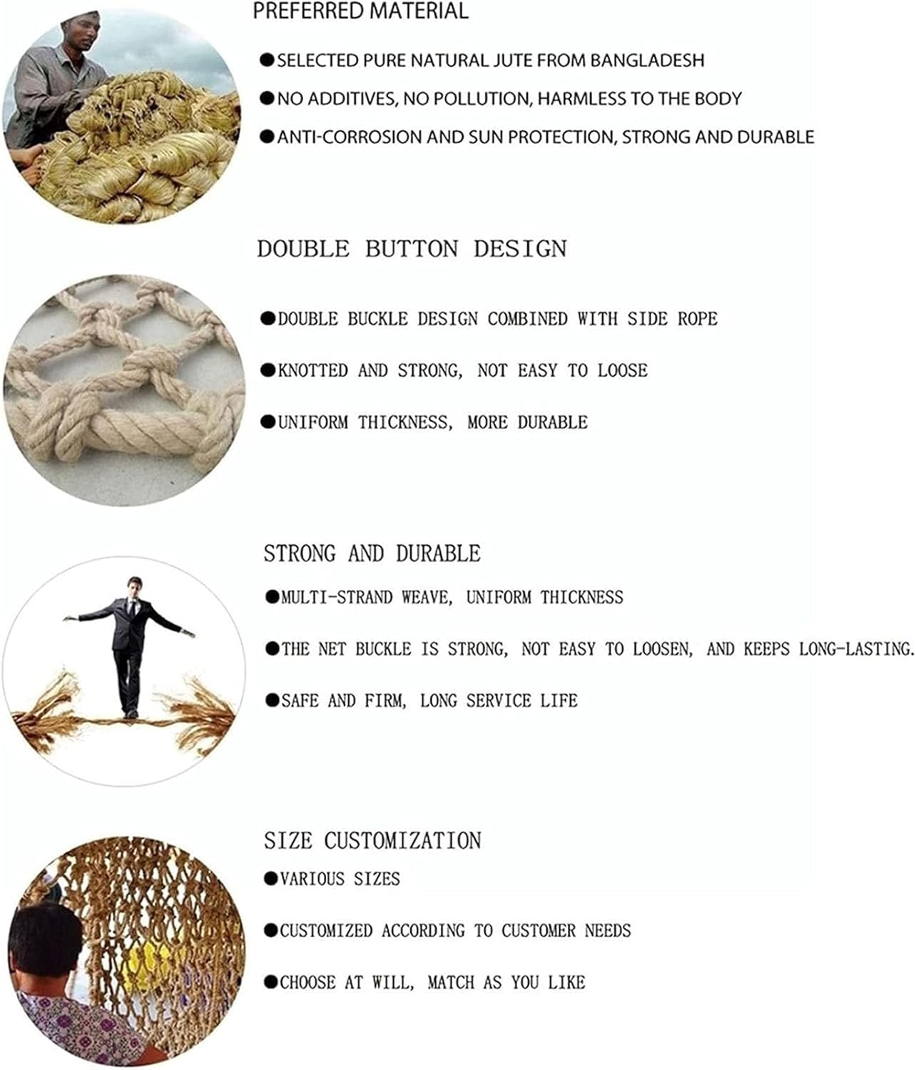 Rete di sicurezza su misura con un diametro del filo di 8 mm e una distanza tra le maglie di 10 cm. Questa rete protettiva è personalizzabile per soddisfare le vostre esigenze specifiche. Scegli la distanza e il colore della maglia preferiti per risultati ottimali. Per opzioni personalizzate, si prega di contattare via e-mail. Perfetto per varie applicazioni, garantendo sicurezza e funzionalità in qualsiasi ambiente. Migliora il tuo spazio esterno con la nostra rete ecologica in corda di canapa. Realizzata in iuta importata di alta qualità, questa rete resistente offre resistenza agli agenti atmosferici e colori vivaci. Perfetto per le decorazioni, presenta fibre lunghe facili da maneggiare e versatili per varie applicazioni. Ideale per decorazioni da giardino o come sfondo unico, combina funzionalità e fascino estetico. Scopri l'arte della nostra rete intrecciata a mano, realizzata da un abile artigiano con 20 anni di esperienza. Questa rete resistente offre qualità e resistenza costanti, garantendo un uso duraturo. Il design sicuro a doppia fibbia fornisce una maggiore sicurezza, prevenendo viaggi accidentali. Ideale per diverse applicazioni, questo prodotto combina l'artigianato tradizionale con la funzionalità moderna. Applicazione multifunzionale: la rete di sicurezza decorativa non solo può portare sicurezza ai tuoi bambini, ma anche creare una forte atmosfera retrò per te e creare un ambiente familiare caldo. Può essere utilizzato come soffitto di un Internet café, o come decorazione da parete, parete divisoria interna o come appendiabiti. Artigianato ingegnoso: un maestro con 20 anni di esperienza nella tessitura si intreccia in una rete attraverso l'artigianato tradizionale. La rete è uniforme e non facile da danneggiare. La fibbia è puramente fissata a mano e il design a doppia fibbia non inciamperà mai.