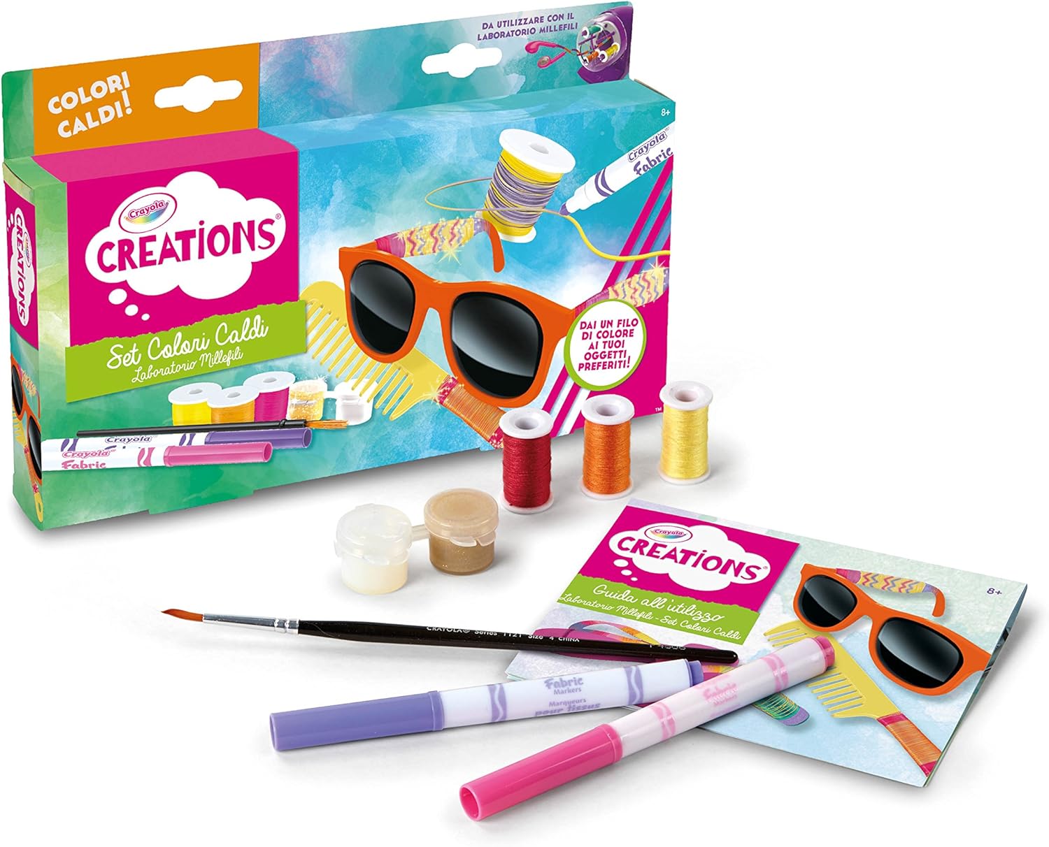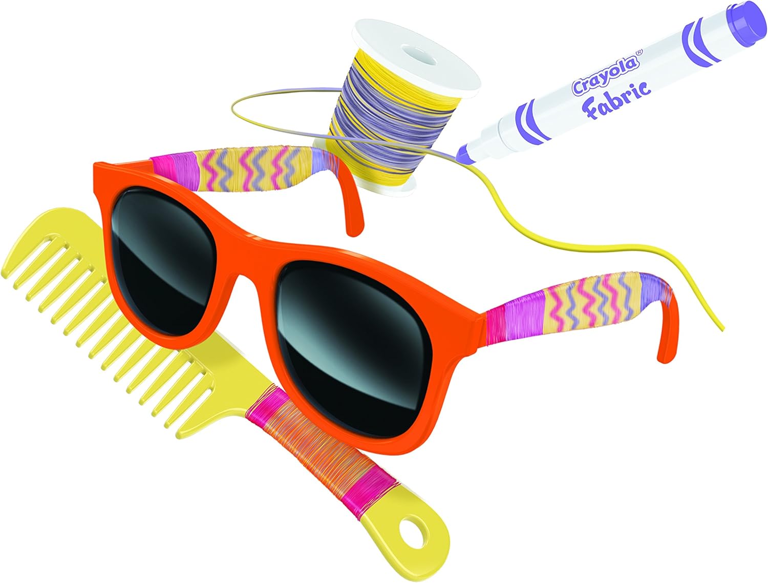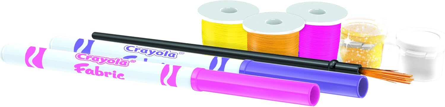 Viene fornito con 3 rocchetti di filo, 2 pennarelli per stoffa, 2 vernici, un pennello e una guida all'ispirazione Crayola Fornisce alle ragazze un modo semplice e divertente di personalizzare i loro accessori e gadget preferiti Avvolgi cuffie, braccialetti, penne, collane, occhiali da sole e altro ancora