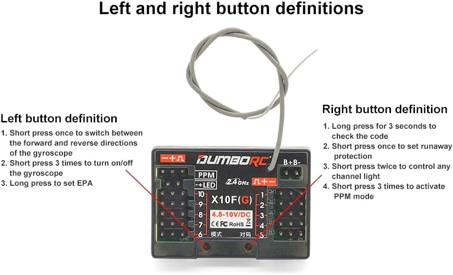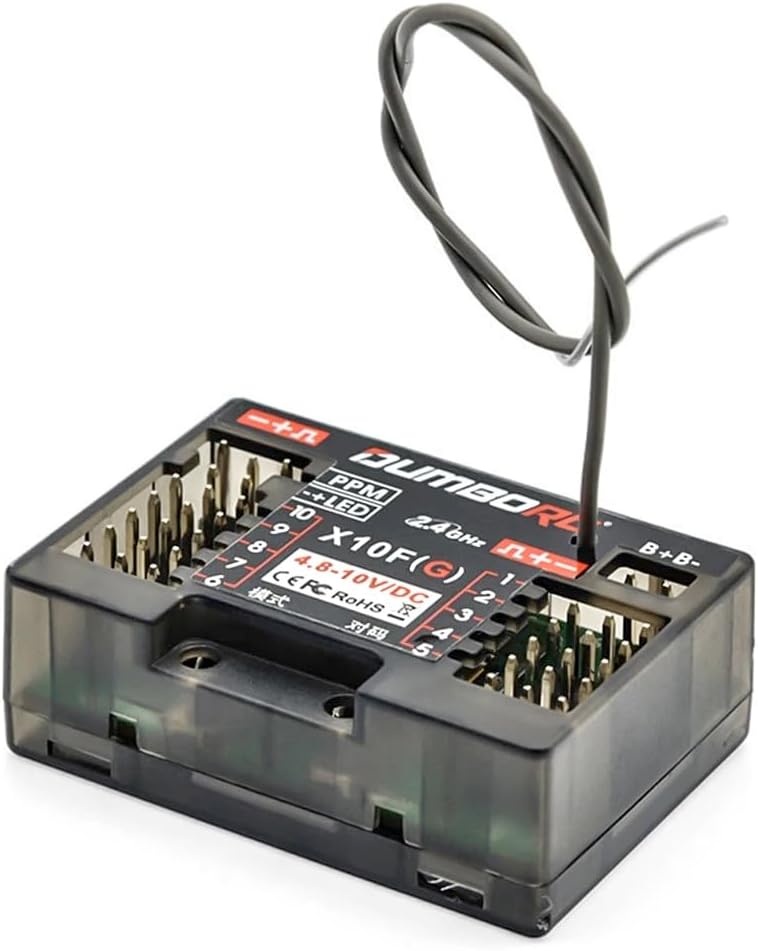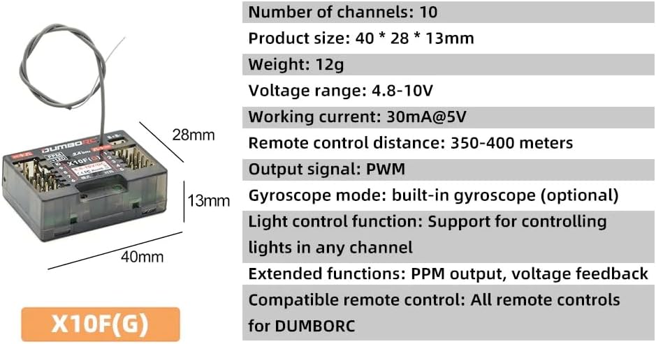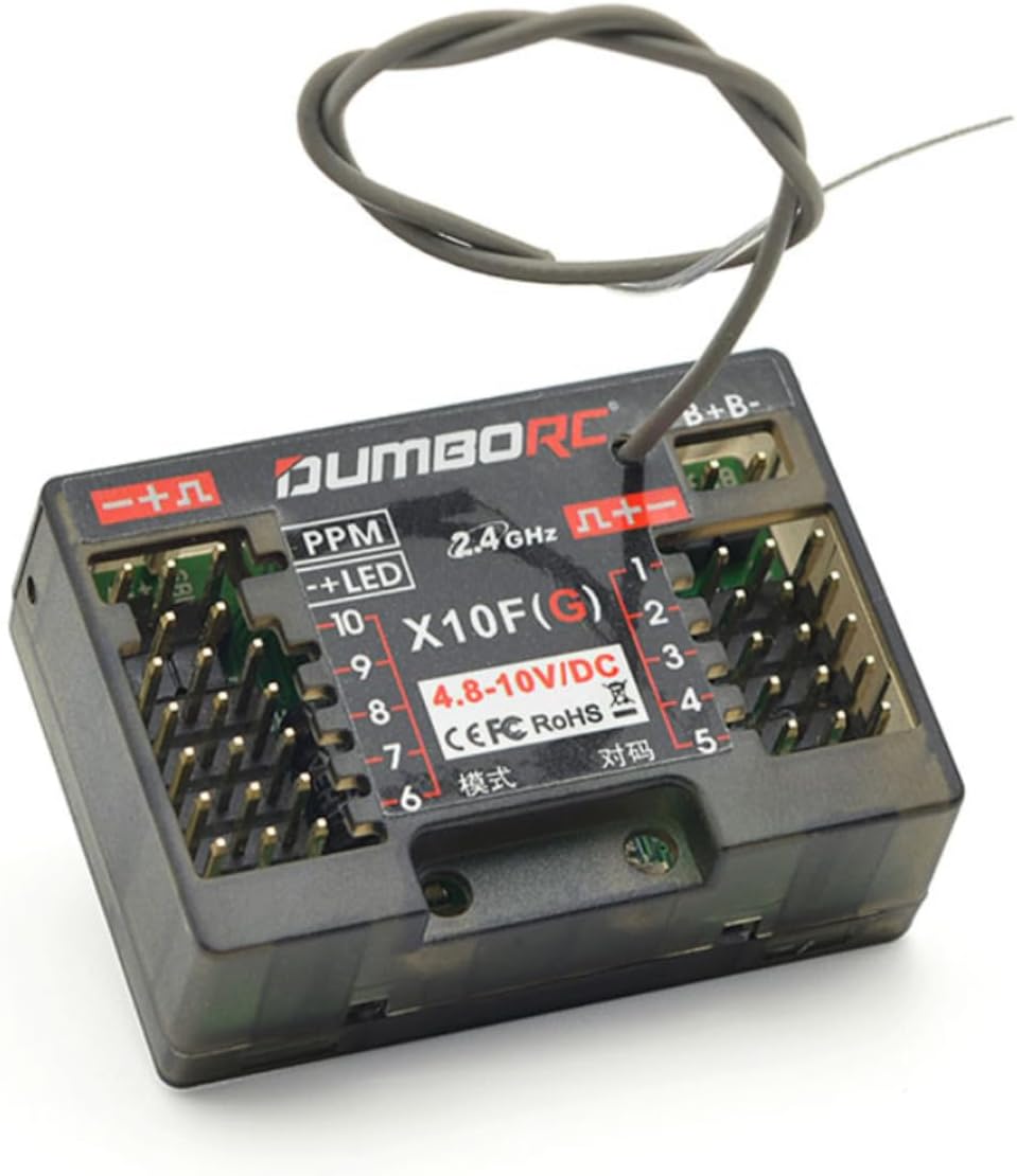 Eccellente anti-interferenza: con la nuova tecnologia di comunicazione, che rende X10FG con segnale stabile e un eccezionale raggio di controllo a terra di circa 350 m. Superba risposta rapida: rapporto di risoluzione elevato, uscita del segnale stabile per fornire una risposta rapida per tutti i canali. Conveniente, con freni e funzione di protezione a prova di guasto, adatto per auto, barche e carri armati RC Ritorno di tensione: dotato di un ricevitore di ritorno di tensione (opzionale), supporta il ritorno della tensione della batteria del veicolo, Intervallo di tensione del ricevitore: 4,8-10 V, corrente operativa 30 mA, supporta il lavoro con servo giroscopio ad alta tensione Funzione giroscopica: integrata con la funzione giroscopio assicura che le auto vadano dritte. La LED Line può essere collegata direttamente al ricevitore. Buon lavoro con il trasmettitore RC DUMBORC X10P-350/ DDF-350