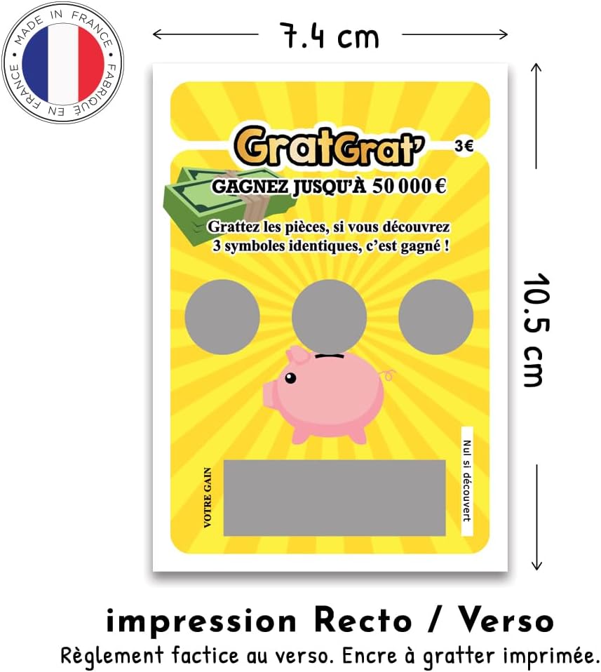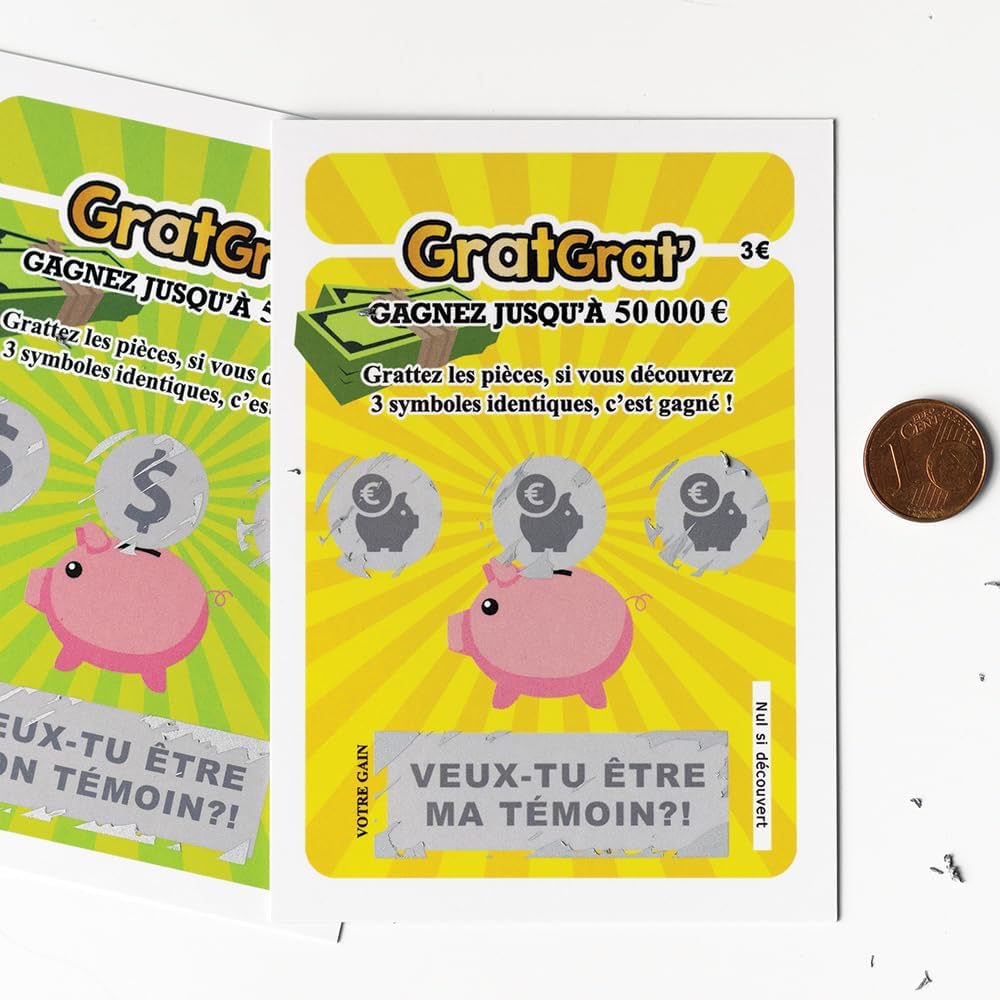 Originale idea regalo per realizzare la vostra richiesta di testimone, damigella, testimone. Gratta e vinci. Messaggio per scoprire "vuoi essere il mio testimone? Il mio testimone? Il mio testimone? La mia damigella d'onore?" (a tua scelta) non personalizzabile. Gioco gratta e vinci. Cartoncino, formato 10,5 x 7,4 cm, stampa offset HD (stampante professionale). Inchiostro antigraffio al lattice (stampato direttamente su file). Regole del ciuccio stampate sul retro per un maggiore realismo. Sistema di codici predisposto per differenziare i gratta e vinci: troverai dei riferimenti sul retro di ogni biglietto accanto al copyright (sopra il codice QR): “MY”: per il modello “mio testimone” (fondo verde) / “MA”: per il modello “mio testimone” (fondo giallo) / “GH”: per il modello “groomsman” (fondo verde) / “DH”: per il modello “damigella” (fondo giallo). Mimi grandit è una piccola azienda francese specializzata in prodotti originali per la gravidanza e l'annuncio del matrimonio. GratGrat è un marchio registrato presso l'INPI (n°4408902) di proprietà di Mimigrandit.