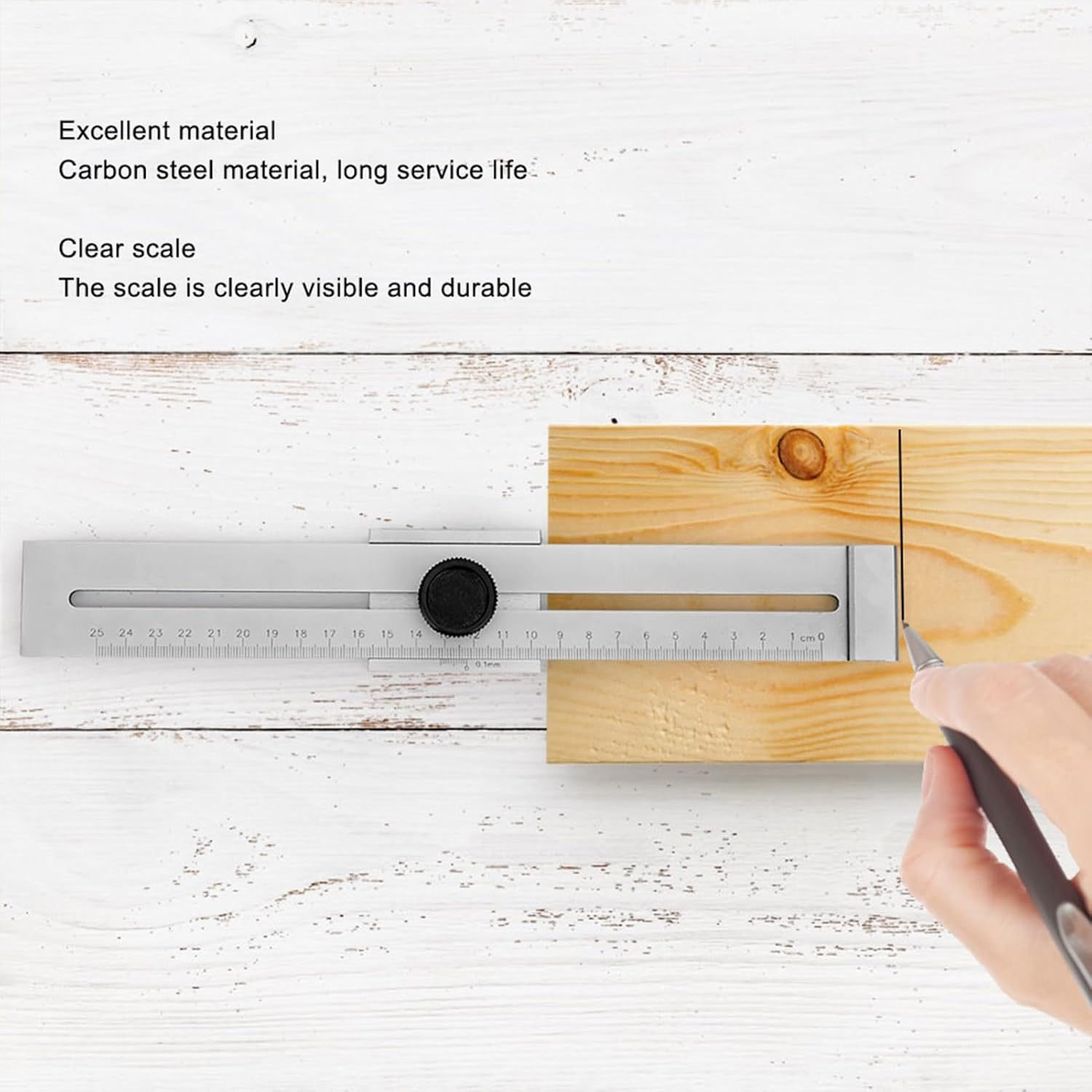 [Strumento di misurazione molto preciso] Dimensioni nell'intervallo di 0-250 mm e con una precisione di 0,1 mm. per progetti di lavorazione del legno. [Materiale in acciaio al carbonio] Realizzato in acciaio al carbonio, questo righello è costruito per durare e resistere a un uso intenso. [Marcatura leggera] Misurazione facile con il pulsante di regolazione rotante. Facile e comodo usare. [Scala chiaramente visibile] La scala è di supporto all'usura e chiaramente visibile, il che lo rende più facile usare. Dì addio a scuotere con piccole misurazioni [Strumento per la lavorazione del legno versatile] Affilatura precisa e progettato per progetti di lavorazione del legno. Un accessorio essenziale per ogni appassionato di legno.