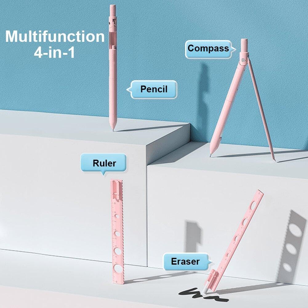 Questa cancelleria multifunzione 4 in 1 realizzata in plastica in lega ABS, durevole, affidabile, stabile nei cerchi di disegno, leggera e portatile. Un pratico set di compassi con righello compatto, perfetto per studenti o insegnanti da utilizzare in lezioni di geometria, lezioni di disegno, disegno di matematica, ecc. O per la progettazione architettonica, ingegneria edile. Kit multifunzionale: questa è una penna multifunzionale che combina matita, righello, gomma e bussola. Quattro utilizzi in una volta sola, di' addio alla noia. Le bussole sono dotate di un guscio in plastica a forma di penna, facile da trasportare e riporre, perfetto per la scuola, la casa, l'ufficio o il lavoro. Questo è l'ideale per coloro che non vogliono trasportare troppe cose. Questo set di cancelleria multifunzionale 4 in 1 è un must per gli studenti.