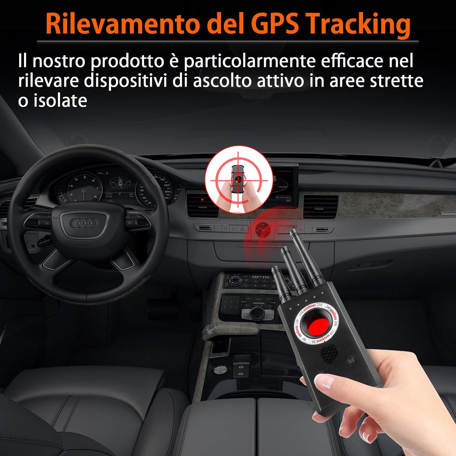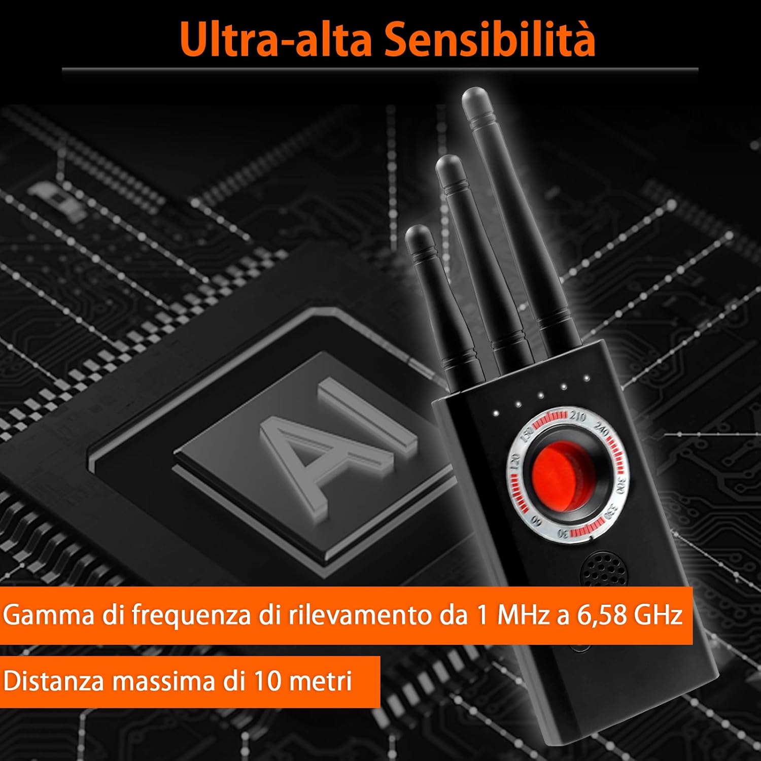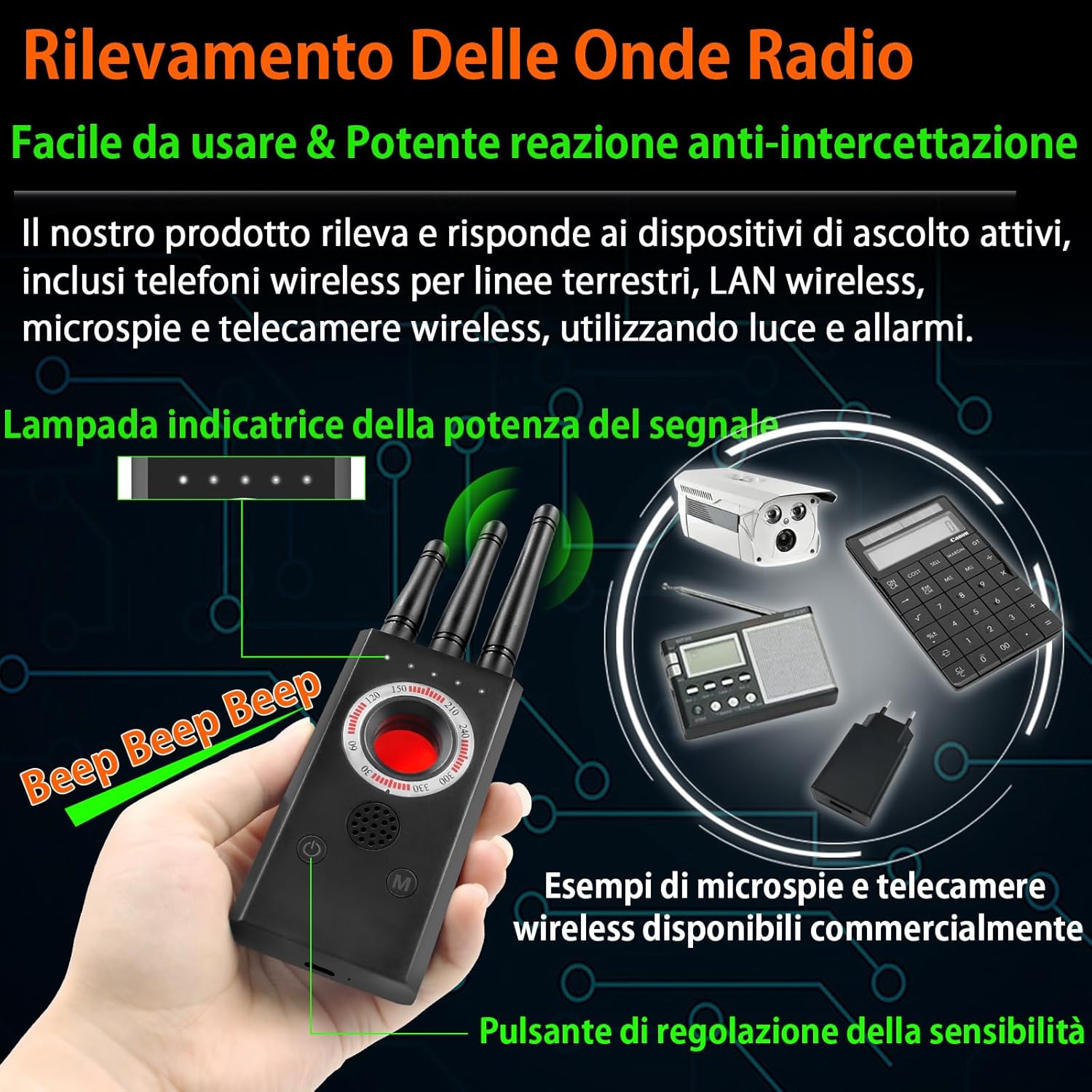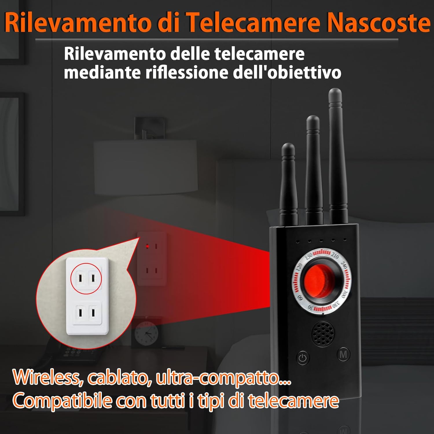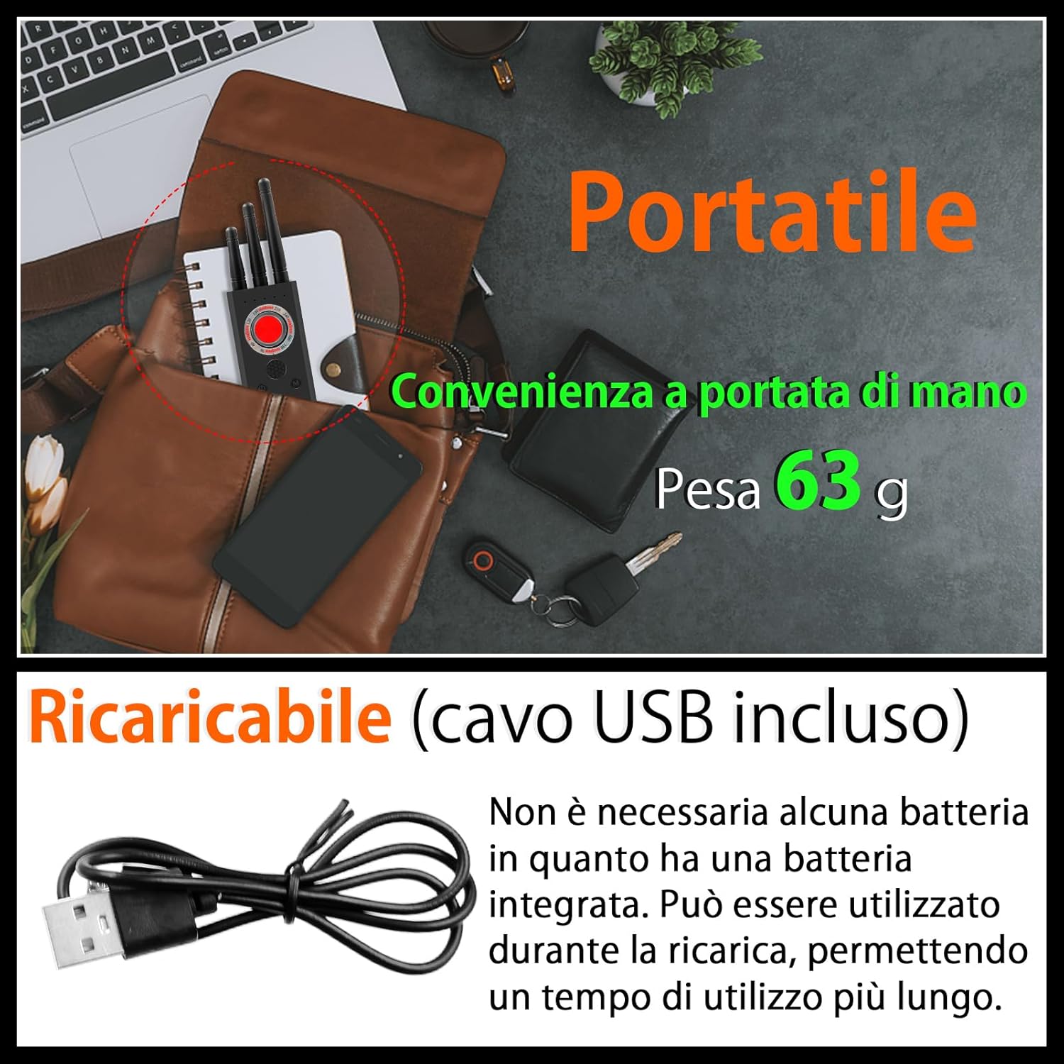 【Privacy e Sicurezza】Il rilevatore microspie garantisce la privacy e la sicurezza rilevando accuratamente intercettazioni telefoniche, intercettazioni telefoniche, intercettazioni di conferenze, localizzatori GPS per il posizionamento, intercettazioni automobilistiche, telecamere wireless con foro spia, telecamere cablate e altro ancora. Impedisce efficacemente le violazioni della privacy in varie location come case, hotel, camerini, camere da letto, bagni, uffici, sale conferenze e automobili. 【Mini Rilevatore Anti-spia】Questo rilevatore telecamere nascoste rileva segnali mobili (2G, 3G, 4G, 5G), telecamere nascoste wireless e dispositivi di intercettazione. Rileva segnali RF da 1MHz a 6.5GHz, con un chip intelligente di aggiornamento che fornisce elevate capacità di anti-interferenza e una precisa localizzazione della fonte del segnale. 【Portatile e Facile da Usare】Questo compatto rilevatore anti spia è piccolo (17cm * 5cm * 1.8cm) e leggero (63g), rendendolo altamente portatile. Dispone di un 2 pulsante per una facile operazione, e puoi passare tra diverse funzioni utilizzando il tasto "modalità". 【Multiuso】Questo rilevatore gps combina 3 funzioni. In primo luogo, rileva segnali RF, permettendo di identificare trasmettitori RF attivi come microspie audio wireless. In secondo luogo, include una Modalità di Raggi Infrarossi che utilizza la tecnologia di scansione laser a infrarossi per ispezionare visivamente e rilevare telecamere nascoste con foro spia. Infine, offre la Rilevazione del Campo Magnetico per identificare indesiderati tracker GPS magnetizzati. 【Durata Batteria Lunga e Affidabile】Il rilevatori microspie è dotato di una batteria integrata che offre fino a 5 ore di utilizzo continuo con una carica completa. Grazie alla sua lunga durata in standby, risolve i problemi di autonomia della batteria. Supporta la ricarica rapida, evitando la necessità di sostituire o caricare frequentemente la batteria. Questo garantisce un utilizzo senza interruzioni durante la ricerca di telecamere nascoste.