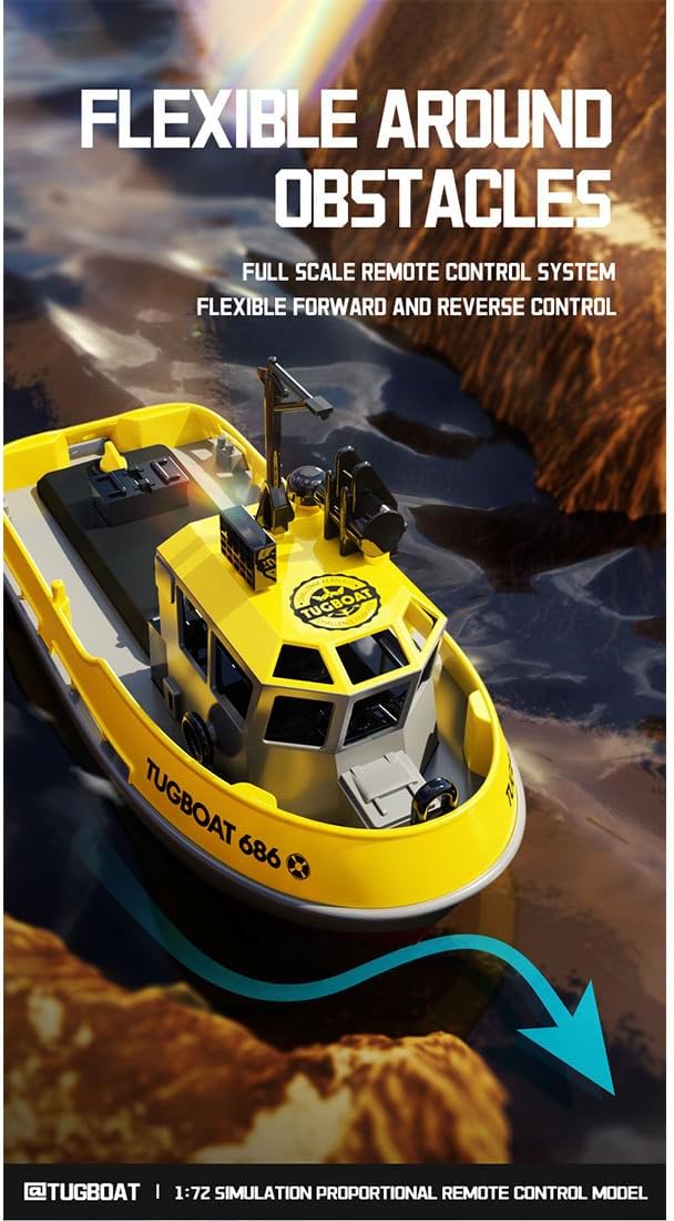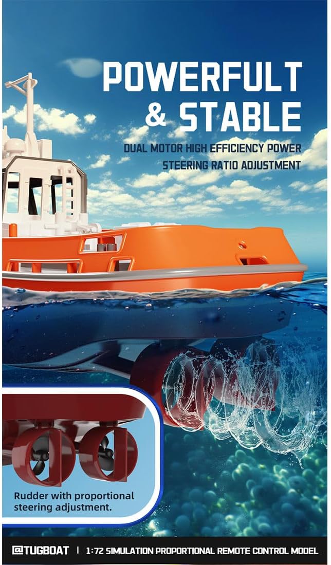 CONTROLLO AVANZATO: il sistema remoto wireless a 2,4 GHz offre una portata di 50 metri con funzionamento senza interferenze, anche con più barche che operano contemporaneamente ALTE PRESTAZIONI: il design della pompa turbogetto raggiunge velocità fino a 8 km/h, completato da sterzo regolabile e impostazioni flessibili di controllo della velocità SISTEMA DI BATTERIA: batteria al litio ricaricabile tramite USB con avvisi di bassa potenza, più sistema di raffreddamento ad acqua per una maggiore longevità del motore Design durevole: custodia impermeabile completamente sigillata con meccanismo a torsione e kit di protezione contro gli urti anteriori per una maggiore durata MODELLO IN SCALA: Rimorchiatore RC in scala 1:72 perfetto per avventure acquatiche all'aperto, con capacità di auto-raddrizzamento quando capovolto