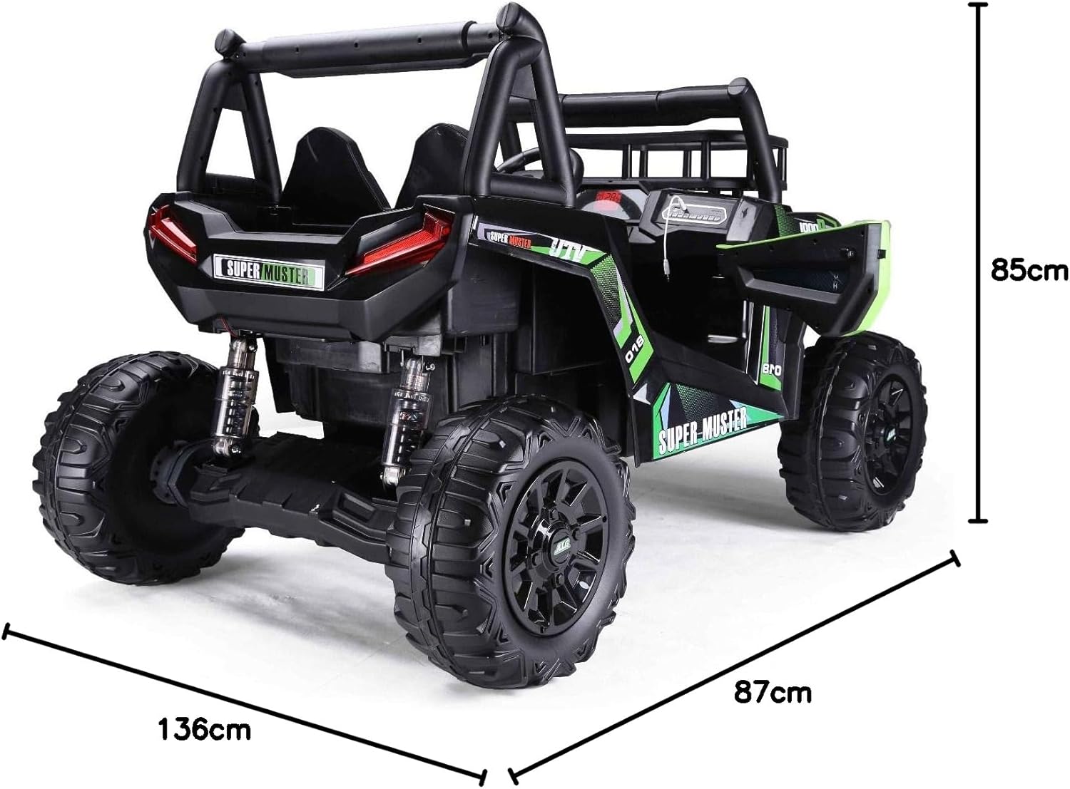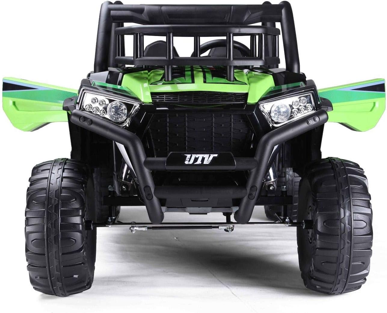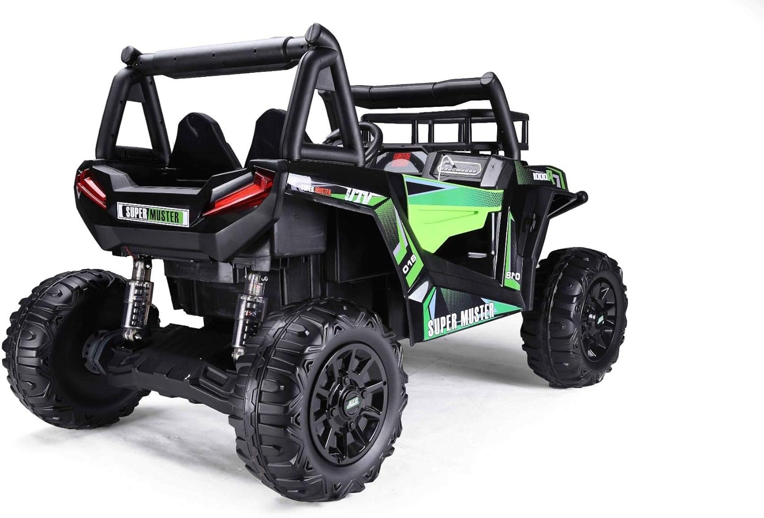 ✅【Avventura fuoristrada realistica】- Questo grande buggy elettrico per bambini UTV è dotato di una batteria al litio da 22 V, 2 vani portaoggetti, una capacità di carico testata di 100 kg e due motori da 200 watt con freni elettrici. Il veicolo elettrico colpisce per il suo design potente, materiali di alta qualità, due vani portaoggetti e porte funzionali. ✅【Adatto per 2 bambini】 – Due grandi sedili in pelle cucita rendono questo veicolo ideale per due bambini. Una cintura di sicurezza regolabile offre ulteriore sicurezza. Un'auto elettrica perfetta per i bambini con particolare attenzione al comfort e alla protezione. ✅【Veicolo elettrico robusto】- Le sospensioni su tutte le ruote, due motori da 24 V 200 W sulle ruote posteriori e 3 marce avanti e 1 retromarcia rendono questo veicolo ideale per terreni accidentati. Una potente auto elettrica per bambini a tutto tondo. ✅【Batteria al litio (22,2 V 4,5 Ah)】 - Lunga durata, potente, leggera e a ricarica rapida: esattamente ciò di cui ha bisogno una moderna auto elettrica per bambini. ✅ 【Nuovo telecomando da 2,4 GHz】 – Il telecomando Bluetooth da 2,4 GHz è saldamente accoppiato al veicolo e offre un controllo preciso con tre livelli di velocità e funzione di frenata di emergenza. Una soluzione innovativa per ogni veicolo elettrico per bambini. ✅【Caratteristiche di sicurezza】 - I pneumatici morbidi EVA garantiscono una guida silenziosa e sono particolarmente durevoli. Il sistema di sospensioni protette e l'accelerazione dolce rendono questo veicolo particolarmente adatto ai bambini piccoli. Un punto culminante tra i veicoli elettrici per bambini. ✅【Avvio fluido/Accelerazione uniforme】- Il controllo elettronico dell'accelerazione garantisce un avvio particolarmente fluido. Un'esperienza di guida confortevole per l'auto elettrica di ogni bambino.