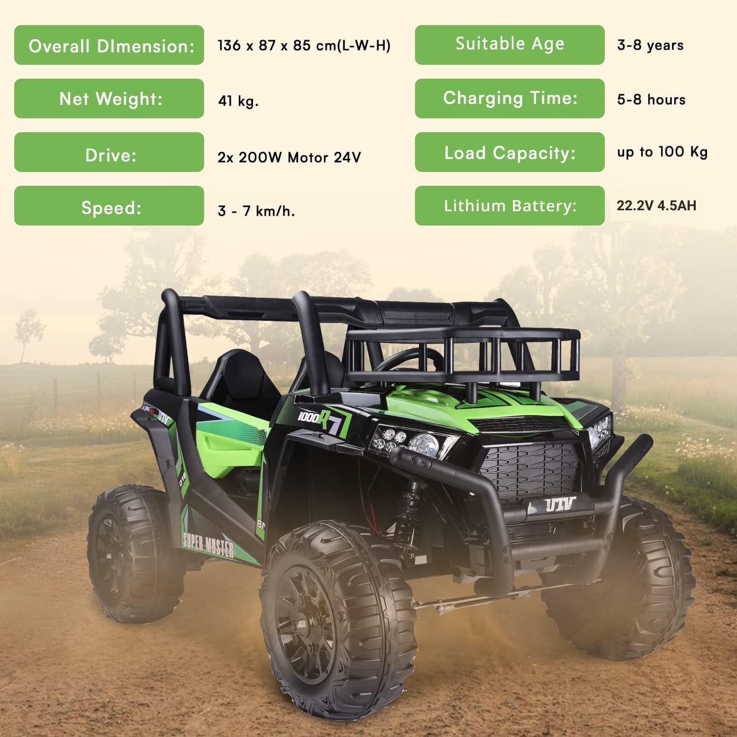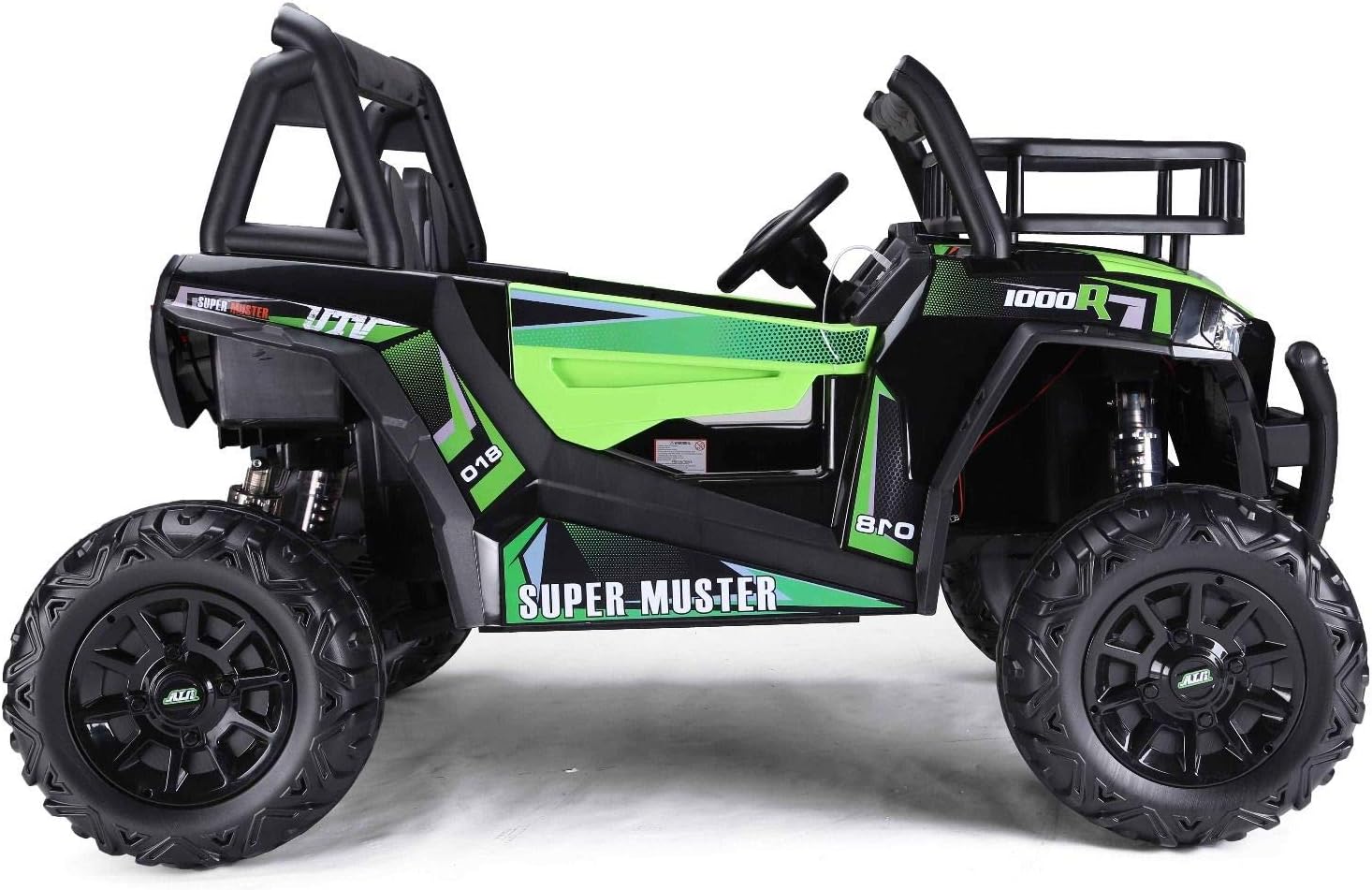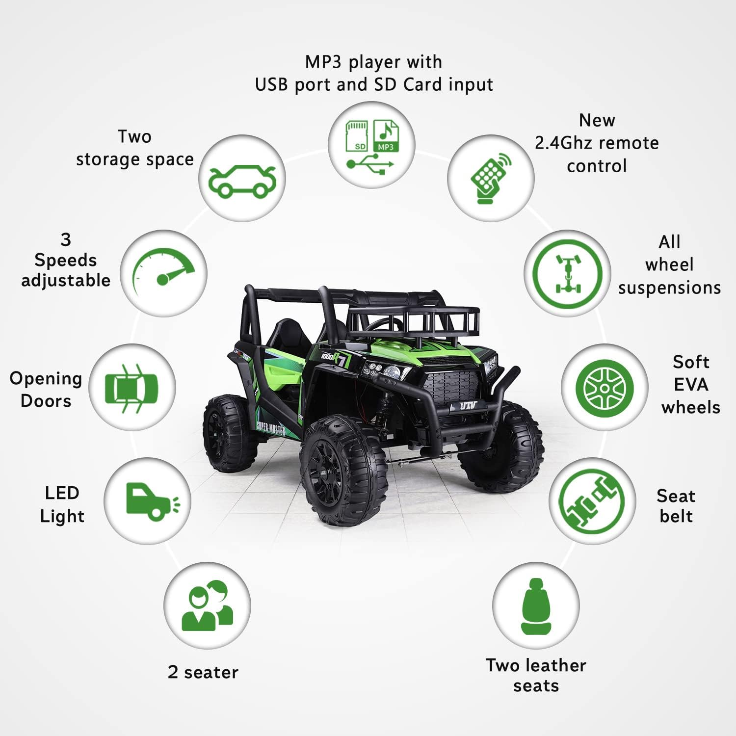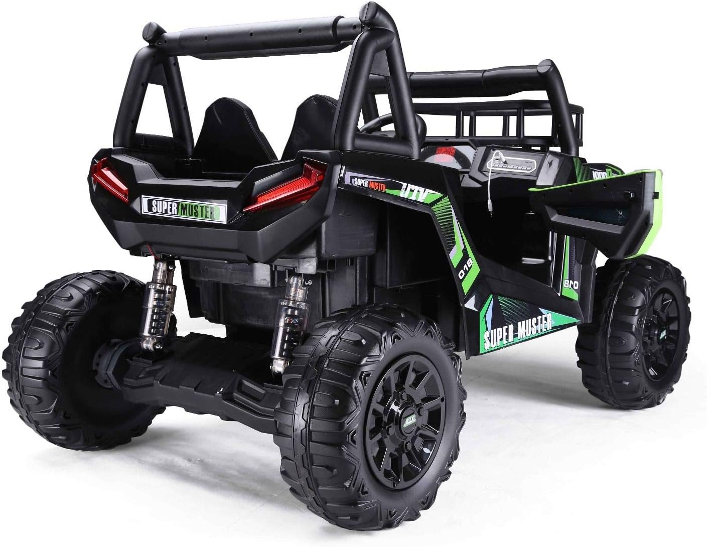 ✅【Avventura fuoristrada realistica】- Questo grande buggy elettrico per bambini UTV è dotato di una batteria al litio da 22 V, 2 vani portaoggetti, una capacità di carico testata di 100 kg e due motori da 200 watt con freni elettrici. Il veicolo elettrico colpisce per il suo design potente, materiali di alta qualità, due vani portaoggetti e porte funzionali. ✅【Adatto per 2 bambini】 – Due grandi sedili in pelle cucita rendono questo veicolo ideale per due bambini. Una cintura di sicurezza regolabile offre ulteriore sicurezza. Un'auto elettrica perfetta per i bambini con particolare attenzione al comfort e alla protezione. ✅【Veicolo elettrico robusto】- Le sospensioni su tutte le ruote, due motori da 24 V 200 W sulle ruote posteriori e 3 marce avanti e 1 retromarcia rendono questo veicolo ideale per terreni accidentati. Una potente auto elettrica per bambini a tutto tondo. ✅【Batteria al litio (22,2 V 4,5 Ah)】 - Lunga durata, potente, leggera e a ricarica rapida: esattamente ciò di cui ha bisogno una moderna auto elettrica per bambini. ✅ 【Nuovo telecomando da 2,4 GHz】 – Il telecomando Bluetooth da 2,4 GHz è saldamente accoppiato al veicolo e offre un controllo preciso con tre livelli di velocità e funzione di frenata di emergenza. Una soluzione innovativa per ogni veicolo elettrico per bambini. ✅【Caratteristiche di sicurezza】 - I pneumatici morbidi EVA garantiscono una guida silenziosa e sono particolarmente durevoli. Il sistema di sospensioni protette e l'accelerazione dolce rendono questo veicolo particolarmente adatto ai bambini piccoli. Un punto culminante tra i veicoli elettrici per bambini. ✅【Avvio fluido/Accelerazione uniforme】- Il controllo elettronico dell'accelerazione garantisce un avvio particolarmente fluido. Un'esperienza di guida confortevole per l'auto elettrica di ogni bambino.