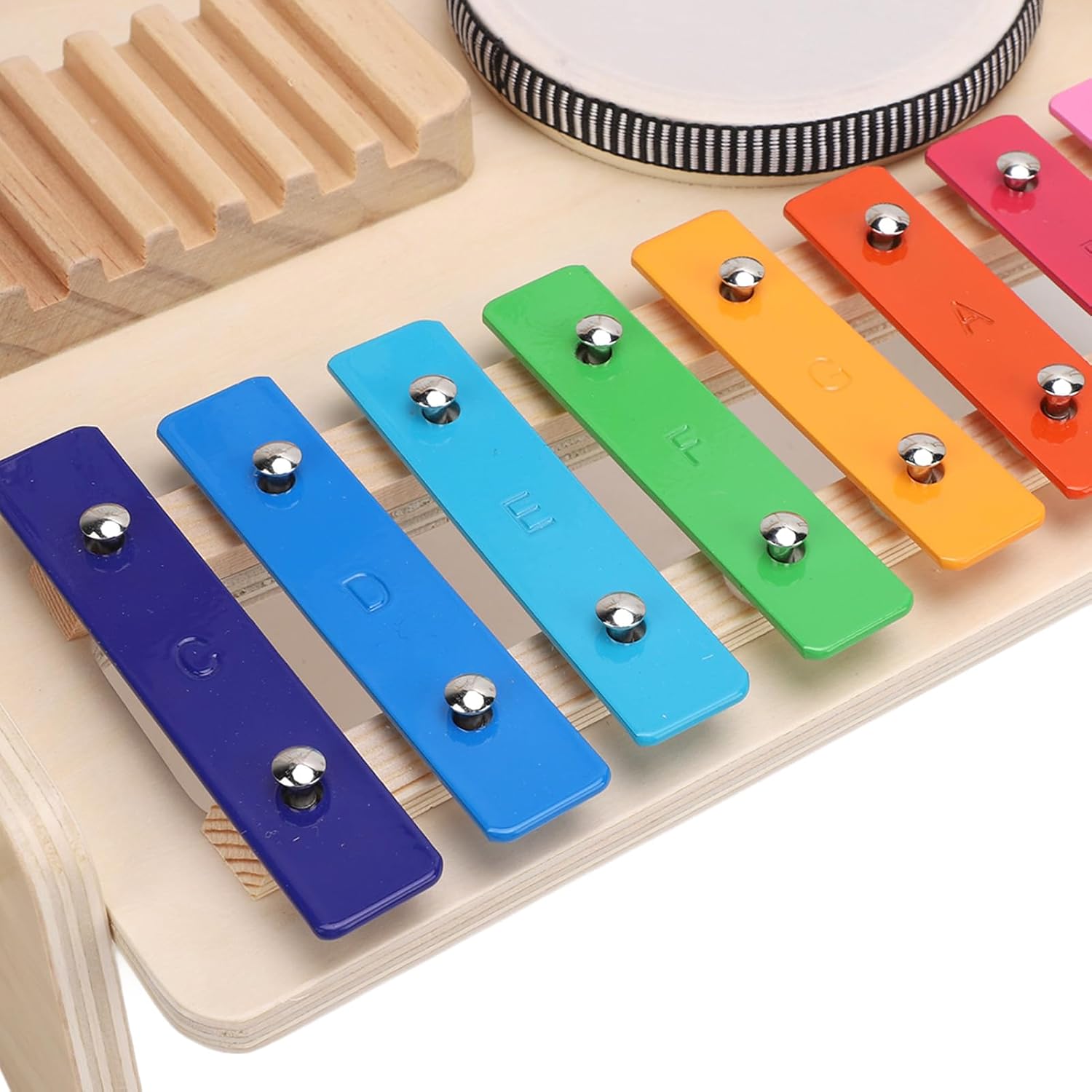 [SET DI STRUMENTI MUSICALI VERSATILI] Offri a tuo figlio un gioco interattivo con uno xilofono, un glockenspiel, un tamburo e un raschietto per un'ampia gamma di suoni. [FACILE MONTAGGIO] Design semplice dell'inserto con perni in legno per una comoda installazione e smontaggio, facilitando il montaggio. [COSTRUZIONE IN LEGNO PREMIUM] Realizzata in legno resistente per un uso duraturo, con bordi lucidi per sicurezza e resistenza agli urti. [MIGLIORA LE ABILITÀ MUSICALI] Promuove la sensibilità del tono e del ritmo, migliora la coordinazione occhio-mano e stimola l'interesse nell'esplorazione della musica. [XILOFONO PER PRINCIPIANTI] Presenta tasti accordati in ottava per un corretto allenamento musicale, dalle note C a C, creando un'esperienza di apprendimento divertente ed educativa.