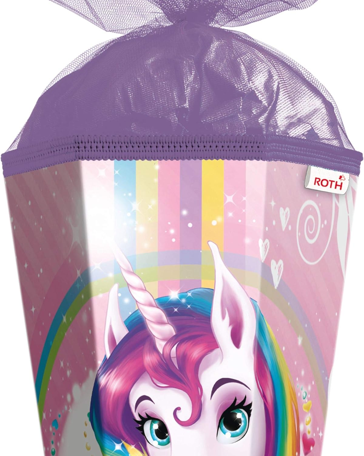 Cono scolastico con motivi di alta qualità con ritratto di unicorno per ragazze. Il cono scolastico con motivo è alto 85 cm e quadrato. Il bellissimo unicorno è circondato da teneri cuori, che sembrano fuori da un cerchio arcobaleno colorato. La chiusura è in tulle. Prodotto di qualità della ROTH in Sassonia