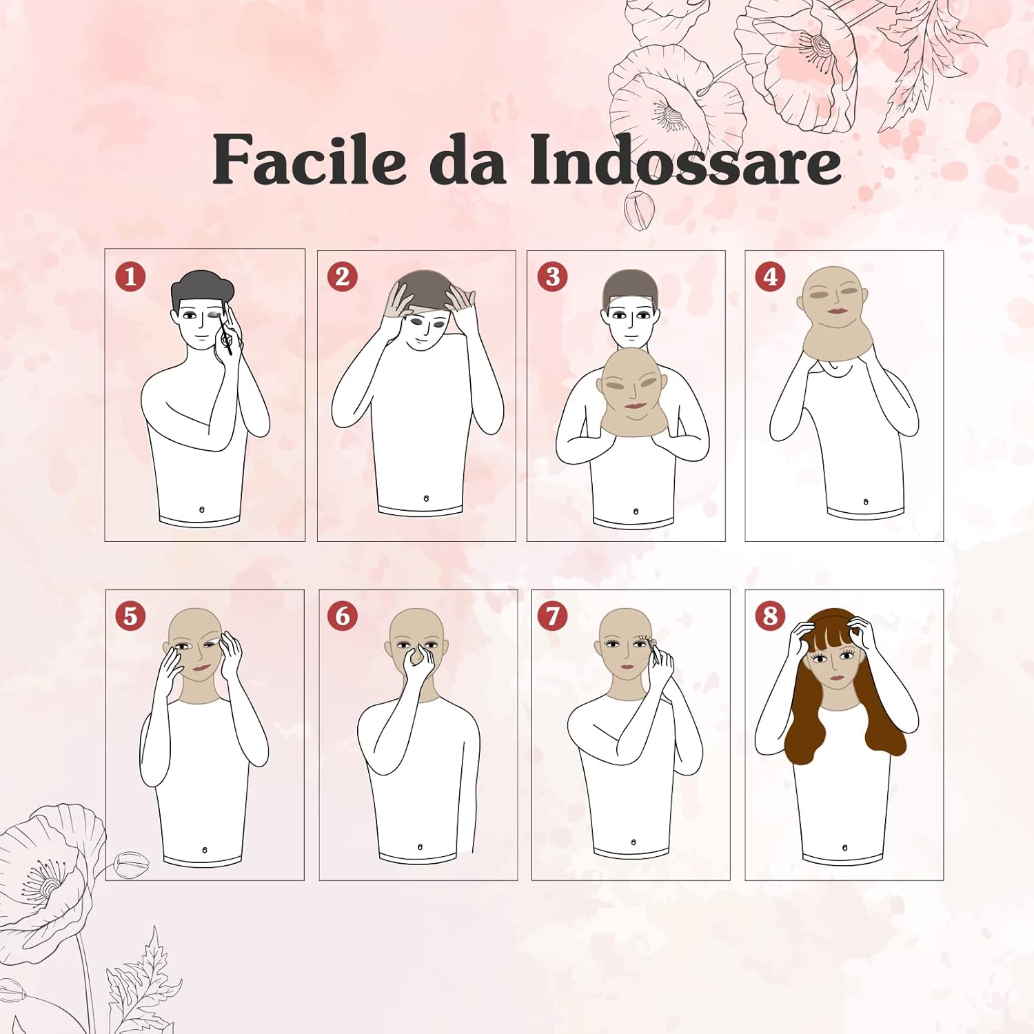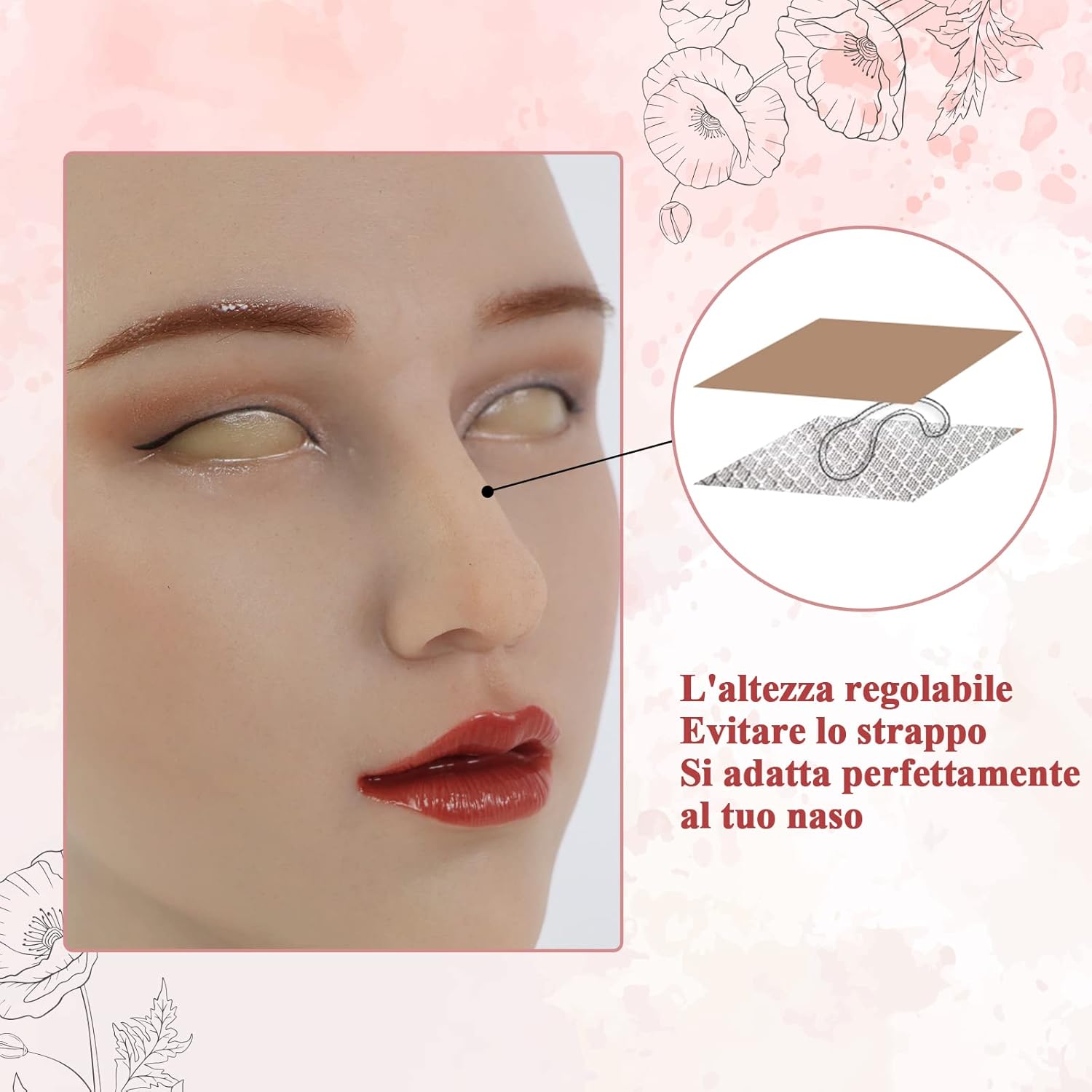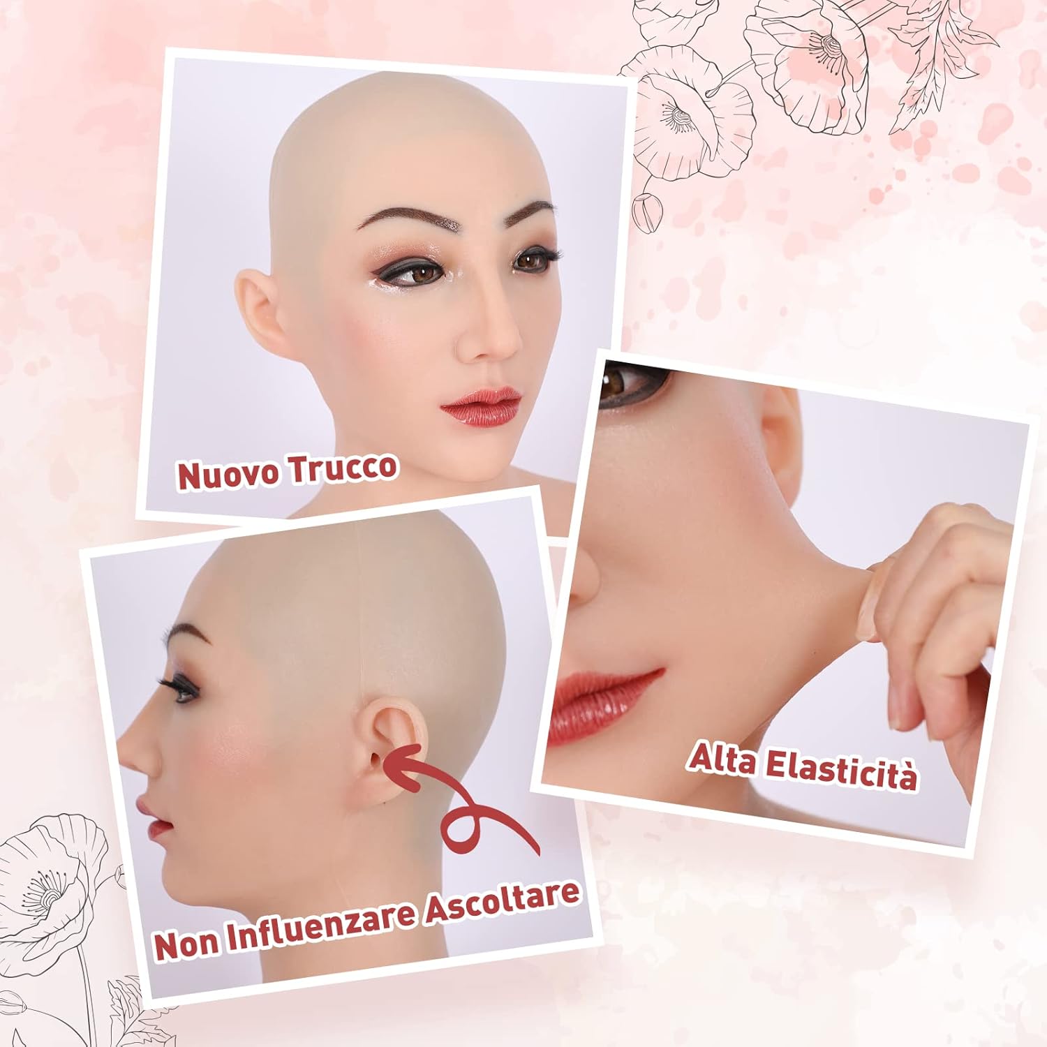 [Materiale]:Realizzato in silicone ad alta elasticità che si allunga molte volte.morbido e confortevole, nessun odore, non tossico. [Design Umano] La bocca può aprirsi per parlare, bere, fumare e mangiare. Ha un trucco permanente e leggero, puo anche applicare il trucco sulla maschera come preferisce. Innestiamo i capelli veri nella sopracciglia e Innesta l'osso nasale all'interno per modellare meglio e adattarsi alla forma del naso di chi lo indossa. E progettiamo il prodotto con un collo lungoed è utile per coprire il pomo d'Adamo. [Ampia applicazione]: Il circonferenza della testa è disponibile da 54 cm a 60 cm con una buona elasticità e regolabile. Transgender o crossdresser, per gli spettacoli di drag queen e per la mascherata. [Un’mballaggio squisito e privato] L'esclusiva scatola di imballaggio con il logo del marchio viene confezionata e trasportata privatamente per garantire che le informazioni del prodotto non puo essere trapelati e accompagniamo l'istruzioni per l'uso, per i clienti possono indossare il prodotto più velocemente e più correttamente. [Attenzione] Se non sei sicuro delle dimensione e della carnagione, consultaci prima di acquistare. causa della luce e del tempo di ripresa, la foto del stesso prodotto potrebbero avere un'aberrazione cromatica.Non include cappelli, parrucche, gioielli e vestiti.