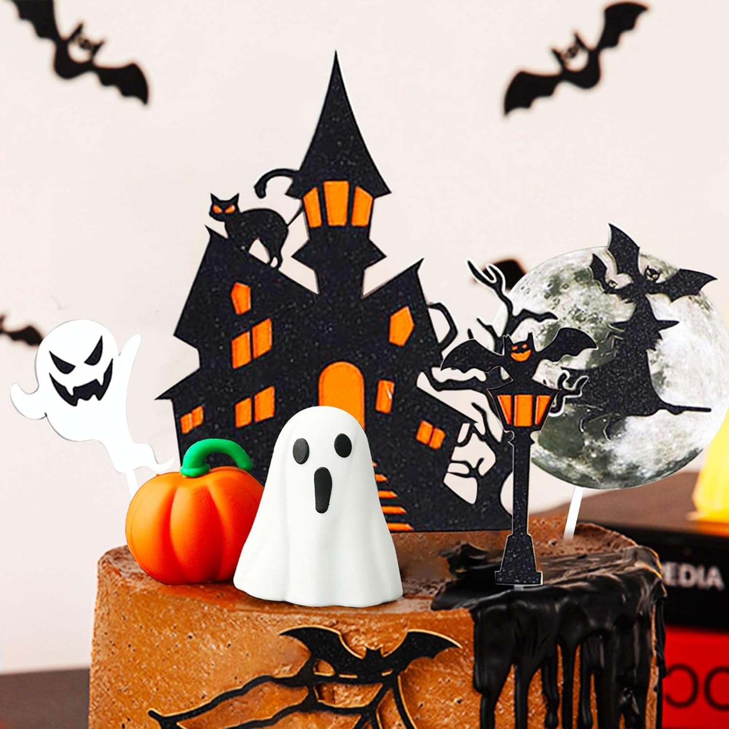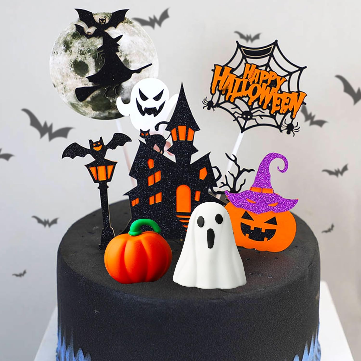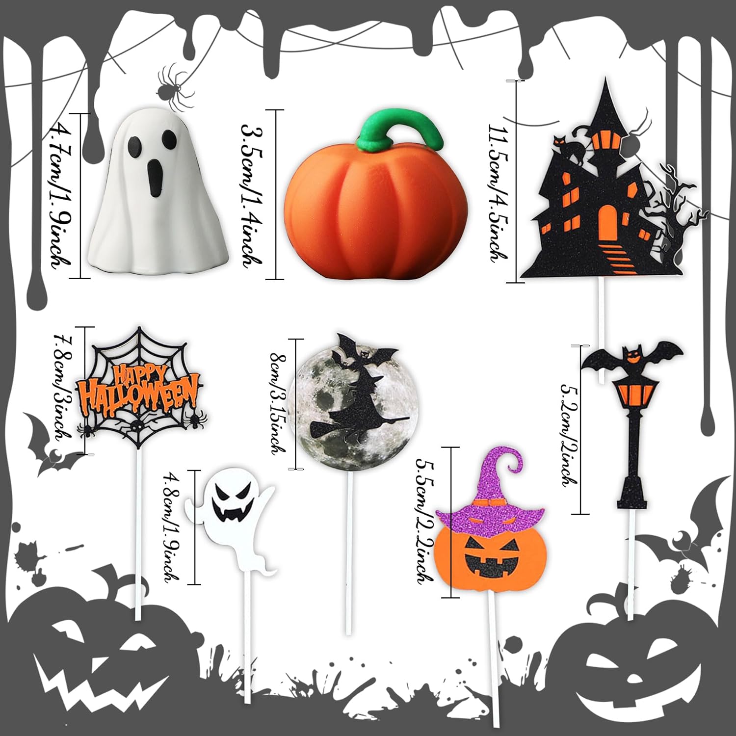 Il nostro set di decorazioni per torte di Halloween è la decorazione spettrale che stavi cercando e renderà felici tutti i piccoli mostri della tua vita. Usa queste graziose decorazioni di Halloween per rendere festoso Halloween. È ideale anche per le feste di Halloween in classe. Posiziona queste decorazioni in un piatto di caramelle o in un sacchetto per snack. La confezione include: 1 topper per torta fantasma, 1 topper per torta zucca, 1 topper per torta "Happy Halloween", 5 topper per torta di Halloween. Il topper per torta della casa stregata dai fantasmi è costituito da un cartoncino glitterato su un solo lato con un retro bianco attaccato a uno stecchino di legno. Le decorazioni per cupcake Fantasmi e BOO sono per la festa di Halloween.