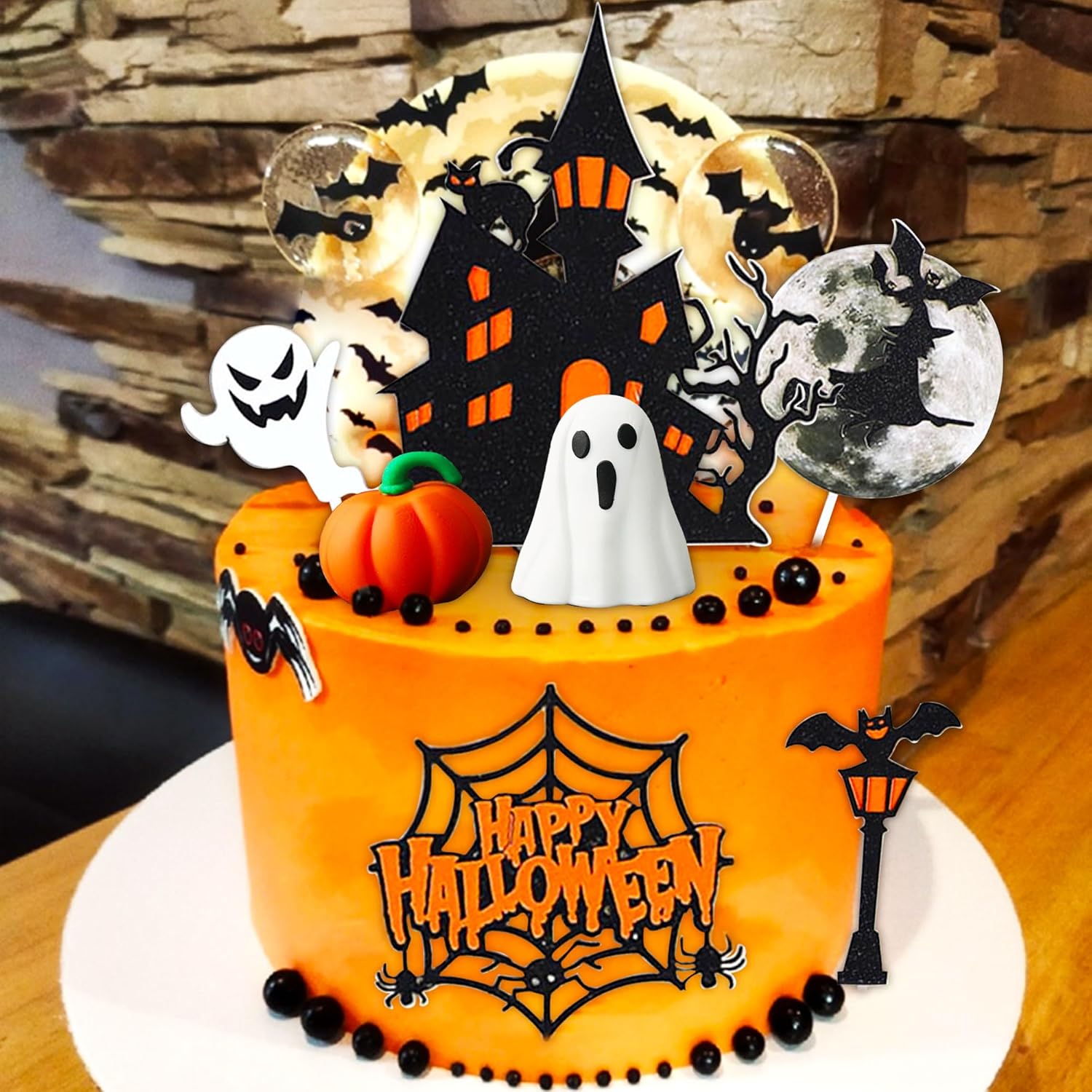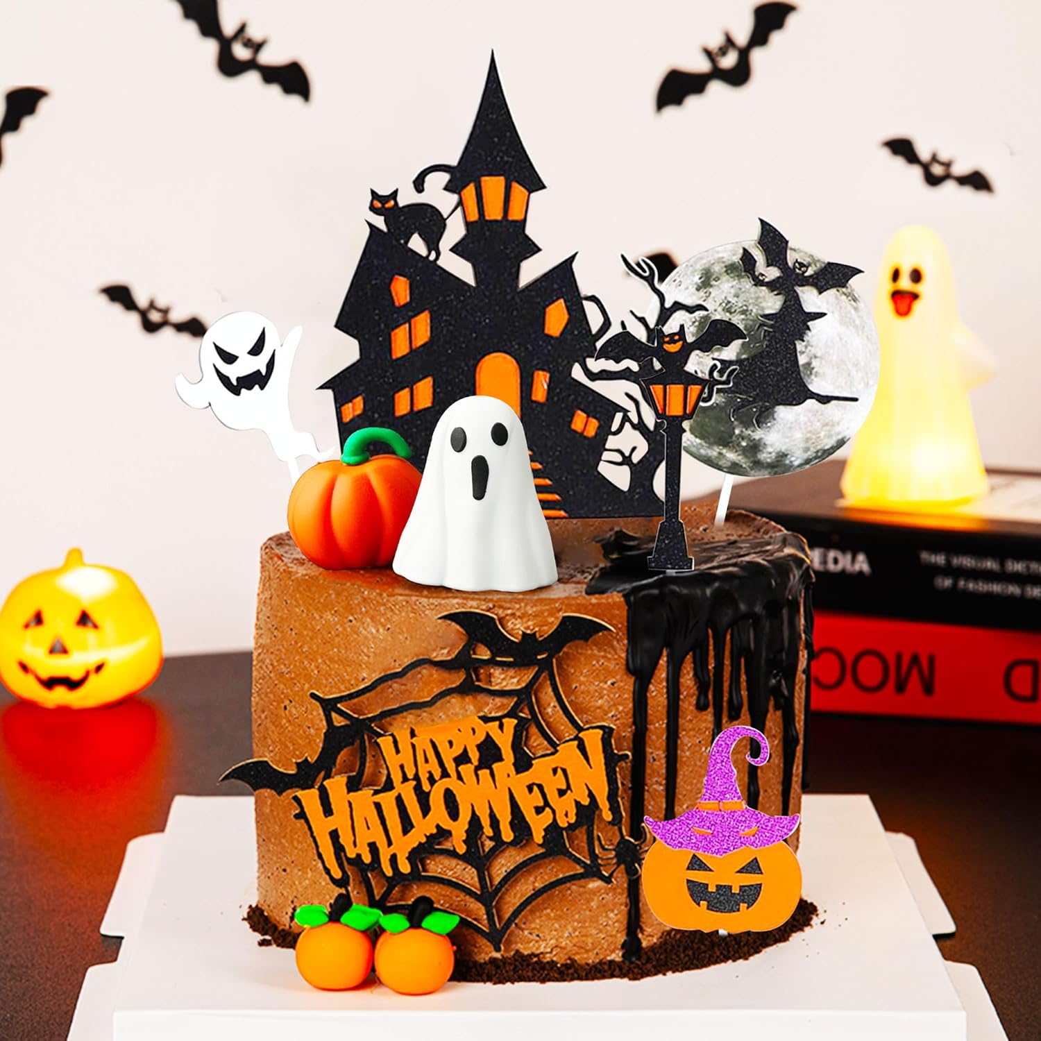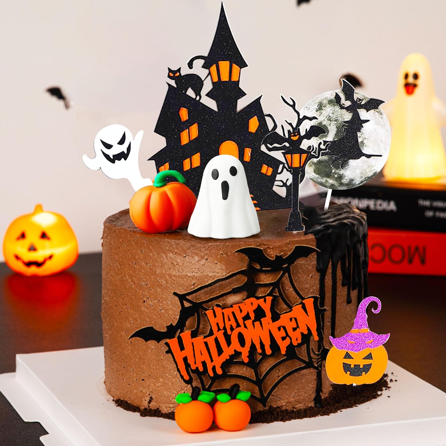 Il nostro set di decorazioni per torte di Halloween è la decorazione spettrale che stavi cercando e renderà felici tutti i piccoli mostri della tua vita. Usa queste graziose decorazioni di Halloween per rendere festoso Halloween. È ideale anche per le feste di Halloween in classe. Posiziona queste decorazioni in un piatto di caramelle o in un sacchetto per snack. La confezione include: 1 topper per torta fantasma, 1 topper per torta zucca, 1 topper per torta "Happy Halloween", 5 topper per torta di Halloween. Il topper per torta della casa stregata dai fantasmi è costituito da un cartoncino glitterato su un solo lato con un retro bianco attaccato a uno stecchino di legno. Le decorazioni per cupcake Fantasmi e BOO sono per la festa di Halloween.