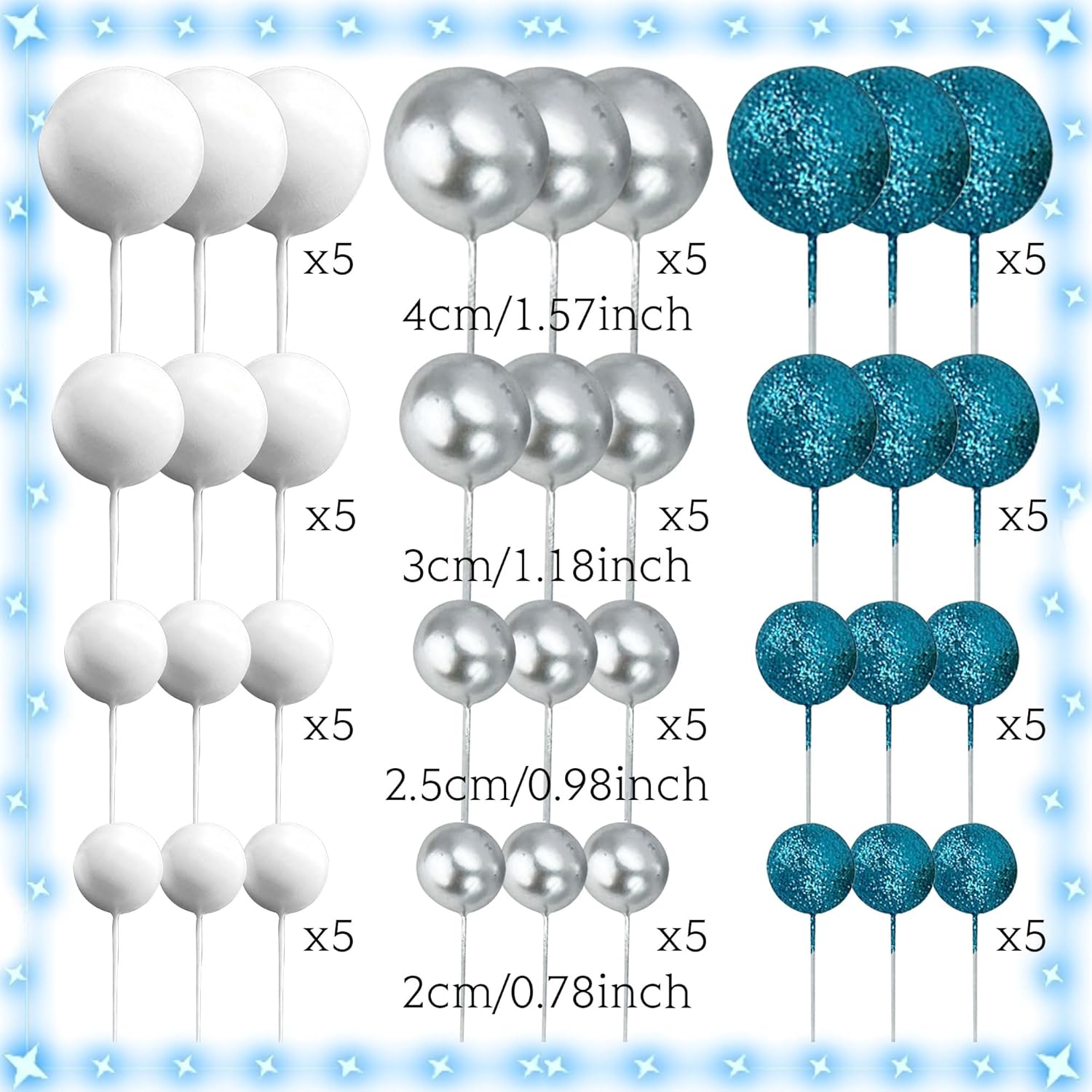 Il nostro set di decorazioni per torta in glassa ha tutto ciò di cui hai bisogno per rendere felice la giornata di oggi. Questo set di palloncini blu argento per la decorazione di torte è adatto per occasioni come compleanni, matrimoni, addio al nubilato e baby shower. Riceverai: 60 palline (decorazioni per torte con palline di colori e dimensioni misti) Le palline per decorare la torta sono bellissime e divertenti Se hai problemi, faccelo sapere