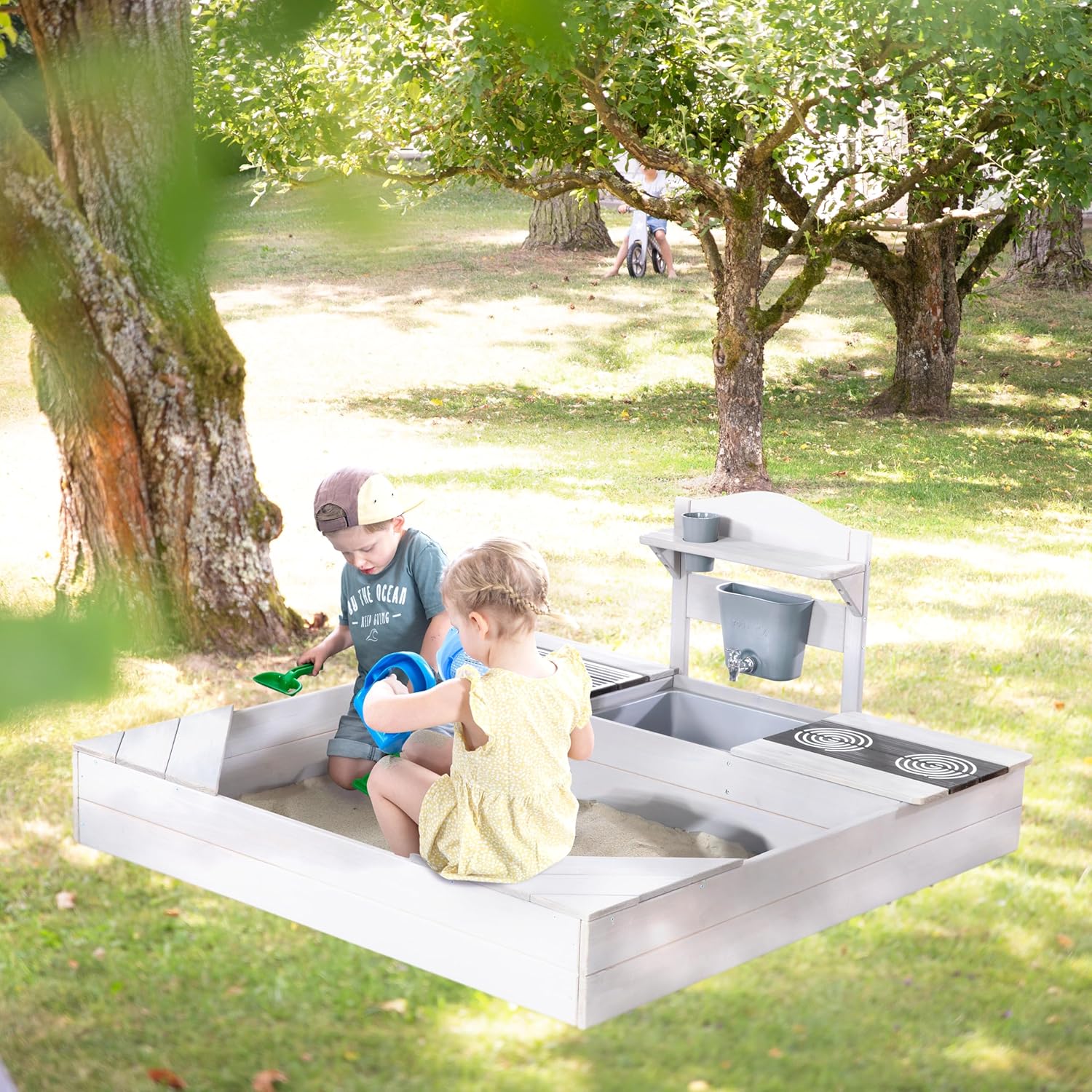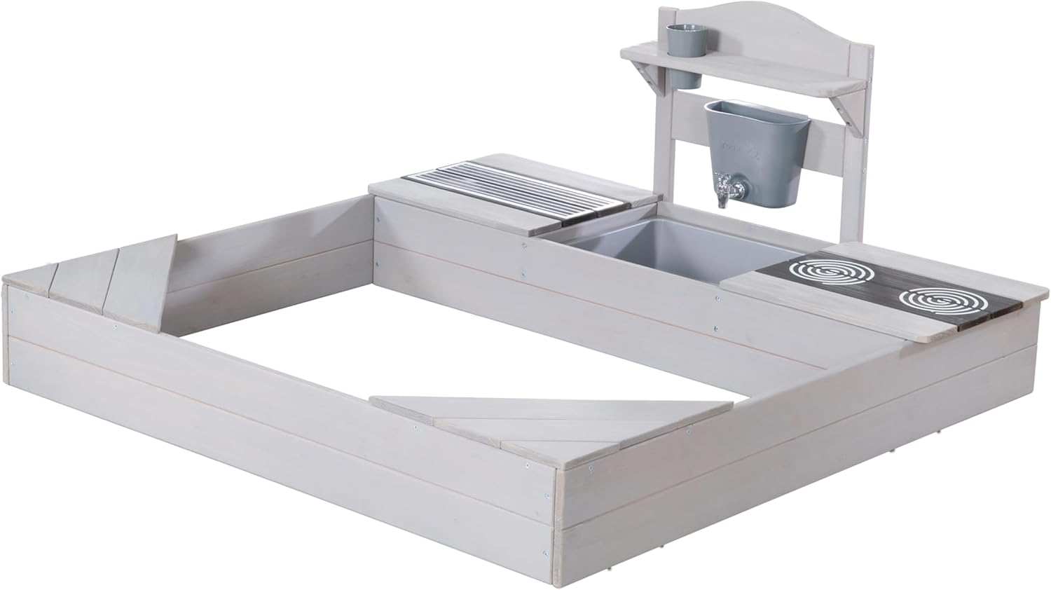 DIVERTIMENTO CREATIVO: La sabbiera in legno con cucina integrata, invita i bambini a sperimentare con acqua e sabbia, offrendo infinite possibilità di gioco in giardino o in balcone PIÙ SPAZIO: Due scomparti sotto le piastre del fornello consentono un'organizzazione ordinata dei giocattoli - La tazza e il contenitore per l'acqua inclusi, trovano il loro posto direttamente nella cucina giocattolo COSTRUZIONE STABILE E RESISTENTE: realizzata in legno massello di alta qualità, questa sabbiera è particolarmente robusta e resistente, ideale per lunghi momenti di divertimento all'aperto con amici e familiari COPERTURA INCLUSA: La copertura in tessuto inclusa nella confezione protegge la sabbiera dalle intemperie, consentendone un utilizzo prolungato e mantenendolo sempre protetto SPECIFICHE: Altezza 54 cm x Larghezza 113 cm x Profondità 113 cm (Altezza della barriera laterale: 18 cm) - Materiale di base: Legno massiccio grigio laccato - Materiale dell'accessorio: Plastica - Fascia d'età: Adatto da 12 mesi
