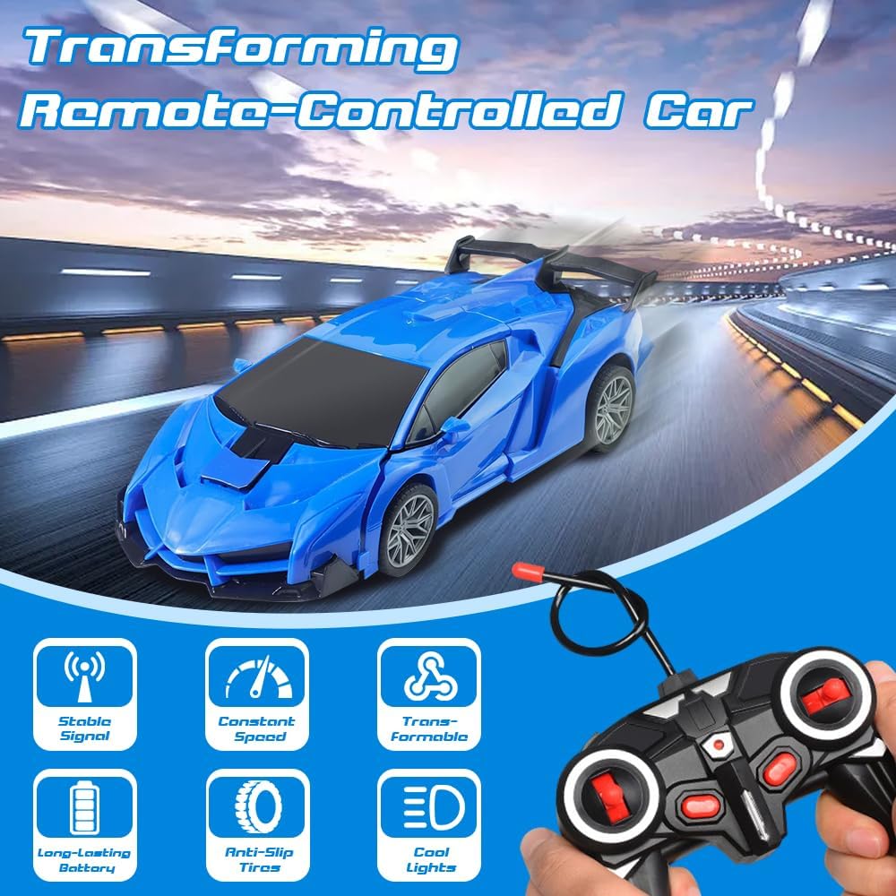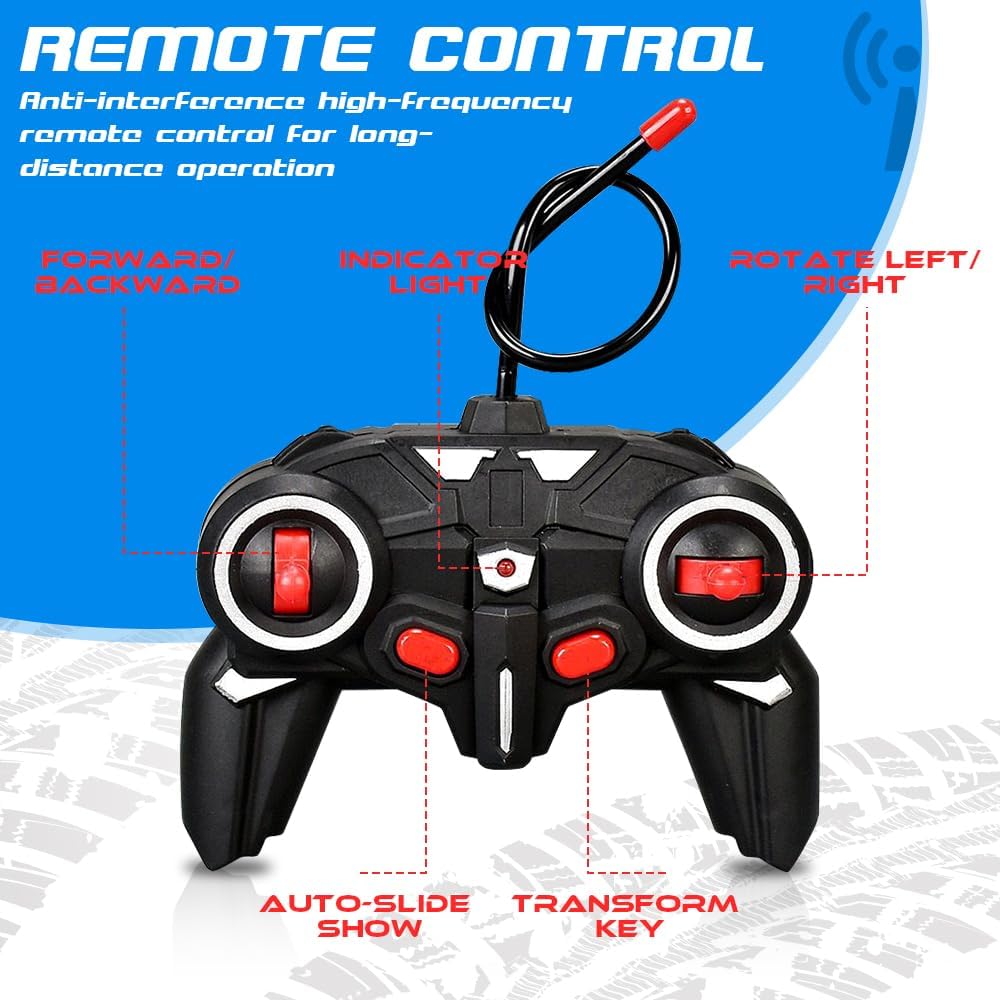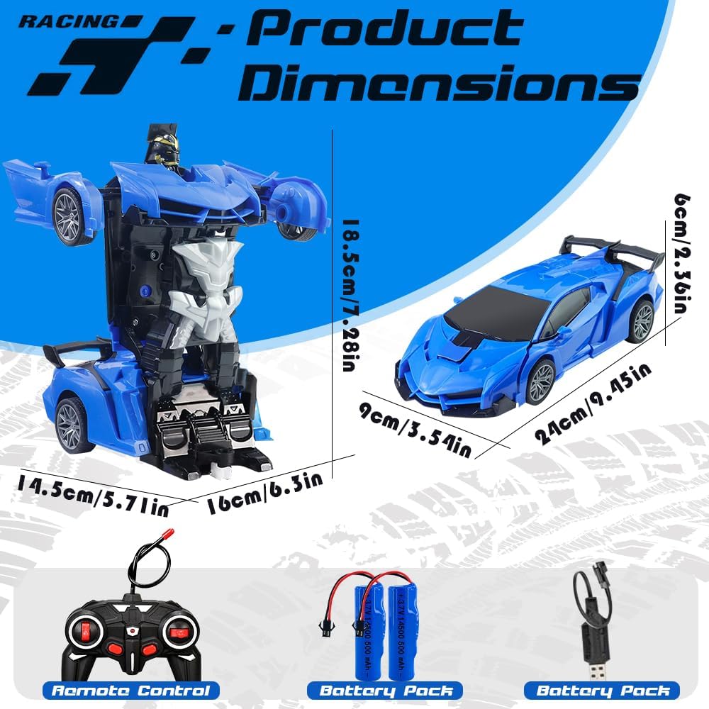 [Set di auto giocattolo telecomandata]: riceverete 1* Robot auto telecomandato, 1* telecomando, 1* cacciavite, deformazione robot RC auto contiene batterie ricaricabili, il telecomando richiede 2 batterie (le batterie non sono incluse nel pacchetto del prodotto, è necessario preparare altre 2 batterie AA). [Tecnologia di controllo remoto wireless a 2,4 GHz]: dotato di un telecomando da 2,4 GHz, il nostro robot auto telecomandato garantisce una risposta super veloce e un raggio di controllo fino a 50 metri. Perfetto sia per interni che esterni, riduce al minimo le interferenze da altri dispositivi, offrendo un'esperienza di gioco senza interruzioni e senza interruzioni. [360° Rotazione]: il nostro robot auto telecomandato dispone di un design unico a tutto tondo che consente una delicata manovra di rotazione a 360°. Non importa se in modalità auto o robot, il bambino può eseguire acrobazie fantastiche e godersi un divertimento dinamico. [Sicuro e durevole]: realizzato in plastica ABS di alta qualità e dotato di pneumatici in gomma resistente, la nostra auto RC robot deformazione è costruita per giocare duro su qualsiasi terreno. La sua struttura antiurto garantisce un divertimento duraturo, mentre i materiali atossici garantiscono la sicurezza del bambino. [Regalo Perfetto]: questo robot auto telecomandato combina un'auto e un robot che può essere commutato avanti e indietro tra l'auto e il robot. Il giocattolo trasformatore è perfetto per regali di compleanno, regali di Natale, regali per la festa dei bambini e regali di Capodanno per i vostri bambini.