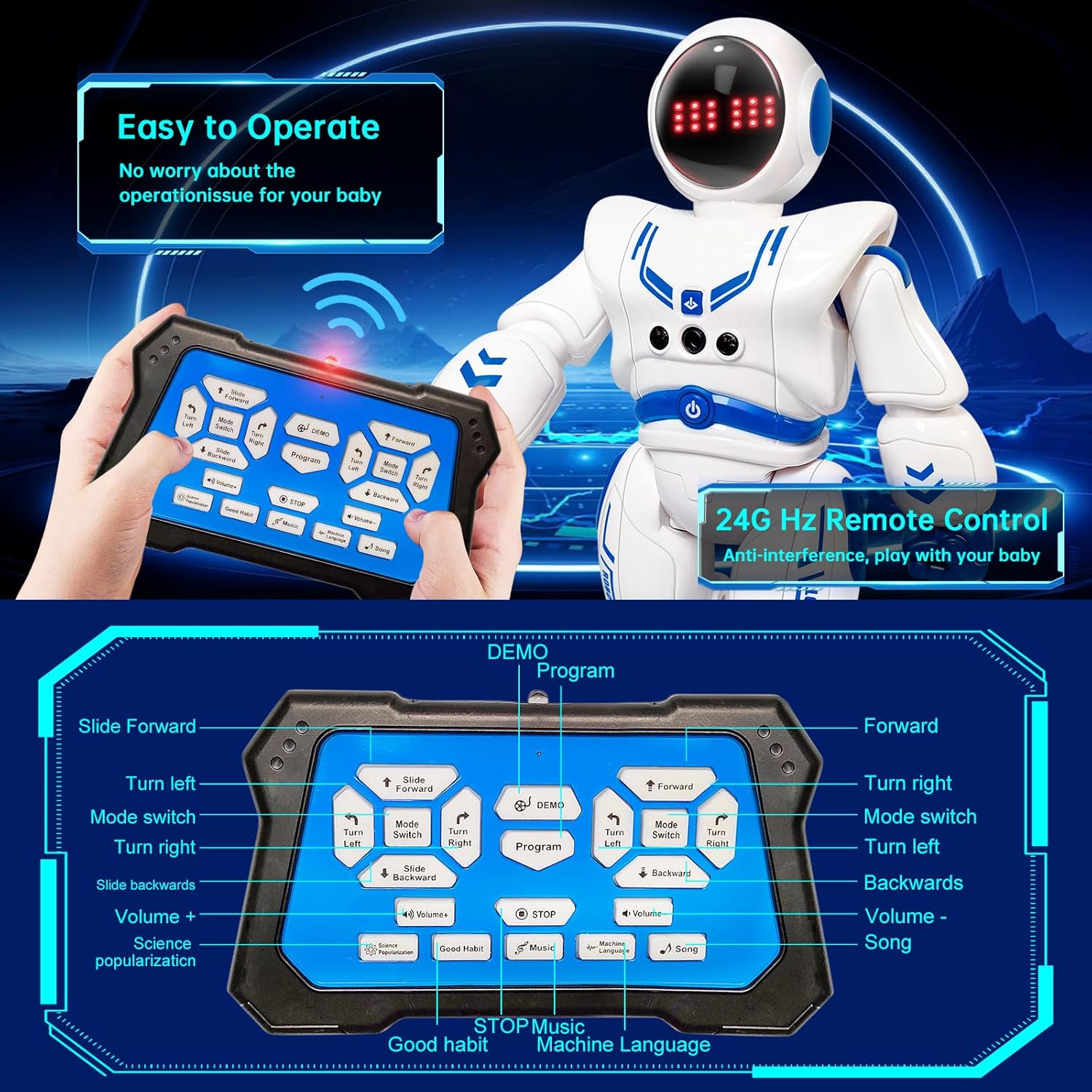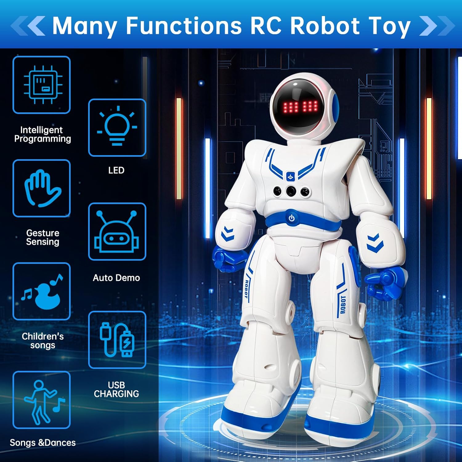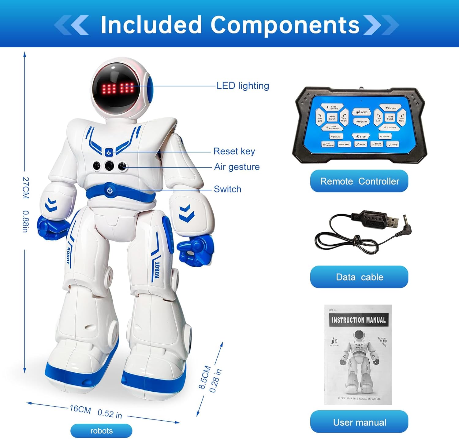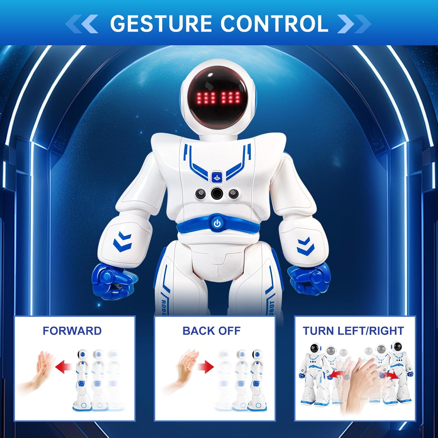 【Giocattolo robot con controllo remoto/gestuale】 Stai cercando un compagno robotico per i bambini? Il nostro robot giocattolo con rilevamento dei gesti ha molteplici combinazioni di funzioni con cui giocare, rendendo i robot per bambini non più monotoni! Questo robot giocattolo non può essere controllato solo dal telecomando e può muoversi in tutte le direzioni in base ai comandi gestuali. robot giocattolo giocattoli bambini ragazza 6 7 8 9 10 11 12 anni 【Programmazione intelligente】 Il robot giocattolo programmabile per bambini di 6-7-8-9-10 anni ha una funzione di programmazione in grado di provare una serie di azioni che il bambino inserisce tramite il telecomando e può programmare fino a 60 comandi di movimento da inserire. Con il programma, i tuoi bambini potranno anche progettare una passeggiata sulla luna, che porterà ai bambini un divertimento illimitato! robot giocattolo giocattoli bambini ragazza 6 7 8 9 10 11 12 anni 【Robot danzante e comodo da caricare】 Il nostro robot giocattolo intelligente per ragazzi e ragazze di 6 7 8 9 10 anni integra più canzoni, conoscenze scientifiche popolari, ecc., consentendo ai bambini di crescere felici fin dalla giovane età sotto l'influenza della conoscenza. I bambini possono seguire il ritmo ed eseguire danze miracolose con i robot. Inoltre è integrata una batteria di grande capacità, la ricarica USB è più conveniente. robot giocattolo giocattoli bambini ragazza 6 7 8 9 10 11 12 anni 【Materiale/Apprendimento Premium】 Questo robot telecomandato è realizzato in resistente plastica ABS, può raccontare storie scientifiche e buone abitudini per coltivare la creatività e l'immaginazione dei bambini di 8 9 10 anni durante il gioco. I bambini possono anche sperimentare diversi divertimenti attraverso le modalità interattive di camminata e scorrimento. robot giocattolo giocattoli bambini ragazza 6 7 8 9 10 11 12 anni 【Compagno dei bambini e scelta perfetta per i regali】 Il nostro robot per bambini 6 7 8 9 anni è un buon partner per la crescita dei bambini, accompagnandoli attraverso un'infanzia meravigliosa. Il robot giocattolo con controllo a infrarossi è versatile e vivace, può ballare, cantare, camminare, pattugliare e persino parlare con un accento affascinante. Grandi regali di compleanno, festival e Natale per bambini di età compresa tra 6 7 8 9 10 11 12 8-12 anni.