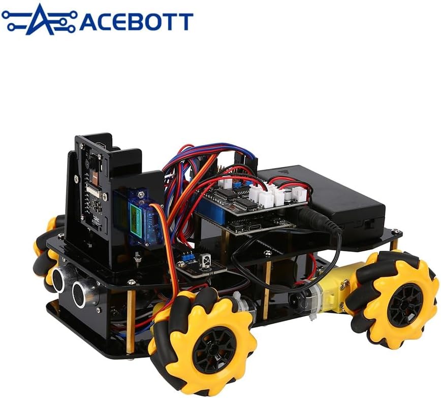 RUOTE MECCANO: Dotato di quattro ruote meccanismo che consentono movimenti omnidirezionali fluidi, tra cui lo spostamento laterale e la rotazione in loco SENSORI AVANZATI: Incorpora sensori ad ultrasuoni per il rilevamento degli ostacoli e la navigazione autonoma nell'ambiente COSTRUZIONE ROBUSTA: Telaio in alluminio resistente con finitura gialla e nera, garantendo stabilità e resistenza per un uso prolungato PROGRAMMABILE: Interfaccia di programmazione intuitiva per creare sequenze di movimento e azioni personalizzate CONNETTIVITÀ: Sistema di cablaggio organizzato con connettori multipli per una facile integrazione dei componenti elettronici