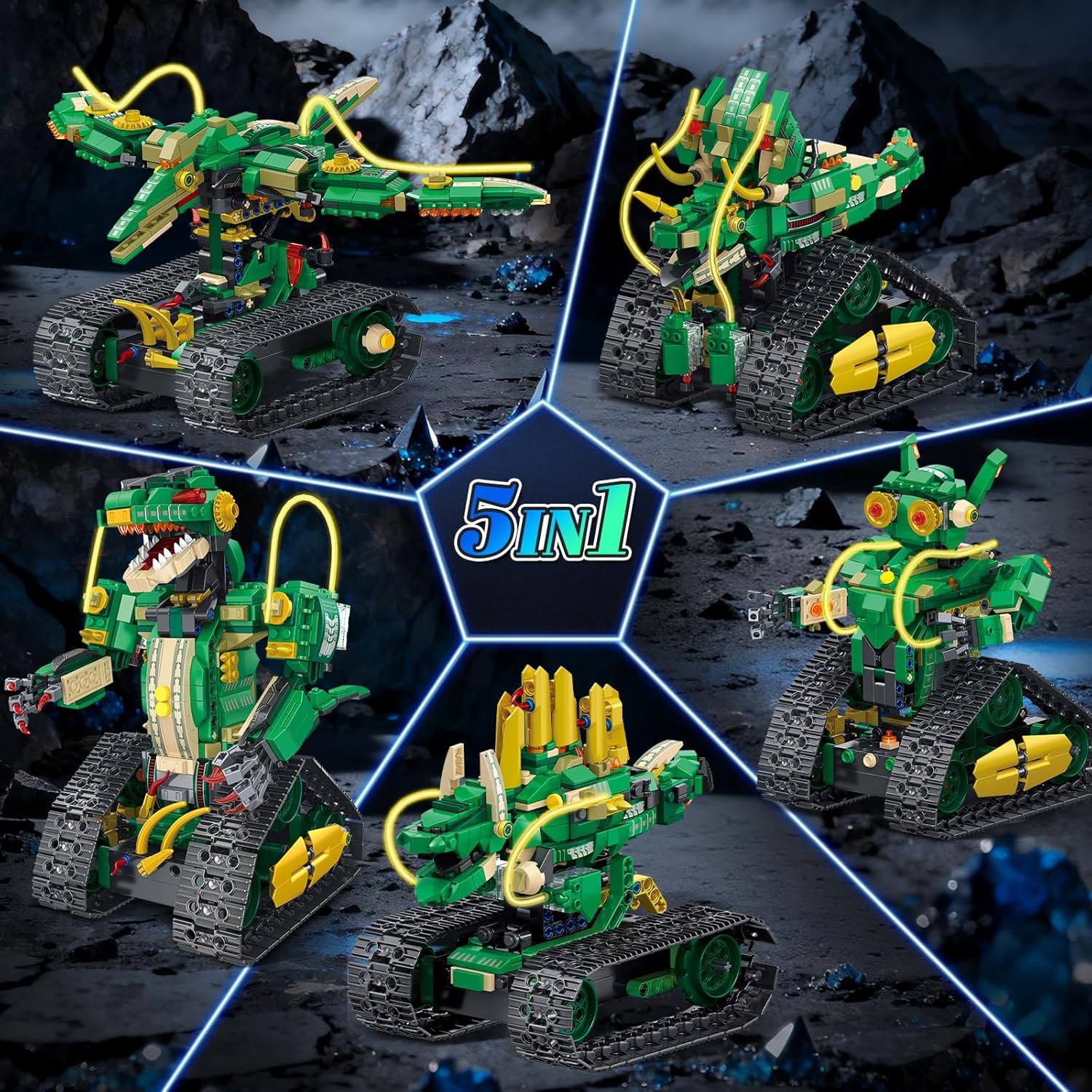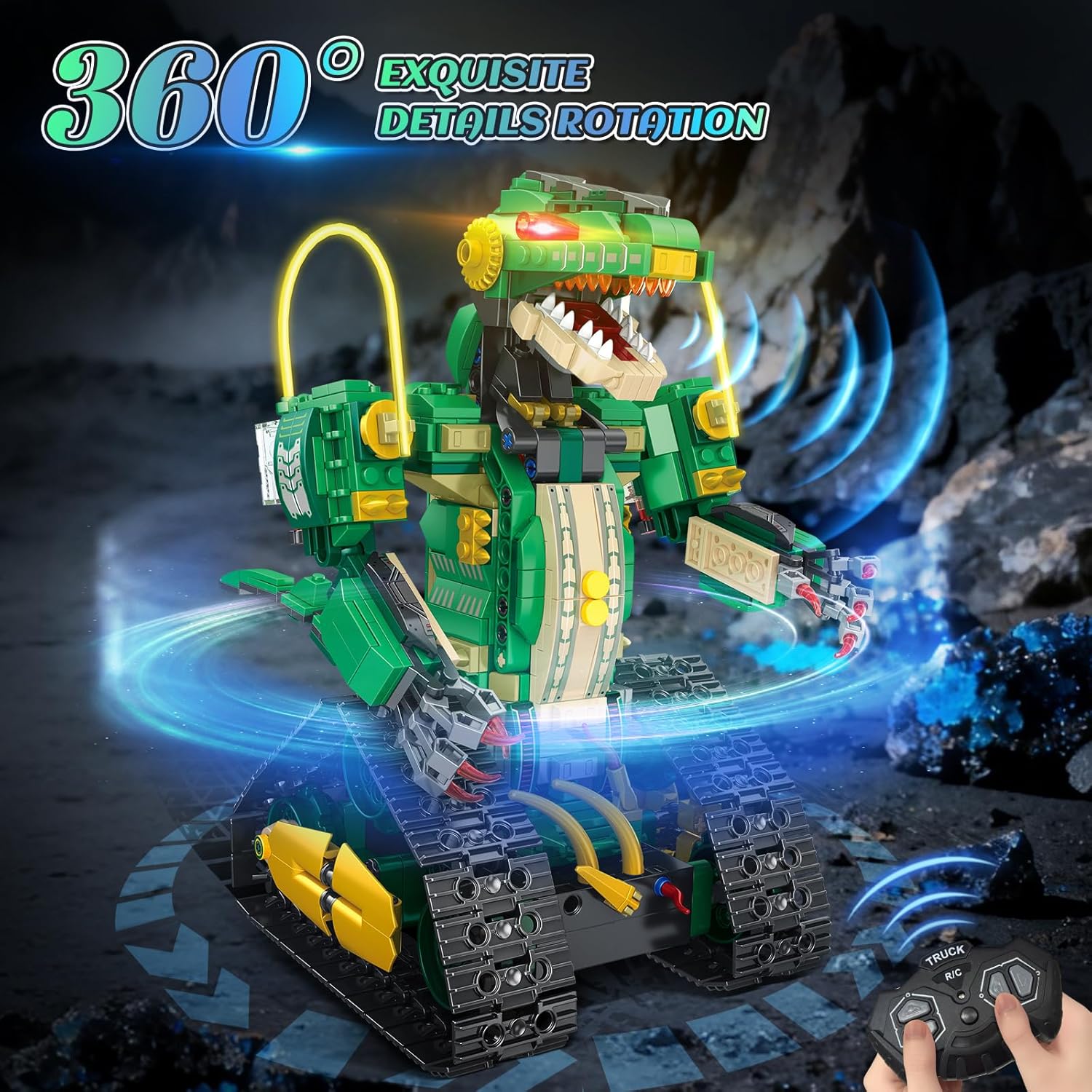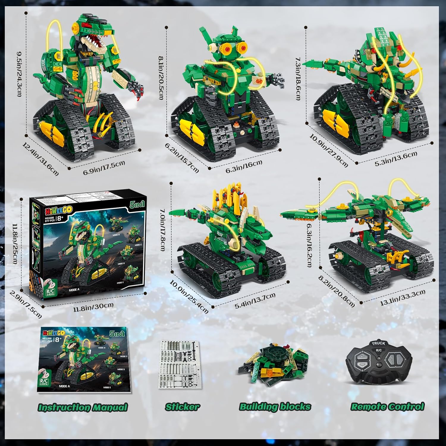 【Set di costruzioni per dinosauri tecnici 5 in 1】 I blocchi per costruzioni di dinosauri tecnologici 5 in 1 HiWEEGO possono essere liberamente assemblati in 5 fantastici modelli. Il nostro kit spazia dal mondo preistorico dei dinosauri ai mondi meccanici futuristici, permettendoti di diventare un "esploratore di dinosauri" e di provare lo stupore dei giganti preistorici mentre costruisci. Inoltre, puoi trasformarti in un "progettista meccanico" e divertirti per ore giocando a giochi robotici creativi. (È possibile assemblare solo un modello alla volta.) 【Funzionamento del telecomando】 Questo set di giocattoli per la costruzione di robot ingegneristici è dotato di un telecomando da 2,4 GHz, che ti consente di controllare facilmente il dinosauro ed eseguire varie azioni: guidare avanti e indietro, girare agilmente a destra e a sinistra e sbloccare vari modelli di gioco come "inseguimento" e "visualizzazione posa". Ciò trasforma il modello assemblato da una mostra statica in un compagno interattivo e divertente. (NOTA: il telecomando richiede 2 batterie AA, vendute separatamente.) 【Fantastici effetti di luce e design ricaricabile】Il dinosauro RC HiWEEGO per bambini ha un cavo luminoso integrato. Basta premere il pulsante della luce sotto il braccio del dinosauro per attivare effetti impressionanti. Alimentato da una batteria al litio ricaricabile da 500 mAh che elimina la necessità di frequenti cambi di batteria, i tuoi bambini potranno immergersi completamente in epiche battaglie tra dinosauri. 【Artigianato magistrale】 Questi blocchi di costruzione con morsetto per robot da 877 pezzi sono realizzati in plastica ABS ecologica di alta qualità con una precisione eccezionale. La testa e la coda del dinosauro possono muoversi da un lato all'altro per monitorare costantemente i "segnali di pericolo" nell'ambiente. I suoi polsi ruotano in modo flessibile e gli artigli possono aprirsi e chiudersi per simulare la presa della preda, ricreando fedelmente l'aspetto realistico del dinosauro. 【I regali perfetti】 Il set di giocattoli educativi sui dinosauri HiWEEGO è un regalo eccellente per gli appassionati di dinosauri. Con il suo design accattivante e gli effetti luminosi, è il regalo perfetto per i bambini dagli 8 anni in su per compleanni, Halloween, Natale, Ringraziamento, Capodanno o altre festività.