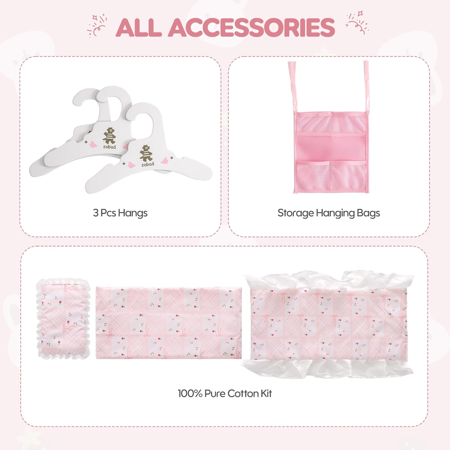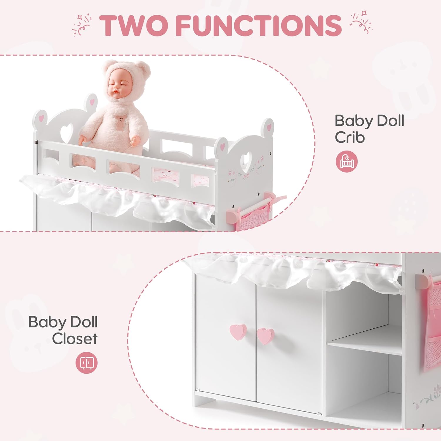Set culla per bambola: la culla in legno è la combinazione perfetta tra letto per bambola, armadio e contenitore. I bambini sono in grado di simulare vari comportamenti come piegare i vestiti, appenderli, riporre oggetti, ecc. mentre giocano con la bambola. Sono inclusi 3 ganci in legno aggiuntivi e 1 custodia per appendere per esplorare più possibilità. MISURA ADATTA PER BAMBOLE: Il letto per bambole misura 22 x 10,8 x 21,5 pollici e si adatta alla maggior parte delle bambole Barbie fino a 21 pollici. Forniamo inoltre alla bambola biancheria da letto in cotone al 100%, incluso un cuscino, lenzuola e una trapunta, che possono consentire alla tua Barbie di dormire comodamente. Legno naturale e facile da montare: la culla è realizzata in legno massello naturale, atossico, inodore, sicuro e affidabile e non si danneggia facilmente con l'uso a lungo termine. Il set da letto viene fornito con istruzioni e immagini in inglese e può essere facilmente assemblato in 20 minuti. Impara giocando: il set di biancheria da letto per bambole stimola l'immaginazione e la curiosità dei bambini e promuove lo sviluppo del linguaggio e delle abilità sociali attraverso il gioco di ruolo mentre giochi con la bambola. Regalo perfetto: l'armadio per bambole presenta una classica combinazione di colori rosa e bianco e viene fornito con una confezione regalo, che lo rende il regalo perfetto per i compleanni dei bambini e altre feste. È molto adatto anche per decorare le camerette dei bambini o gli asili nido.