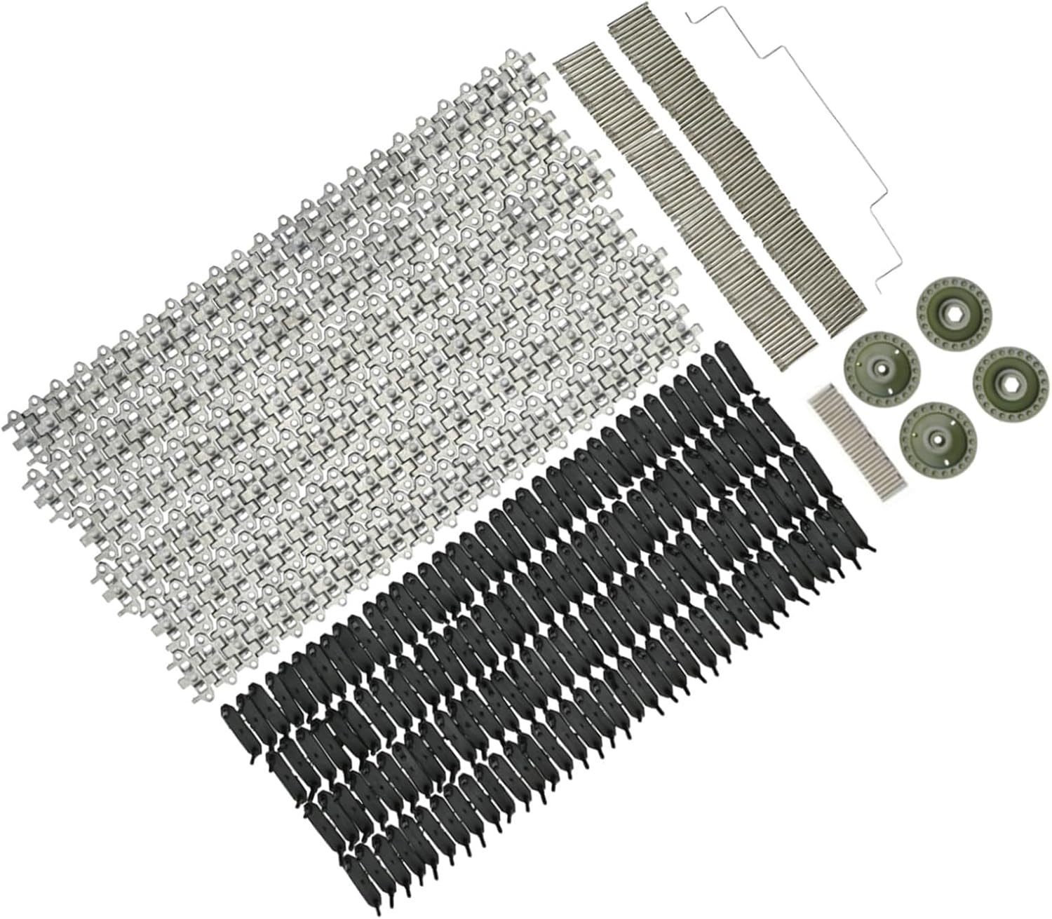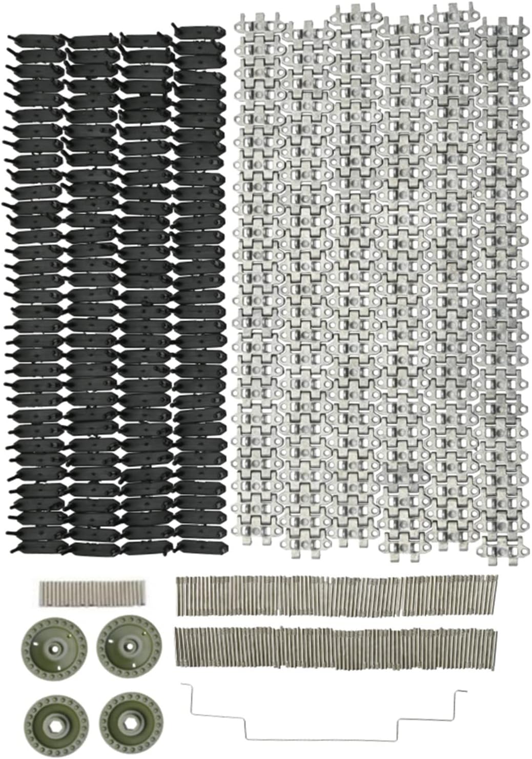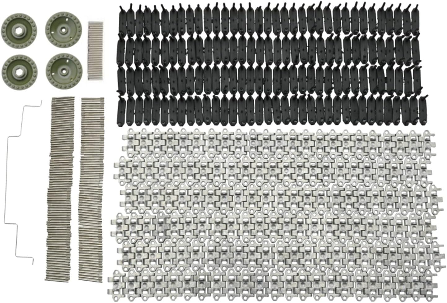 Facile installare: i binari sono facili installare e rimuovere, consentendo di sostituire direttamente le parti originali o danneggiate maggiore resistenza. Materiale durevole: i binari sono realizzati in lega di alluminio e materiale plastico, che non si deformano facilmente, sono resistenti all'usura, durevoli, stabili e affidabili e hanno una lunga durata. Stabilità eccellente: i cingoli possono rendere la posizione di più duratura, non rigida e garantire una guida più del veicolo. Modelli applicabili: i binari in alluminio non aggiungono ulteriore carico ai veicoli RC e sono adatti per l'aggiornamento della conversione dei binari WPL E 1 GAZ 71. Squisita fattura: i cingoli sono realizzati con precisione per un funzionamento regolare, fornendo una guida equilibrata e riducendo le vibrazioni causate strade sconnesse.