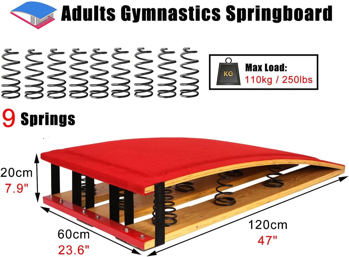 Trampolino da competizione: questo trampolino da competizione è adatto sia a ragazzi che ad adulti! Le specifiche e le proprietà sono progettate secondo gli standard delle competizioni, quindi può essere utilizzato in palestra o a casa. Carico massimo 110 kg / 250 libbre. 9 Molle ad alta elasticità: le molle spesse ad alta tenacità hanno un'elasticità e una resilienza extra, sono sicure e consentono un supporto superiore e un utilizzo ottimale. Pedale Springs Boards: queste molle garantiscono un elevato livello di elasticità e contribuiscono a migliorare il rimbalzo del trampolino, consentendo agli utenti di eseguire vari salti e manovre con facilità. Trampolino elastico: il trampolino è progettato con una forma arcuata. Questo design garantisce che il peso dell'utente venga distribuito uniformemente, fornendo una piattaforma stabile ed equilibrata per il salto e l'atterraggio. Ampiamente utilizzato: trampolino da ginnastica resistente, perfetto per la casa, la barra di ginnastica, la sala giochi, i percorsi a ostacoli, la palestra di casa, il seminterrato, ecc.