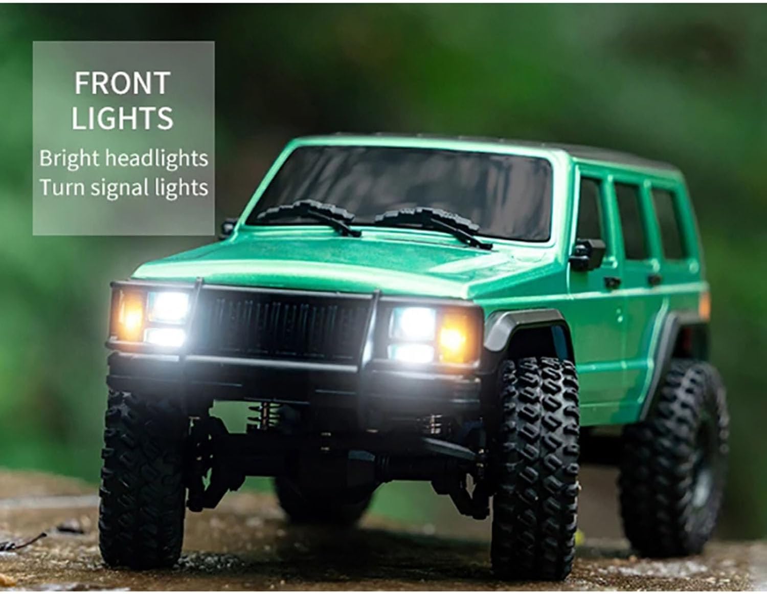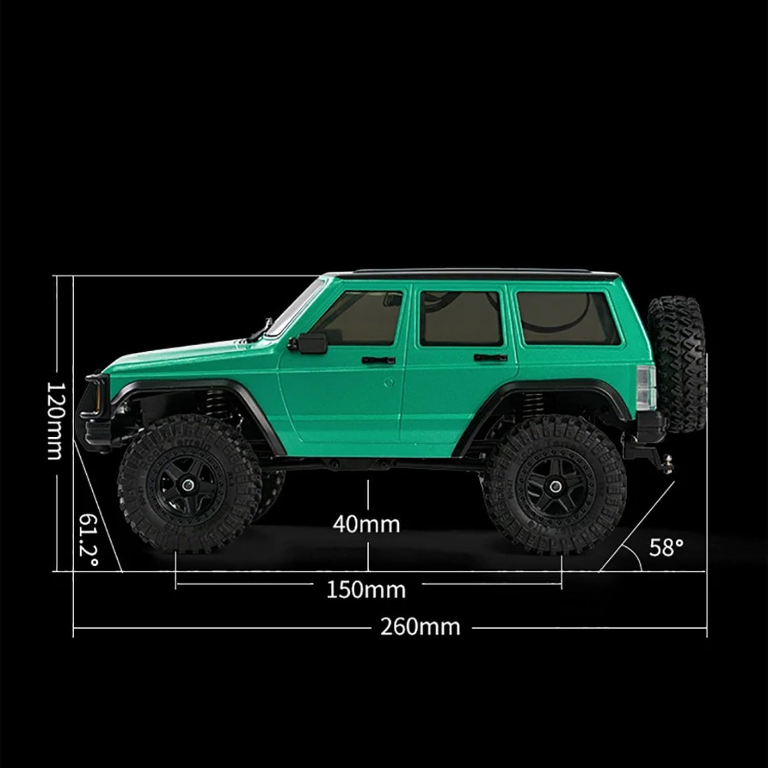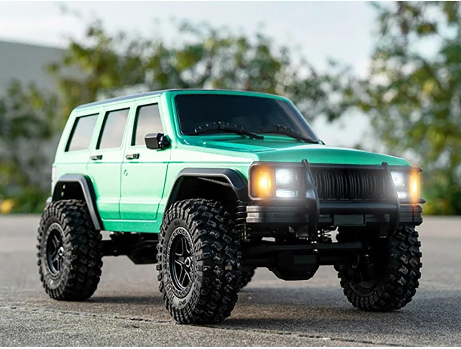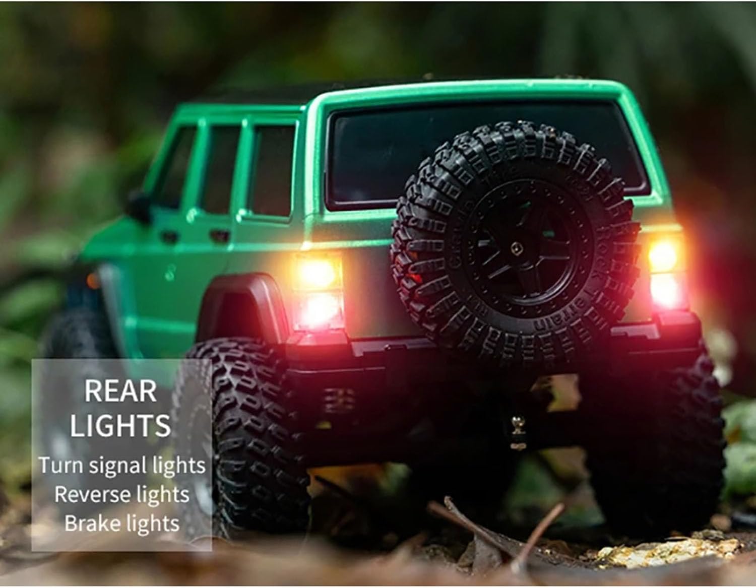 Simulazione della lampada per auto, dotata di luci dei freni e indicatori di direzione, che controlla le luci per accendersi durante le curve per migliorare l'esperienza di guida. La carrozzeria in ABS include elementi di simulazione dettagliati come una ruota di scorta, gancio di traino, specchietto retrovisore, maniglia della porta e tergicristallo. Capace di arrampicata a bassa velocità con 3 velocità regolabili, è alimentato da un motore a spazzola di carbone esterno nero ad alta coppia 370 e un regolatore di velocità spazzolato impermeabile da 20 A, offrendo una forte potenza di uscita. Il telaio aggiornato, caratterizzato da un'elevata altezza da terra e una struttura a ponte a forma di diamante con un volume più piccolo, assicura uno spazio operativo sufficiente per il sistema di sospensione. I pneumatici fuoristrada antiscivolo allargati e un ponte integrale ampliato migliorano la stabilità del veicolo, garantendo prestazioni ottimali durante l'arrampicata all'aperto e migliorando l'operatività e la capacità fuoristrada.