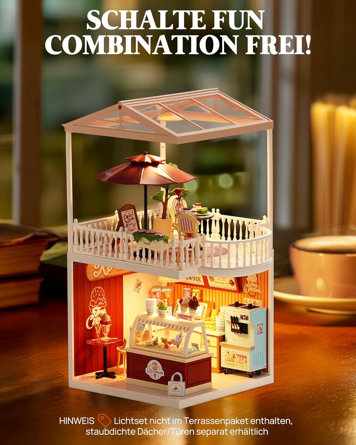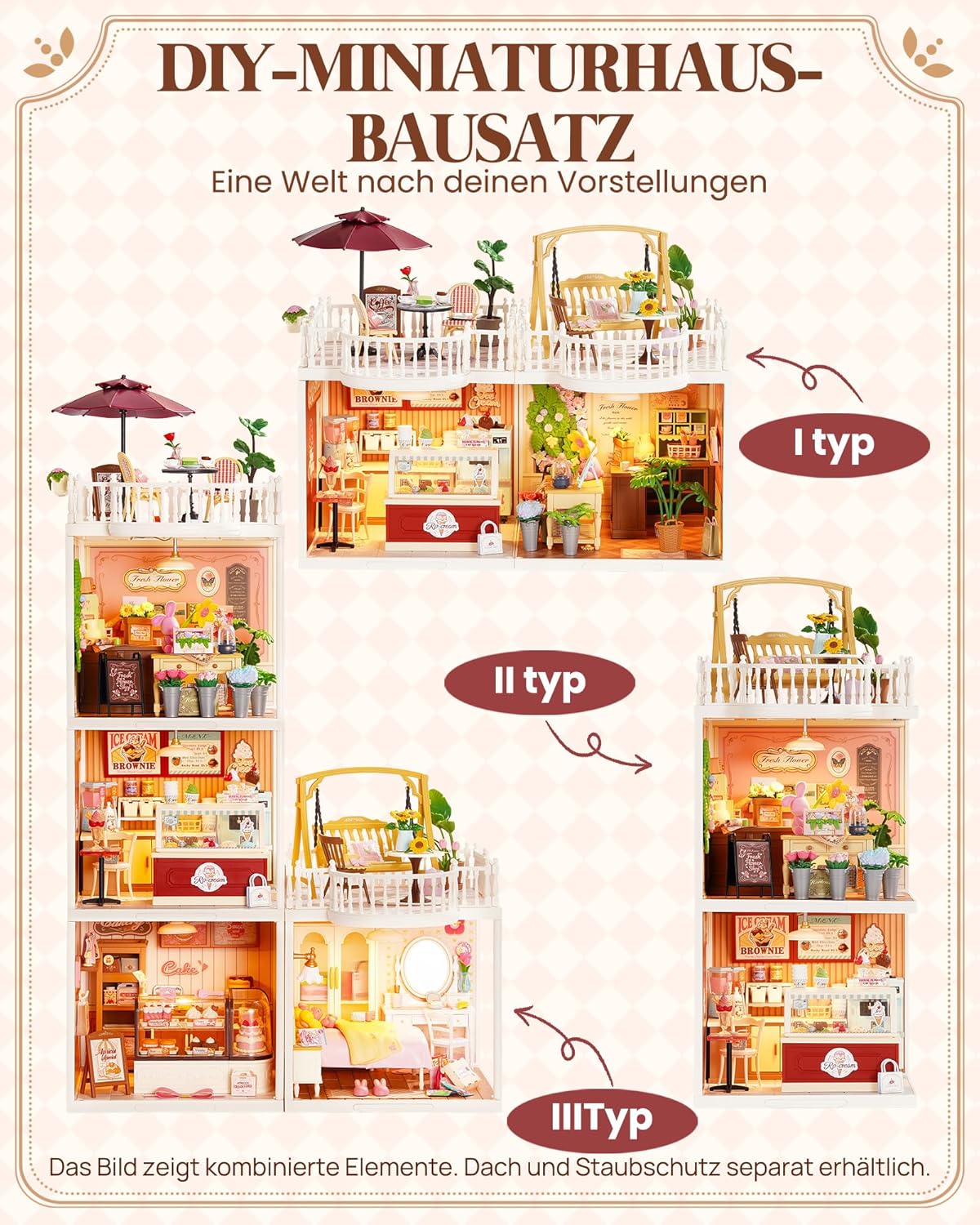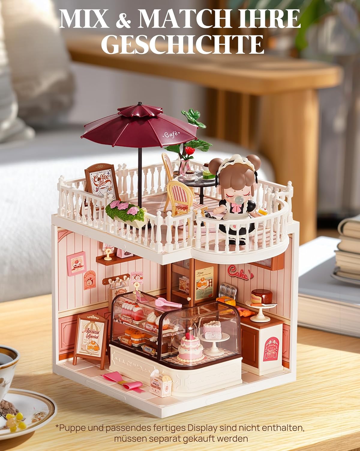Chic Café Terrace: crea un affascinante mini café con questo magico set in miniatura! Disporre sotto l'elegante parasole “café” tazzine da caffè, fette di torta e una borsetta di perline. Ogni dettaglio accurato, dalle sedie ai fiori, porta nelle tue mani l'autentico stile parigino. Un rifugio creativo perfetto per gli amanti dei caffè. Dettagli perfetti: il kit modello Rolife è progettato e realizzato con cura. Il kit in miniatura Rolife dà vita ad affascinanti scene di terrazze - con pietre lisce e di alta qualità per una piacevole sensazione di costruzione. Ogni pezzo realizzato con cura crea miniature meravigliosamente realistiche che sono una gioia da apprezzare. Espandi il tuo mondo in miniatura: compatibile con i set base Rolife Super World. Possono consentire il gioco interattivo tra diversi componenti. Collega la tua terrazza Rolife con altri kit di modelli (ad esempio Tasty Cake Shop/Lovely Pink Bedroom). Il design modulare ti consente di creare strade individuali, ideali da esporre o regalare. Inizia con piccoli modelli e costruisci gradualmente la tua città in miniatura da collezione. Divertimento creativo nella costruzione! Con la magica estensione del patio della casa delle bambole di Rolife, puoi costruire come vuoi! Crea un paradiso floreale o un accogliente angolo relax: ogni blocco apre nuove idee. Più edifici = più immaginazione. REGALO SPECIALE E DECORAZIONI DIVERTENTI: questo rilassante kit di costruzione di modelli fai-da-te è un ottimo regalo per gli adulti in occasione di compleanni, Natale o San Valentino. In combinazione con altre Rolife Tiny Houses (vendute separatamente) puoi espandere il tuo mini mondo. È ideale per trascorrere del tempo insieme in famiglia, per ore romantiche o per lavori artigianali tranquilli e promuove la creatività e il divertimento costruttivo.