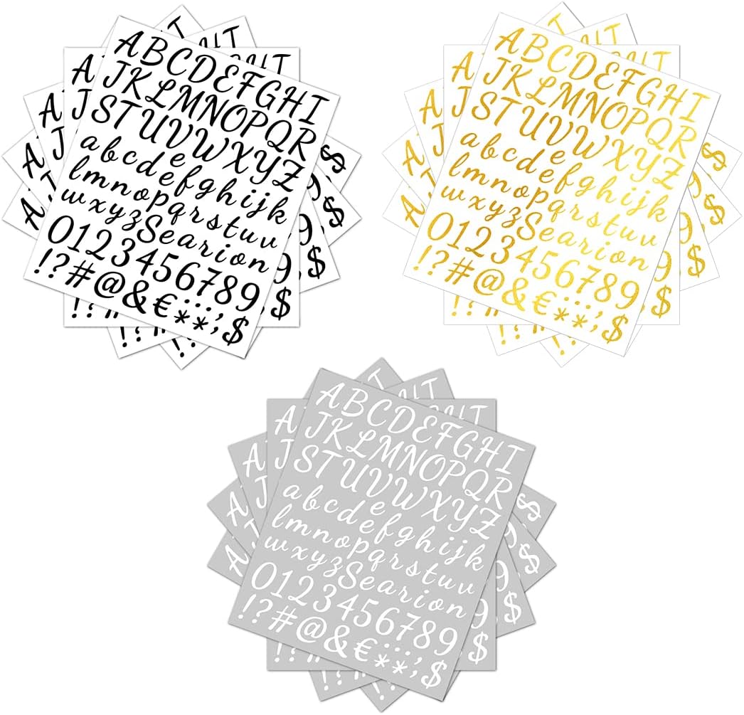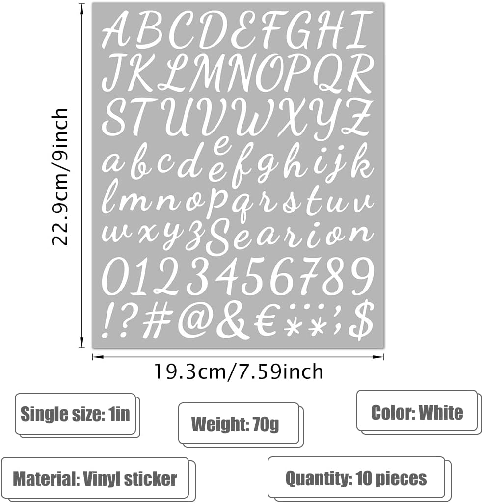 ✿ Materiale adesivo: realizzato in materiale vinilico di alta qualità, durevole e di lunga durata, impermeabile e resistente alle intemperie, non facile da staccare anche in caso di vento e pioggia, logo resistente ai raggi UV, questi adesivi sono affidabili e durevoli, adatti a tutti i tipi di applicazioni interne ed esterne. ✿ Dimensioni adesivo: l'intero adesivo: 22,9 x 19,3 cm (9 x 7,59 pollici), ogni lettera maiuscola e simbolo numerico misura ca. 2,54 mm di altezza. Le dimensioni adeguate ne consentono l'utilizzo per molteplici scopi. ✿Pacchetto incluso: riceverai 10 fogli di numeri di lettere in vinile autoadesivi bianchi, inclusi 260 pezzi di lettere maiuscole, 340 pezzi di lettere minuscole e 100 pezzi di numeri e segni di punteggiatura, abbondanti per soddisfare le tue esigenze di uso quotidiano. ✿Facile da usare: devi solo staccare il supporto di carta dall'adesivo, lasciare i numeri o le lettere su ciò che desideri etichettare; Incollatelo e premetelo con le dita per farlo aderire più saldamente. Questo processo ti offre divertimento e successo illimitati. ✿ Superficie applicabile: gli adesivi con numeri di lettere si adattano bene a tutte le superfici dure, asciutte, lisce e pulite come metallo, vetro, skateboard, finestre, plastica, automobili, bottiglie, telefoni, computer, chitarre, coperchi di bidoni della spazzatura, luce dell'indirizzo, segnaletica scolastica, artigianato, numeri civici, cassetta delle lettere in acciaio, contenitori del garage, etichettatrici, colonne del portico, etichettatura del numero della stanza ecc.