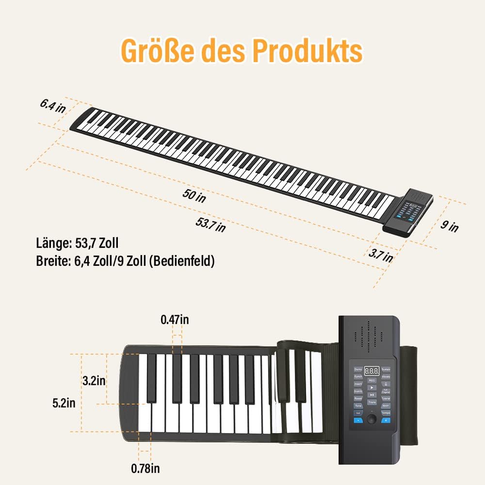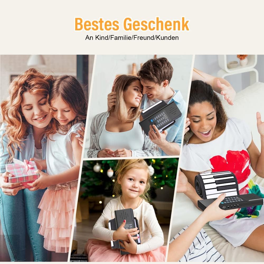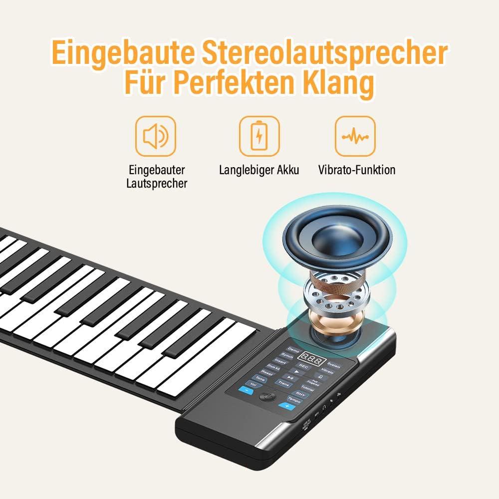 Materiale in silicone di qualità alimentare: questo pianoforte elettronico a 88 tasti è di alta qualità con tastiera in silicone ecologica, non tossico, resistente all'usura, morbido e durevole e ha ottenuto la certificazione di qualità del prodotto FC 【 Pianoforte portatile per bambini】 Il piano roll-up a mano con altoparlanti stereo integrati, il pianoforte può essere arrotolato. È conveniente portarlo con te in viaggio, all'aperto, a casa, a scuola. Vai ovunque e inizia a giocare in qualsiasi momento. Può essere collegato a altoparlanti e cuffie esterne, in modo da non disturbare gli altri. Funzione MIDI: con il pianoforte pieghevole con funzione midi è possibile connettersi a diversi dispositivi intelligenti come computer e tablet, per creare la propria musica, è possibile riprodurre i giochi musicali in garage, il piano perfetto e il piano pop. Imparare il pianoforte è più divertente. 【Multifunzionalità】 Pianoforte a rullo per adulti 88 tasti con 128 toni e ritmi, 14 canzoni demo, il pianoforte pieghevole include anche una facile registrazione, lavorazione, riproduzione, sustain, vibrazione, istruzione, funzioni di accordo, ecc. Un modo divertente per giocare in modo che un principiante possa soddisfare le loro esigenze di esercizio. Doppia garanzia di alimentazione: la tastiera pieghevole per pianoforte in silicone con batteria al litio ricaricabile integrata, supporta la ricarica USB, ricarica powerbank, funzionamento a batteria al litio, 6-8 ore di tempo di riproduzione per una carica completa. Non preoccupatevi che le prestazioni non siano sufficienti durante la pratica del pianoforte.