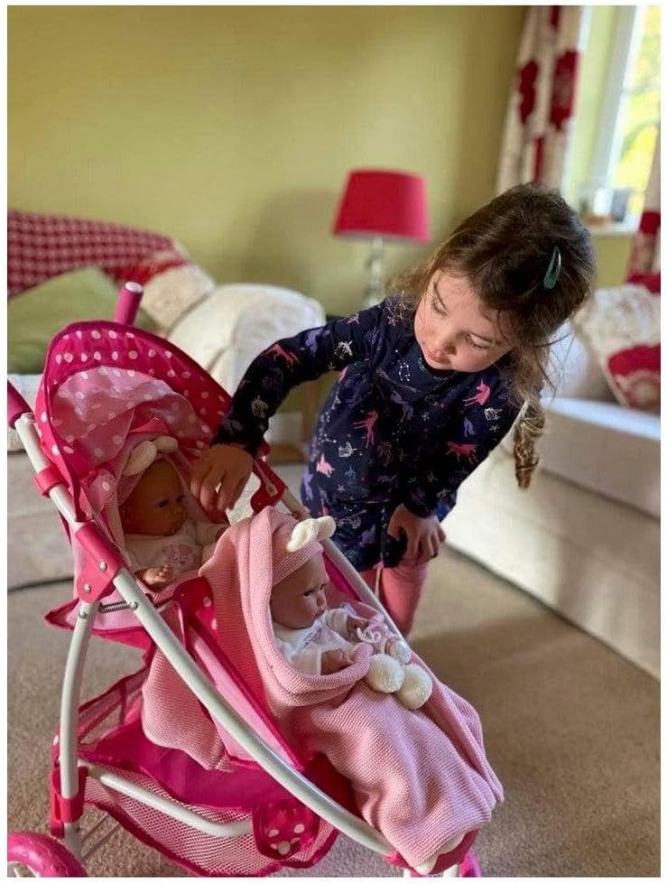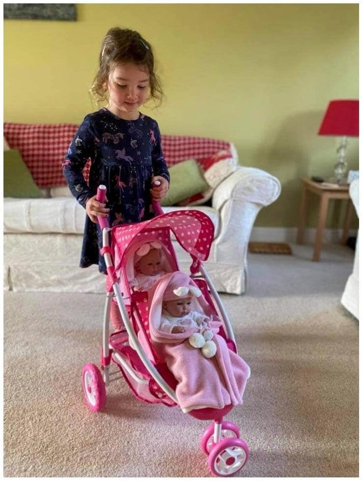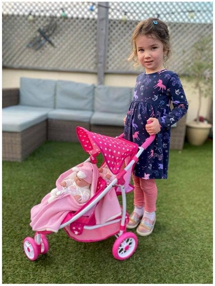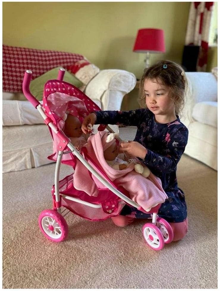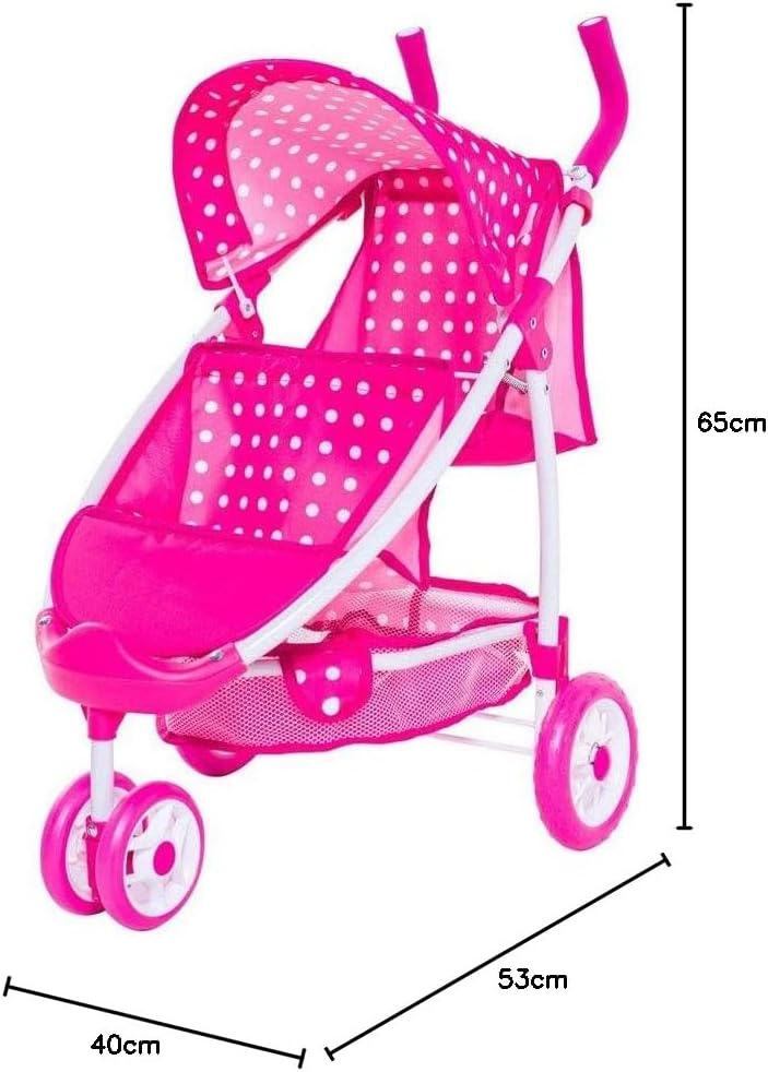The Dotty tandem doll's pram has room for two 2 places for 2 dolls or teddy bears - facing each other With a handle height of 65cm, the Dotty is suitable for ages 3 and up