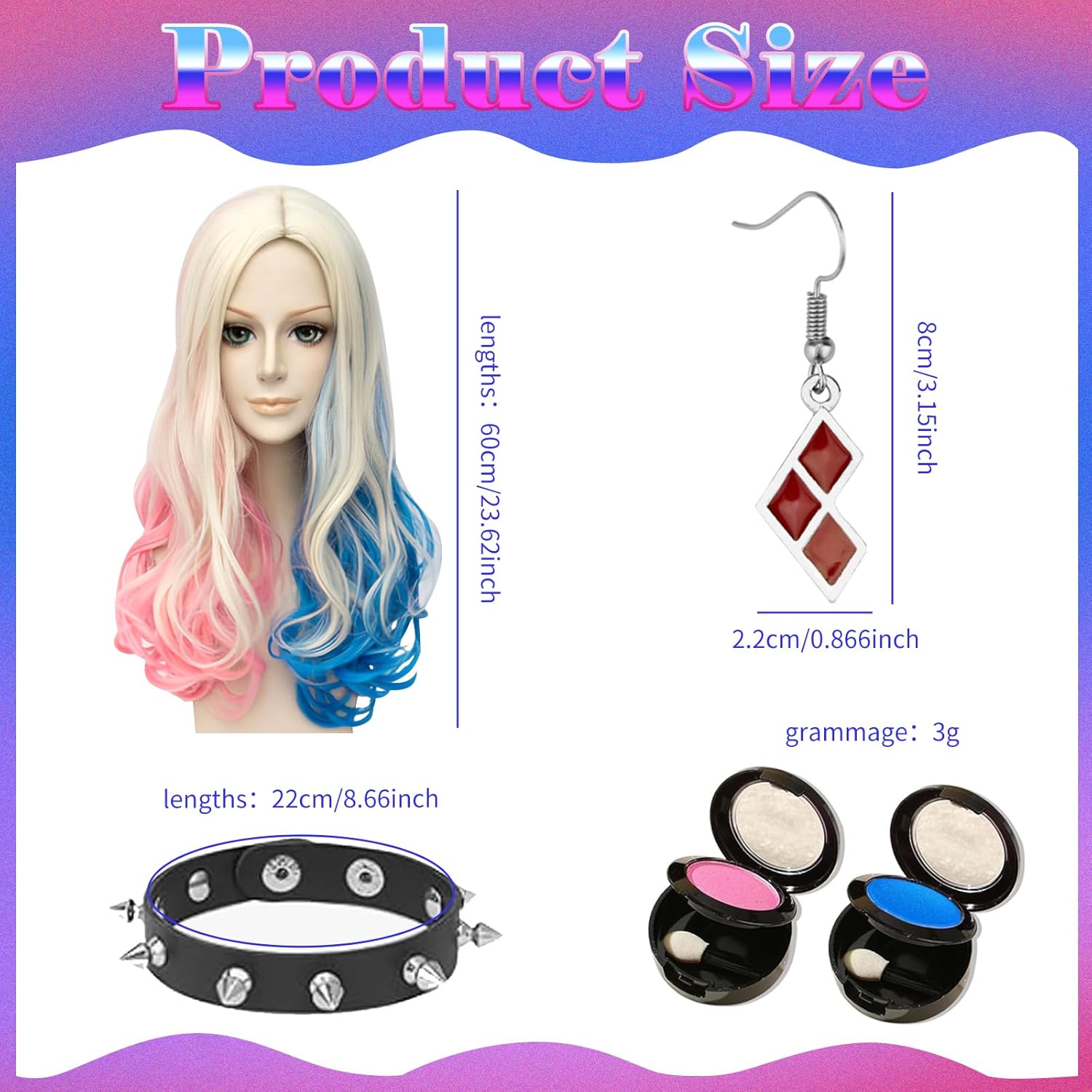 🎀 【Set Completo di Accessori】:Include una bellissima parrucca Quinn, una comoda retina, orecchini e braccialetto coordinati, e in più due fard (rosa e blu)!Tutto ciò che serve per il tuo costume in un'unica scatola, senza altre ricerche. Diventa la star della festa con facilità 😊 【Regolabile e Comodissima】:La parrucca ha una fibbia regolabile interna che si adatta a tutte le circonferenze della testa. Con la retina traspirante, i tuoi capelli sono comodamente raccolti, assicurando freschezza e comfort anche dopo ore di utilizzo. Goditi la festa senza preoccupazioni 🌟 【Materiale Premium】:Realizzata con fibre sintetiche di alta qualità, la parrucca è incredibilmente morbida, lucida e resistente ai nodi. Gli accessori sono finemente lavorati e piacevoli da indossare, per un'esperienza di travestimento di alto livello 🎉 【Per Ogni Occasione】:Che sia per Halloween, Cosplay, feste in maschera o party a tema, questo set è la scelta perfetta. Non dimenticare di scattare tantissime foto e far impazzire i tuoi amici sui social con il tuo look straordinario ⚠️ 【Solo per Adulti】:Prodotto progettato per adulti. Contiene piccole parti. VIETATO l'uso a minori di 14 anni. Conservare fuori dalla portata dei bambini