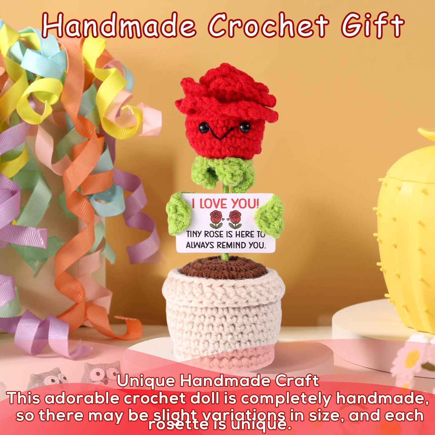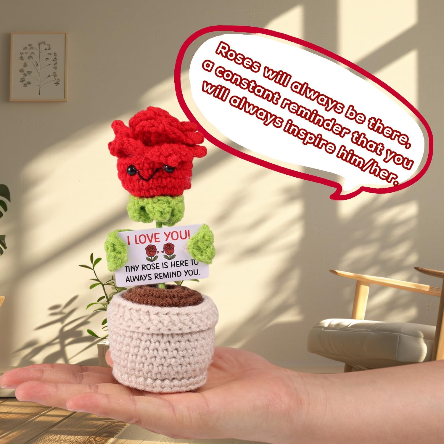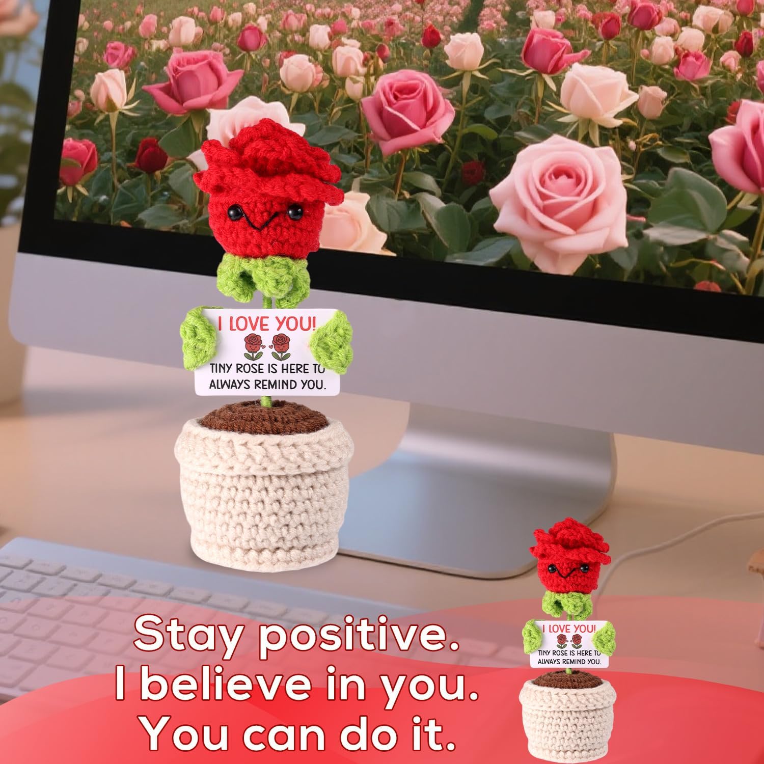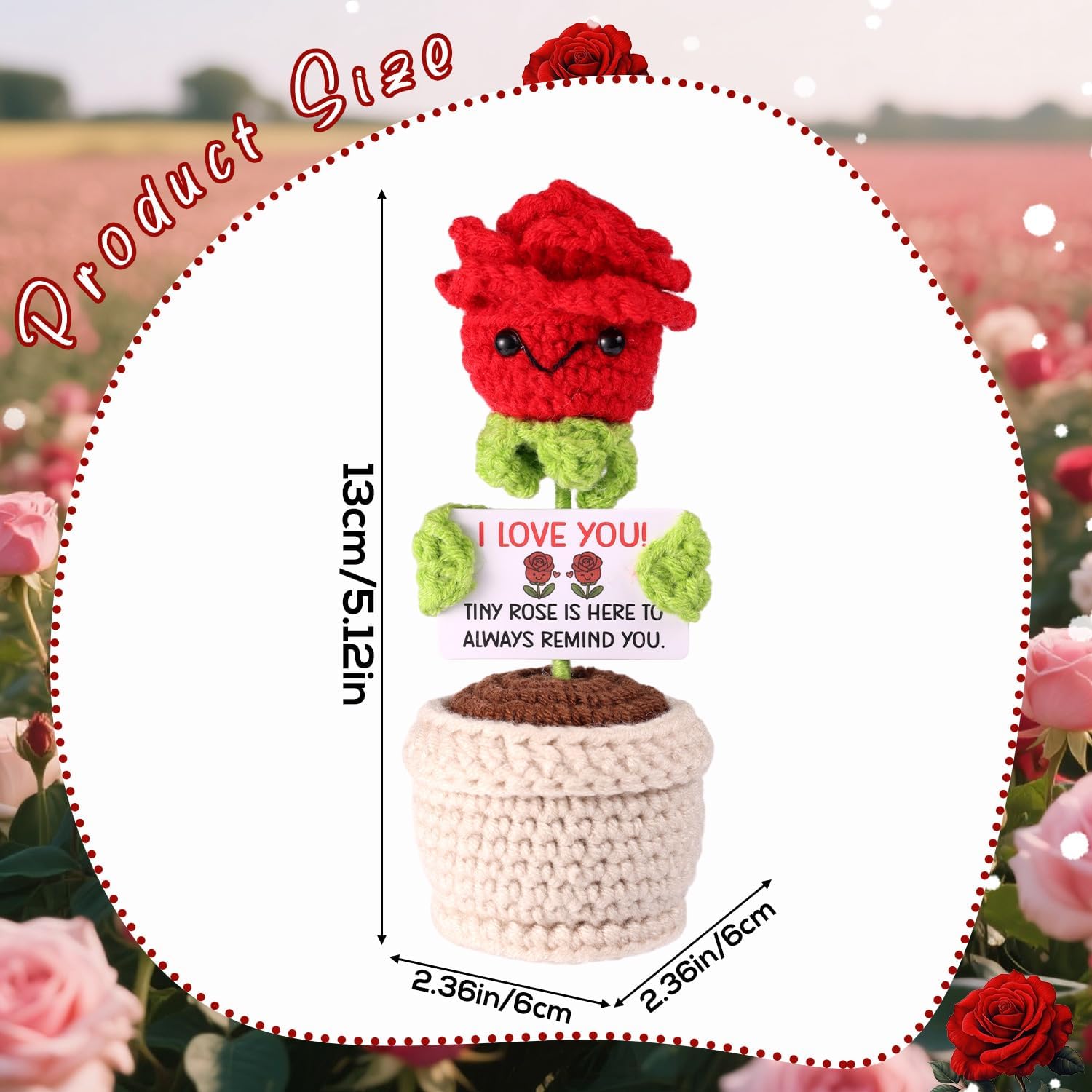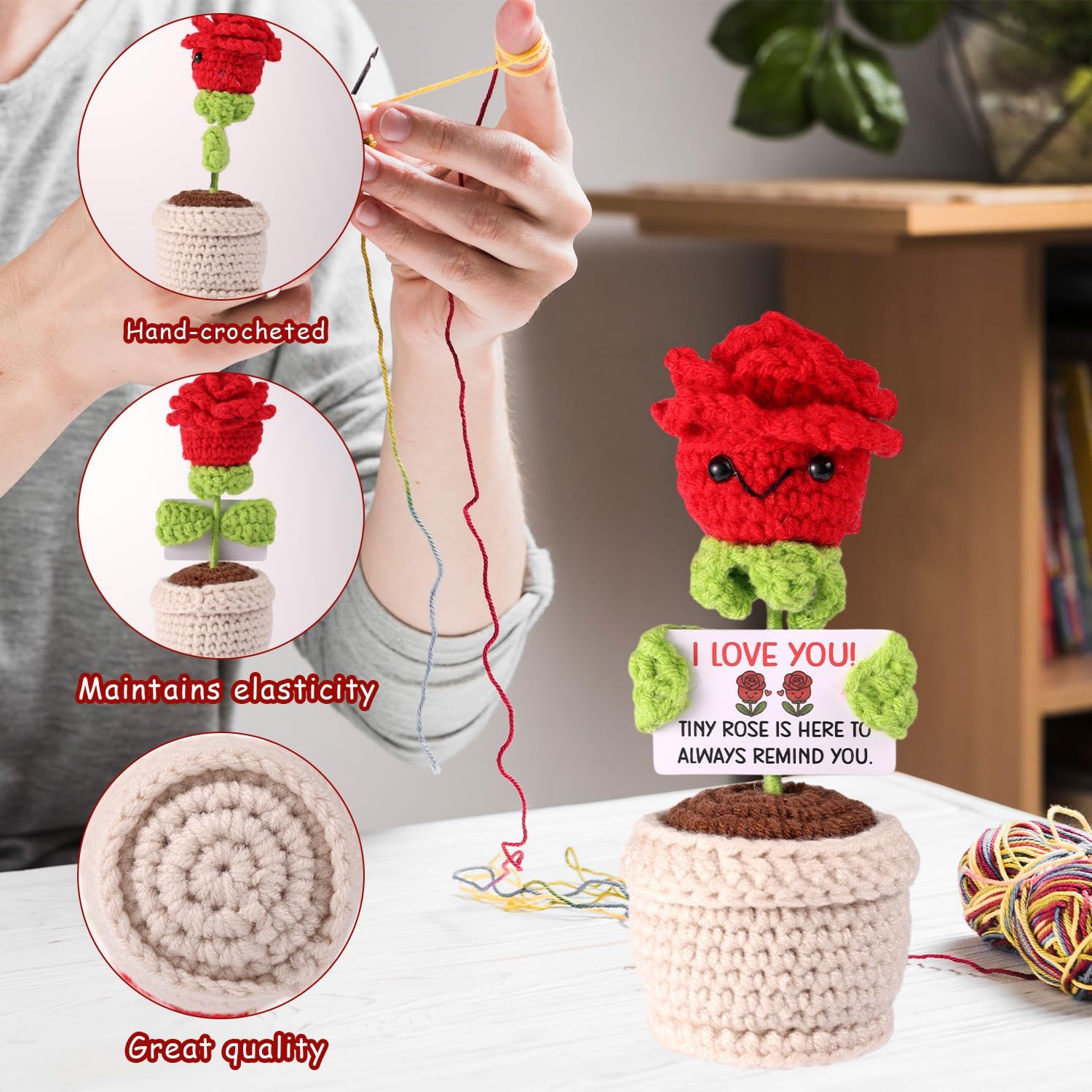 Contenuto e dimensioni: puoi ottenere 1 pezzo di pentola rose rossa all'uncinetto, misurato circa 13x6x6cm, anche accompagnato da una carta sentita con messaggi incoraggianti, che possono infondere potenza positiva e calda nella tua vita quotidiana. È un regalo di coppia ideale! Design elegante: ispirato alla bellezza senza tempo delle rose rosse, abbiamo realizzato questo all'uncinetto di rosa positivo, che sembra vivido e romantico. Può stare in piedi stabilmente sul tavolo, sembrando realistico da lontano. Materiale affidabile: la rosa positiva è meticolosamente raccolta a mano con lana affidabile, garantendo una consistenza morbida e confortante. I fili sono strettamente all'uncinetto per evitare l'allentamento o la svelata, mantenendo il suo bell'aspetto nel tempo. Decoro perfetto: perfetto per migliorare la tua casa, questa rosa all'uncinetta può essere visualizzata su tavoli finali, stand TV, librerie o qualsiasi superficie liscia vuota, aggiungendo un'atmosfera romantica alla tua casa. Regalo premuroso: l'uncinetto rosa rosso simboleggia l'amore e la passione, che è la scelta ideale per accoppiare il regalo in anniversario, compleanno, Natale ecc. La carta motivazionale inclusa aggiunge un ulteriore livello di incoraggiamento, rendendolo un regalo significativo per i compagni.