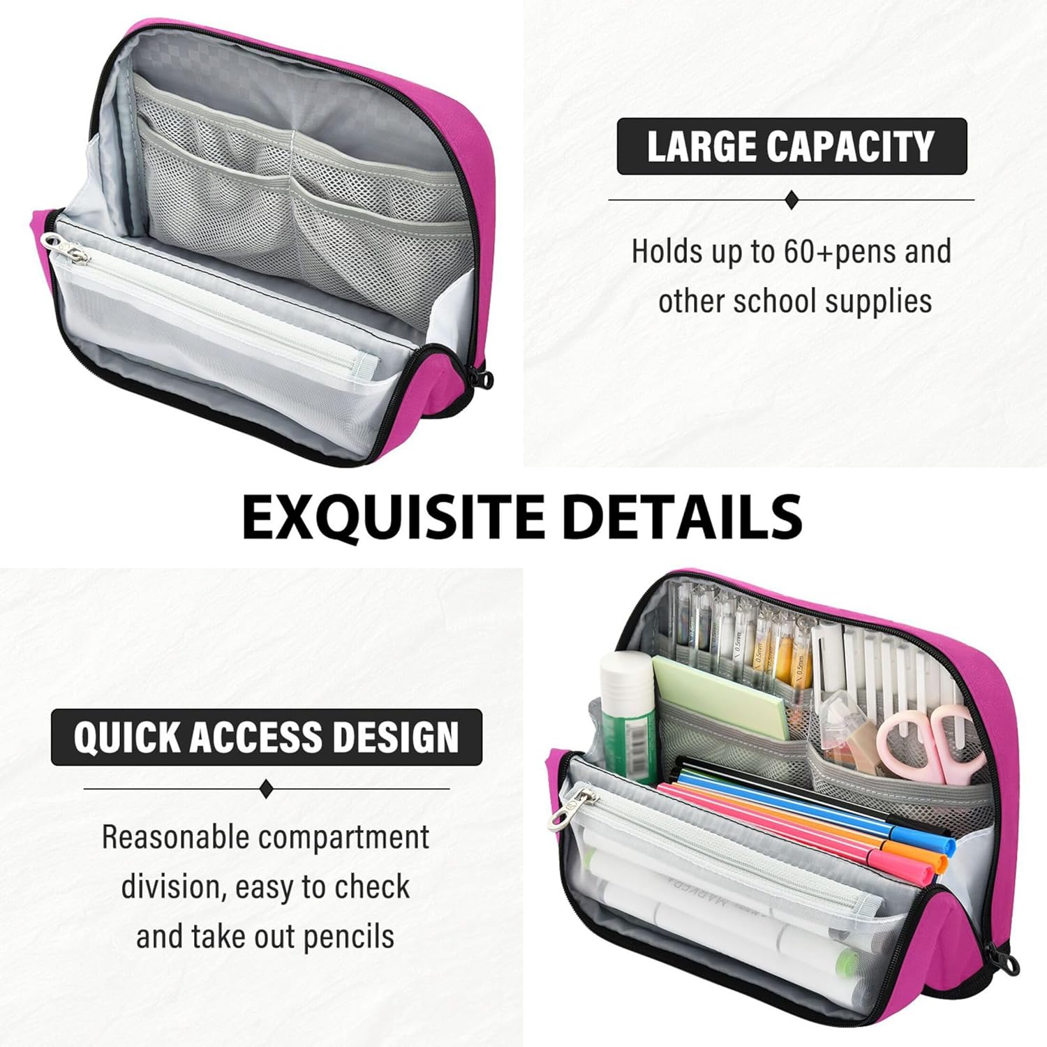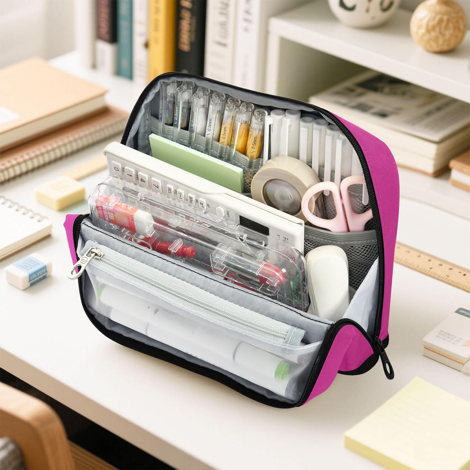 Funzione di supporto convertibile: con un intelligente sistema pieghevole e a scatto, l'astuccio da ufficio si trova in posizione verticale sulla scrivania, consentendo di organizzare e accedere ai tuoi oggetti senza problemi Struttura protettiva e pratica: realizzato in nylon resistente, l'astuccio carino per ragazze è progettato per resistere ai danni, rendendolo ideale per viaggi, scuola o spostamenti quotidiani Layout intelligente per riporre le tue scorte: l'astuccio preppy include uno scomparto principale, una tasca in rete con cerniera e uno slot aperto per separare e accedere agli oggetti con facilità Strumento versatile per tutti i giorni: dalle penne ai cosmetici, i sacchetti con cerniera possono essere utilizzati come astuccio, borsa da toilette o mini custodia per scuola, viaggi, ufficio o routine quotidiane Personalizzabile: con motivi vivaci e opzioni personalizzate per foto o testo, l'astuccio carino diventa un regalo premuroso per studenti, creativi e viaggiatori frequenti