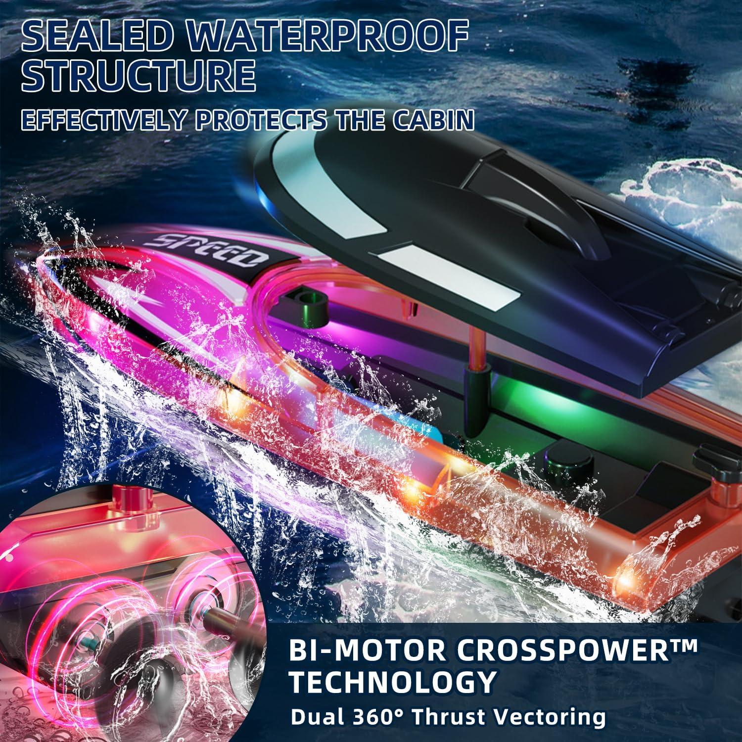 Doppia batteria per più divertimento: telecomando 2.4G e modalità multiplayer senza interferenze, più barche possono guidare contemporaneamente, senza interferenze. Un'altra caratteristica importante della nostra barca telecomandata è la dotazione con due batterie ricaricabili fino a 200 minuti (100 minuti per batteria). Ciò è particolarmente vantaggioso per coloro che desiderano godersi lunghe ore di guida ininterrotta. Illuminazione a LED scintillante: l'illuminazione a LED è una caratteristica eccezionale della nostra barca RC. Non solo offre un aspetto gradevole, ma migliora anche la visibilità e la sicurezza durante la guida, soprattutto in condizioni di scarsa illuminazione. Le luci brillanti lampeggiano in diversi colori e creano un'atmosfera emozionante che delizierà bambini e adulti. Facile restauro: la capacità di rimontare facilmente una barca inclinata è una caratteristica cruciale che distingue la nostra barca telecomandata dalle altre. In acque agitate o con vento forte, la barca può facilmente ribaltarsi. In tali situazioni, è importante poter rimontare la barca semplicemente premendo un pulsante sul telecomando. Che tu sia un navigatore esperto o un principiante, la facilità di recupero ti assicura di non doverti preoccupare quando la barca si ribalta. Potente e potente: la potenza della nostra barca telecomandata è impressionante ed è supportata dal potente doppio motore. Questa tecnica garantisce che la barca funzioni in modo stabile e veloce, anche in ambienti difficili. Sia che tu stia guidando su acque calme o tra onde e vento, la nostra barca offre prestazioni eccezionali Impermeabile e robusta: una caratteristica importante della nostra barca telecomandata è la sua costruzione impermeabile e robusta. La copertura esterna avvitata garantisce che nessuna quantità di acqua penetri all'interno, anche se la barca naviga in acque tempestose. Ciò significa che non devi preoccuparti dei danni causati dall'acqua e puoi guidare la tua barca con sicurezza, qualunque sia il tempo