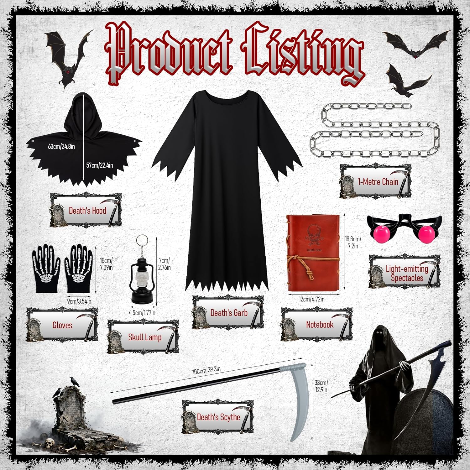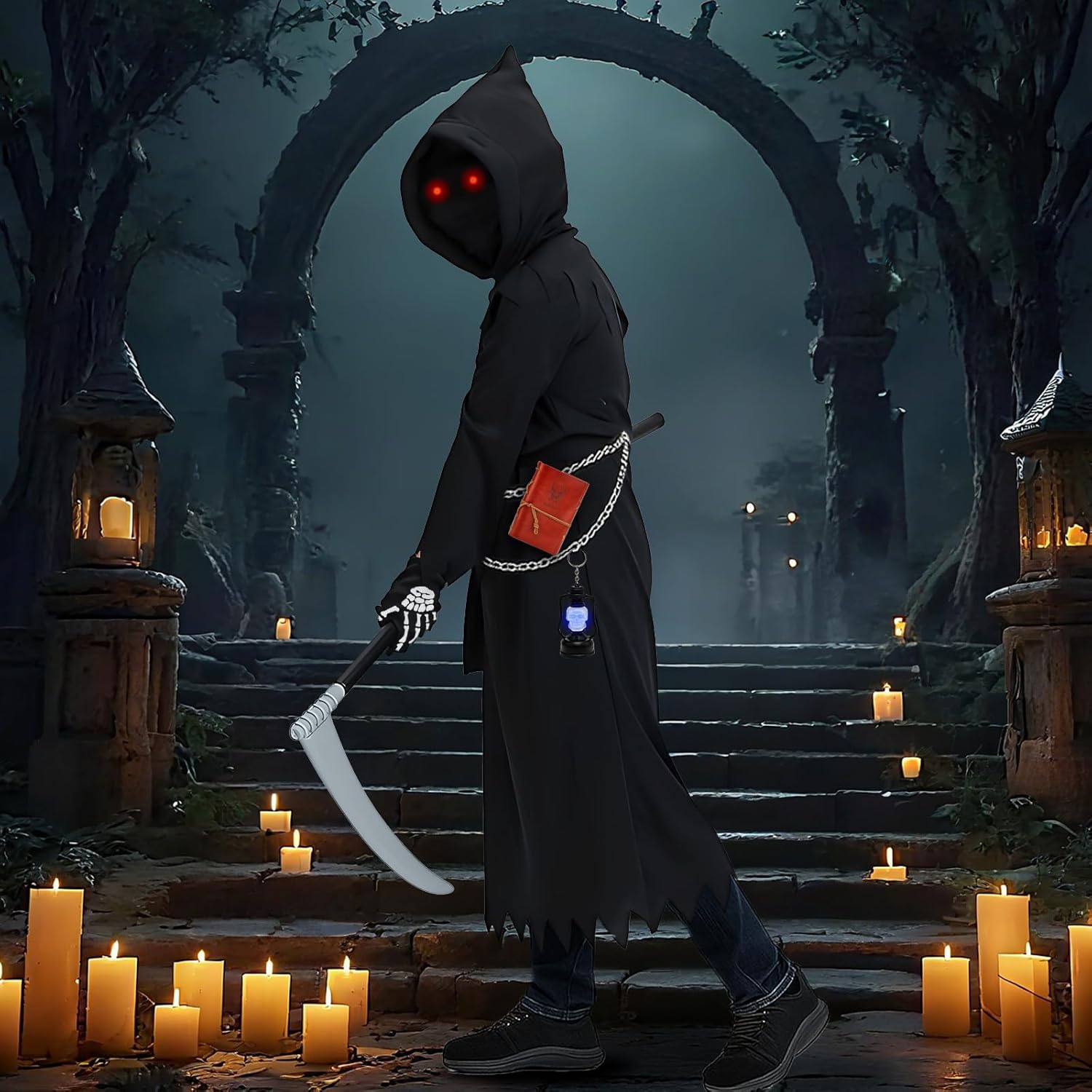 Descrizione prodotto Trasformate il vostro bambino in un ultimo Mietitore ad Halloween! Realizzato in poliestere morbido ed elastico, il costume garantisce il massimo comfort per tutta la serata. È disponibile in quattro pratiche misure per bambini dai 4 ai 14 anni, offrendo quindi la vestibilità perfetta. Gli accessori in dotazione, come gli occhiali luminosi e la catena a spirito tiranti, diffondono una vera atmosfera horror e rendono ogni aspetto una vera attrazione. Perfetto per feste di Halloween, carnevale, feste a tema o eventi cosplay. Specifiche: Nome del prodotto: costume da Mietitore per Materiale: poliestere. Colore: nero Taglie: S, M, L, XL La confezione include: 1 vestito Mietitore 1 cappuccio. 1 cintura. 1 falce 1 paio di occhiali luminosi Catena da 1 metro. 1 taccuino 1 lampada a forma di teschio. 1 paio di guanti. Avvertenze: 1. Il mantello della morte, la maschera e i guanti sono tutti lavabili in lavatrice, ma devono essere lavati a 30 gradi Celsius o inferiori per proteggere il tessuto e prolungare la durata del prodotto. 2. Si prega di considerare un margine di errore di 1-3 cm a causa della misurazione manuale. Grazie per la comprensione. 3. A causa delle diverse impostazioni dei monitor e della luce, il colore reale potrebbe essere leggermente diverso dal colore dell'immagine. Grazie per la comprensione. Avviso di sicurezza no