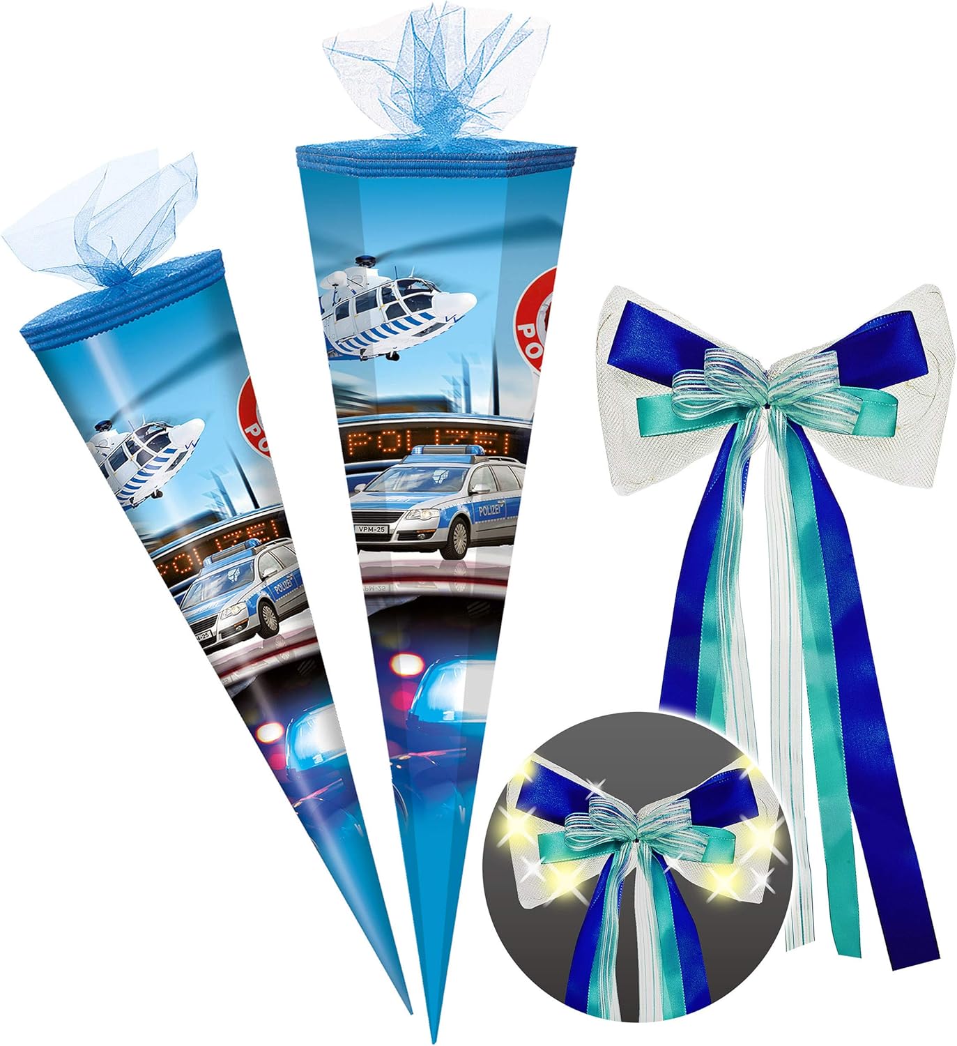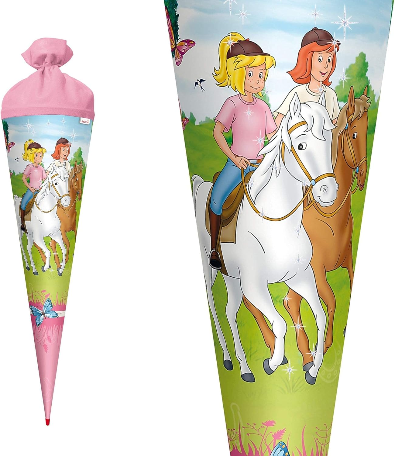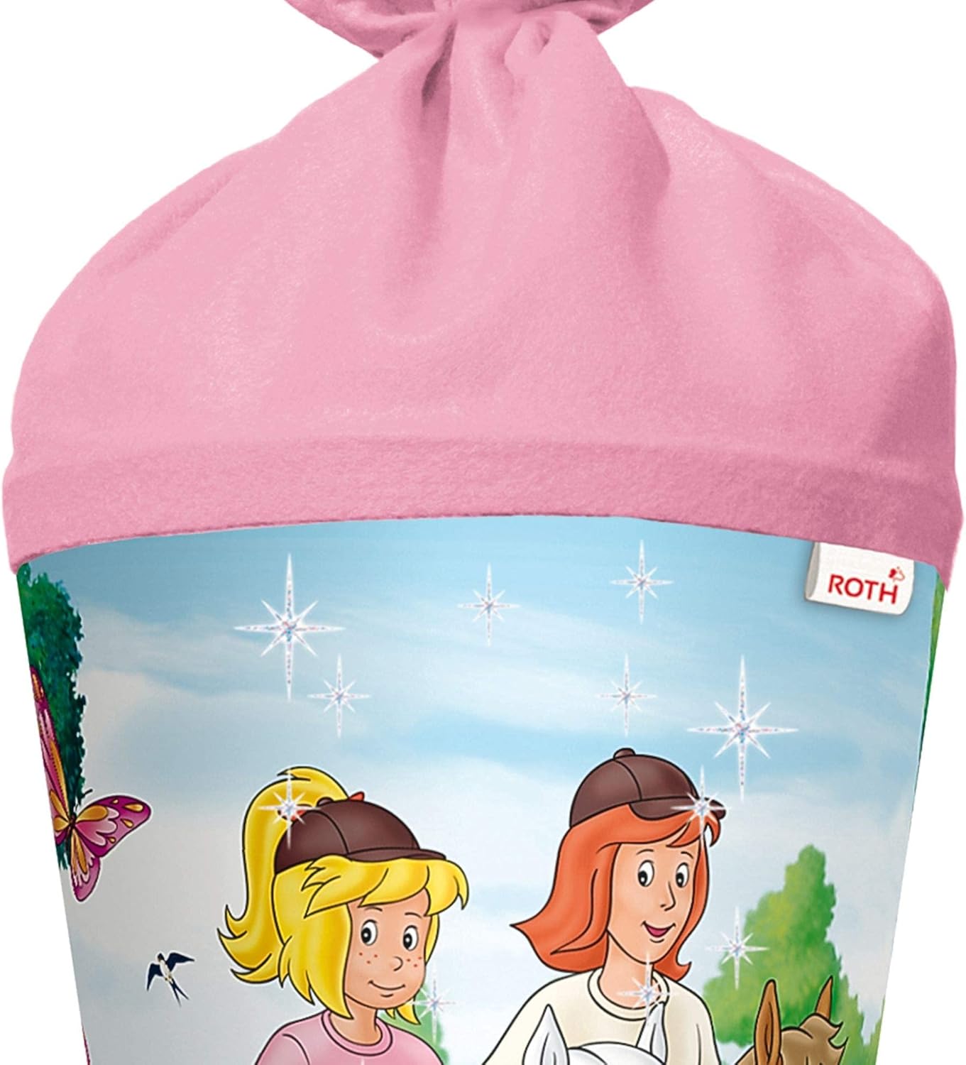 Cono per la scuola delle bambine. Motivo: Bibi e Tina Forma: rotonda. Dimensioni: 70 cm. Chiusura in feltro con glitter Spazio sufficiente per dolci e piccoli pensieri per i bambini.