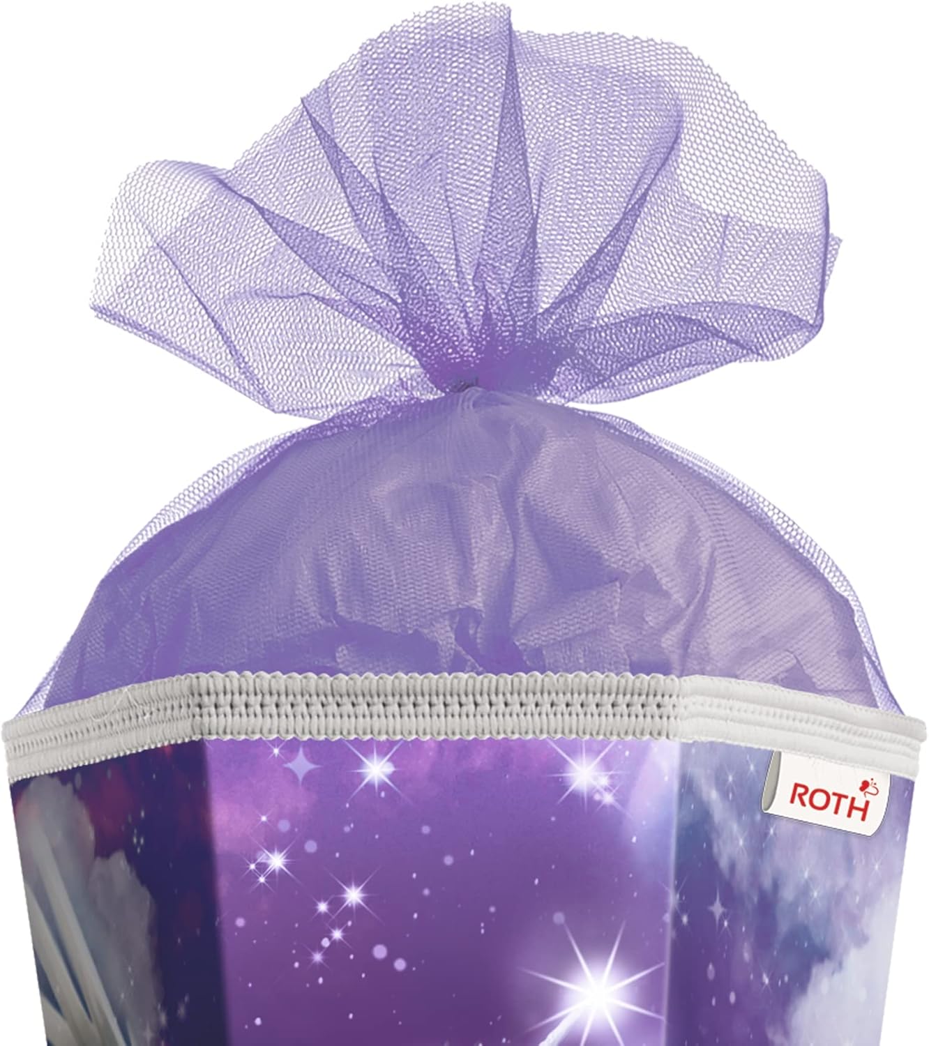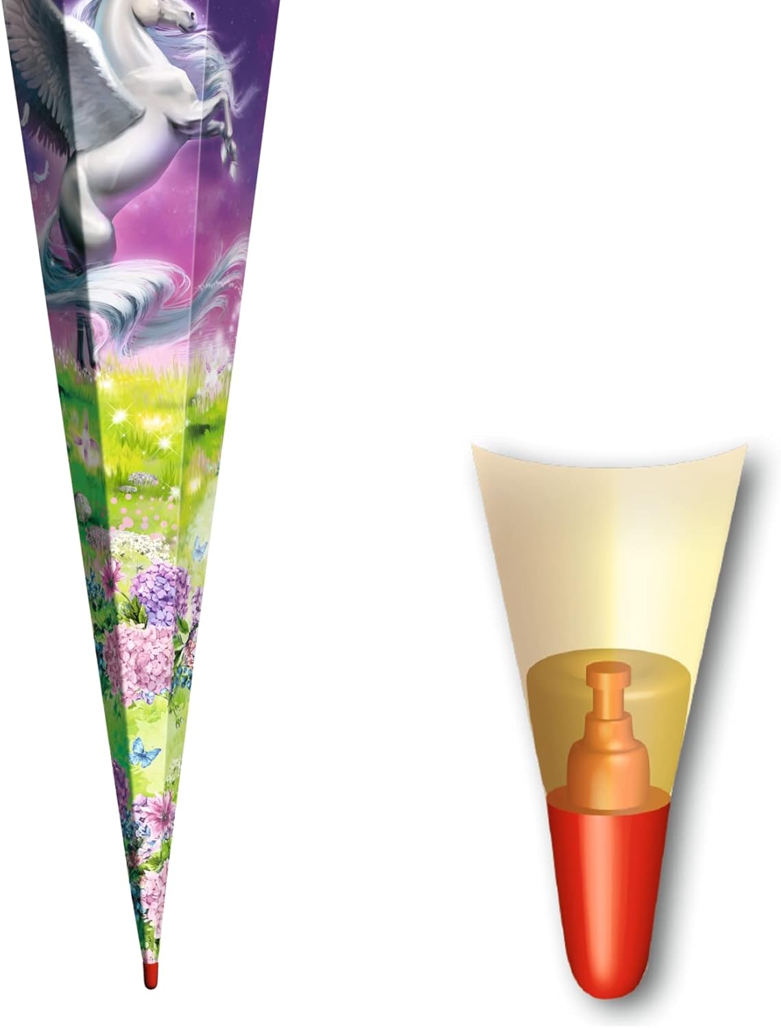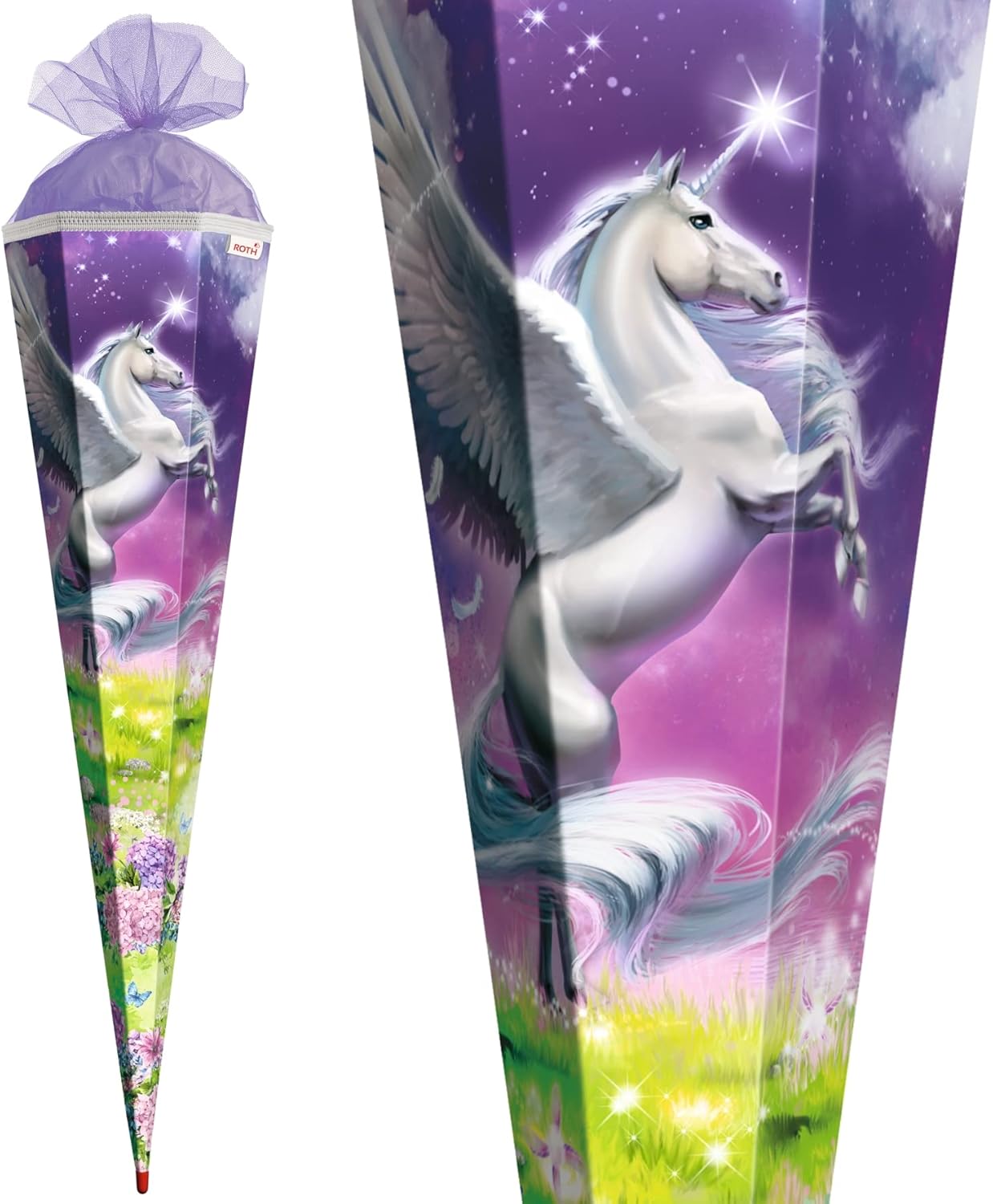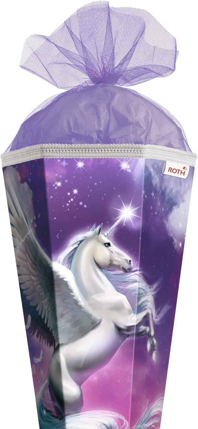 Cono scolastico con motivo di alta qualità "Magic Pegasus" per ragazze Il cono scolastico con motivo è alto 85 cm, esagonale e chiuso con tulle viola. Il personaggio principale di questo motivo è un bellissimo Pegaso in un prato fiorito con farfalle svolazzanti. Spiega con orgoglio le sue imponenti ali sotto il cielo notturno. Prodotto di qualità della ROTH in Sassonia