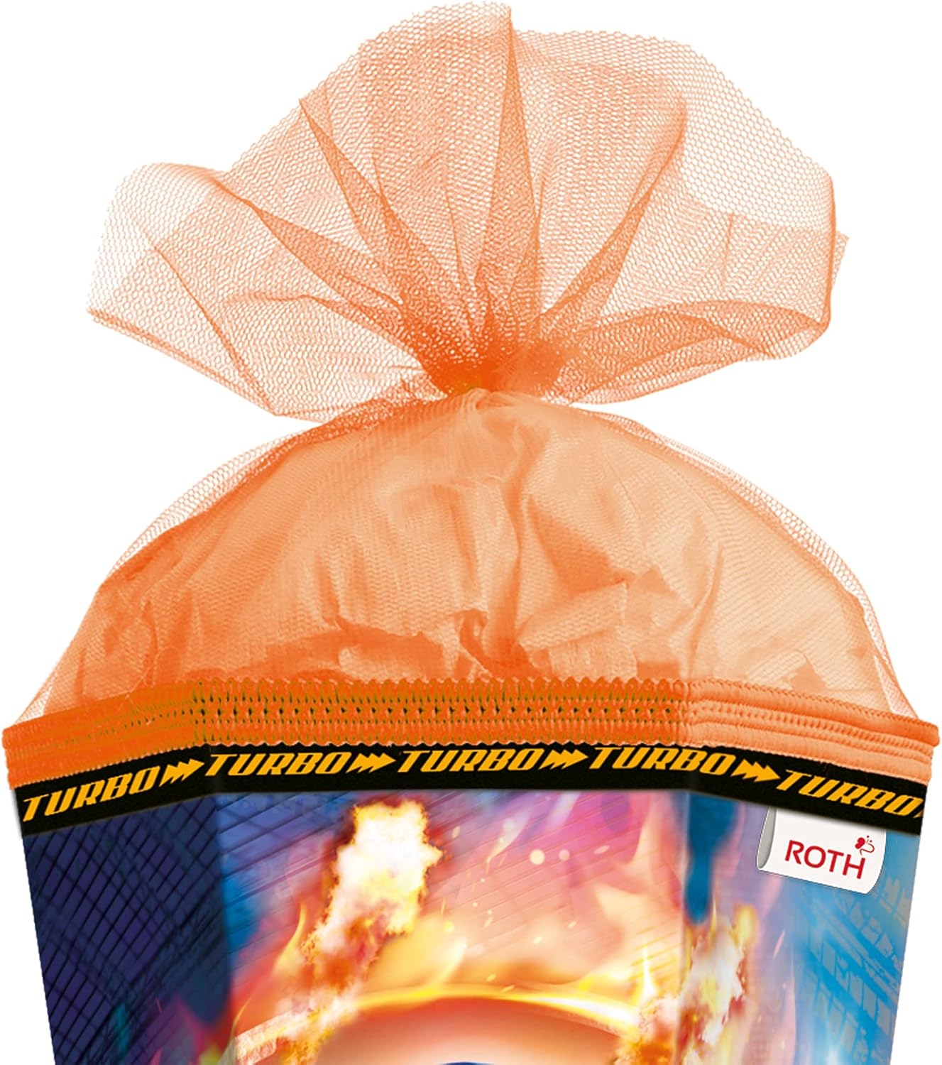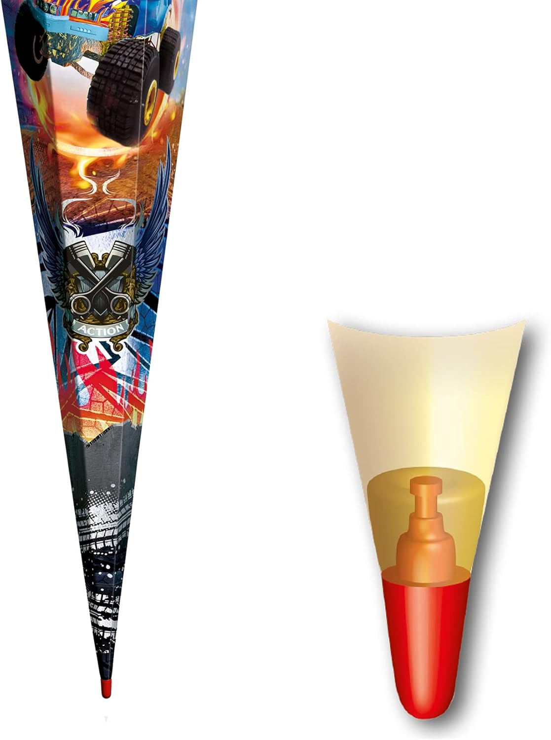 Cono scolastico per ragazzi con motivo monster truck di alta qualità Il cono scolastico con motivo è alto 85 cm, quadrato e chiuso con tulle arancione Il bordo speciale e la pellicola lucida garantiscono la giusta sensazione di rally e fanno battere forte il cuore di ogni ragazzo Motivo d'azione con un monster truck che salta attraverso un anello di fuoco Prodotto di qualità da ROTH in Sassonia