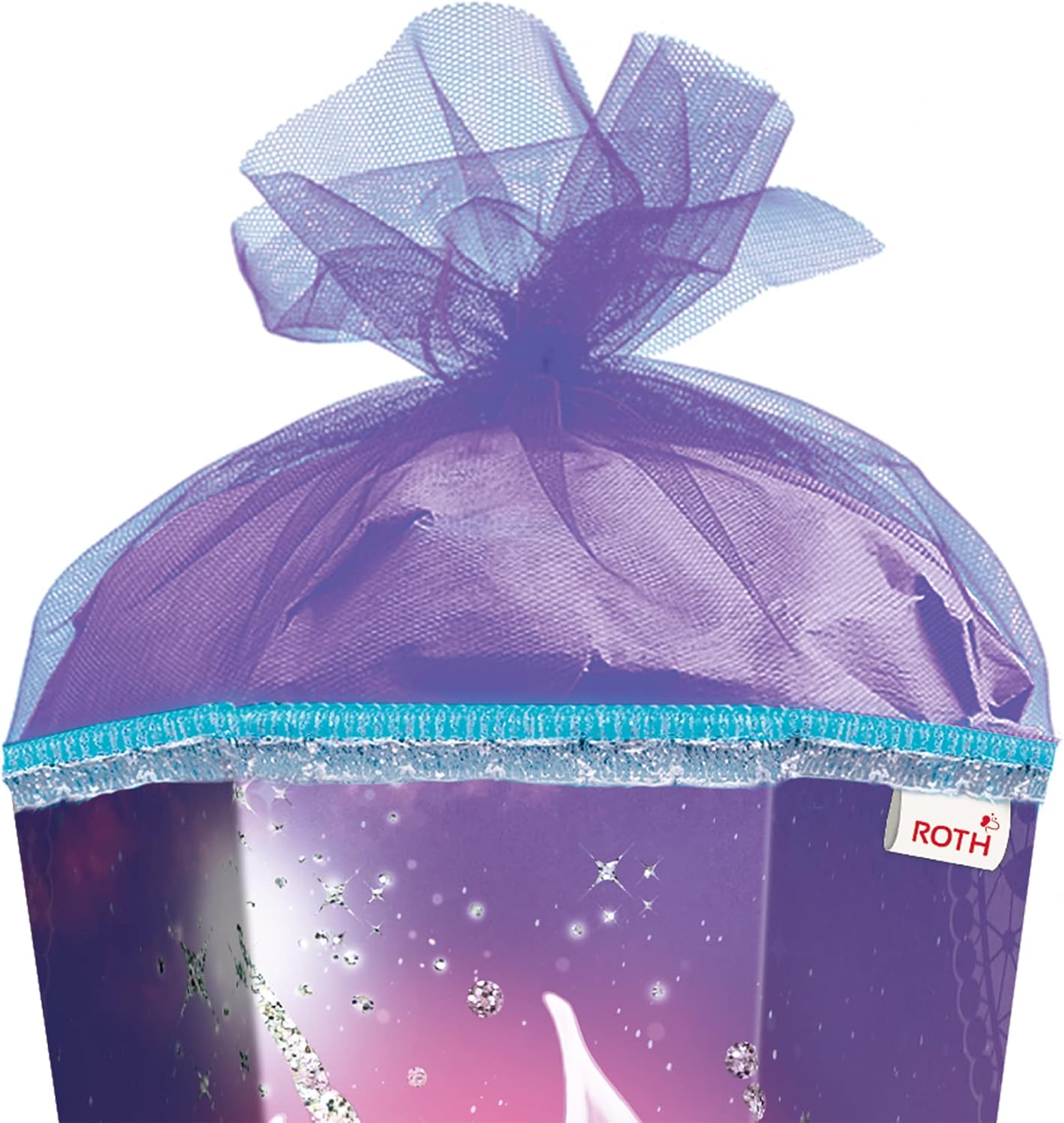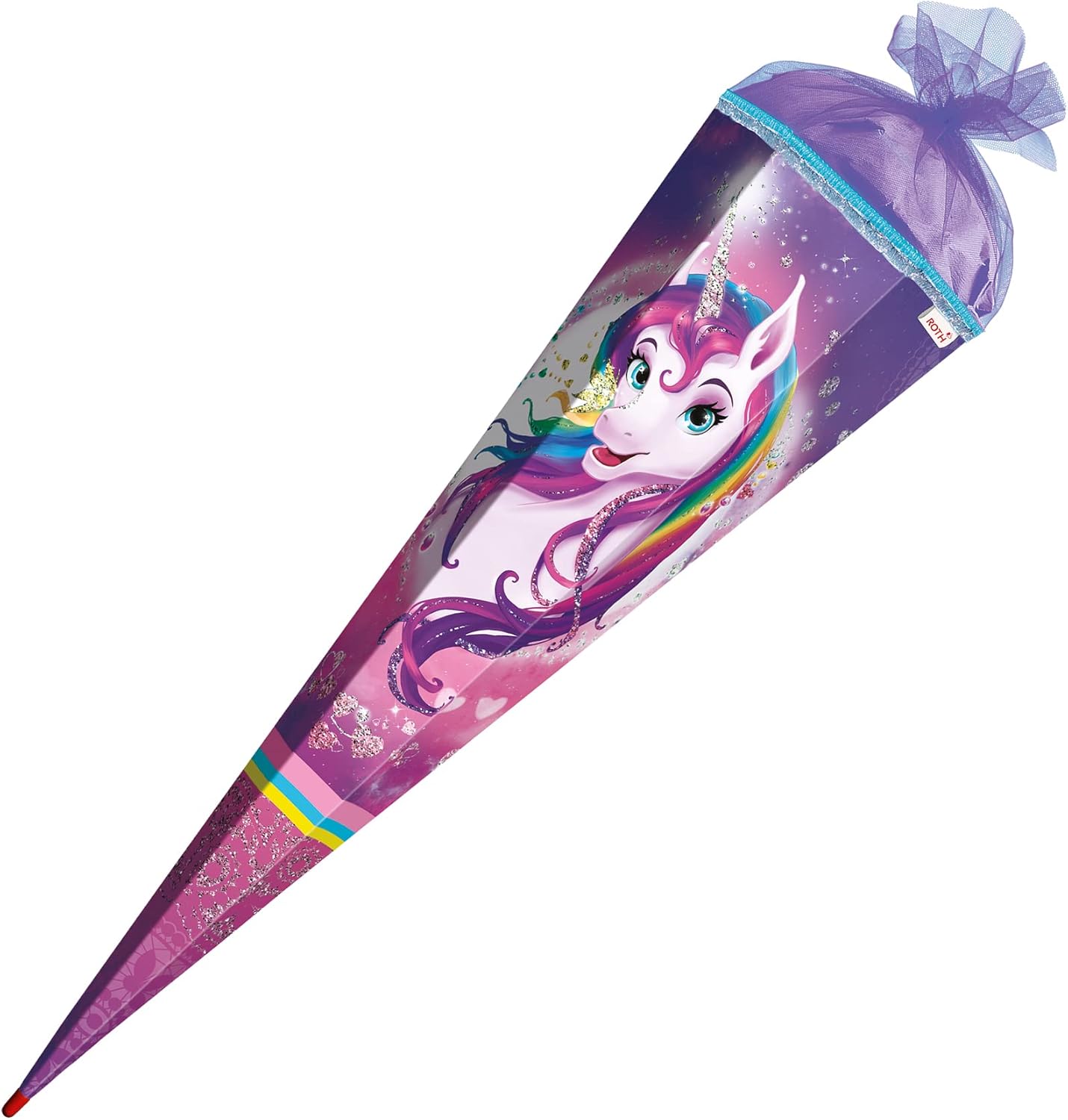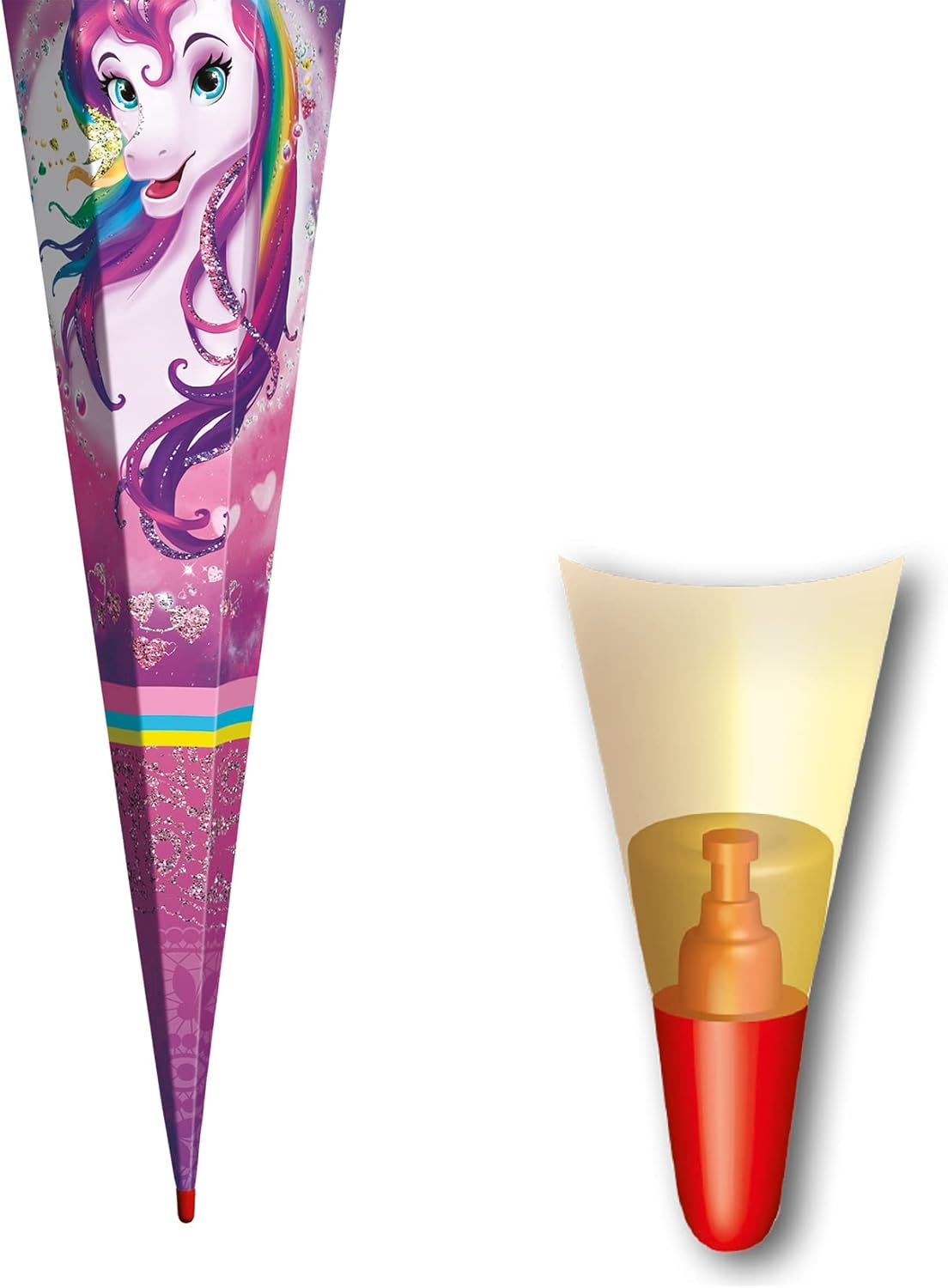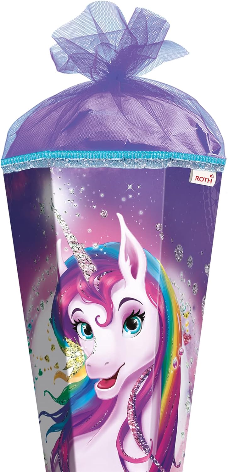 Cono scolastico con motivi di alta qualità con ritratto di unicorno per ragazze. Il cono scolastico con motivo è alto 85 cm e quadrato. Il bellissimo unicorno è circondato da teneri cuori, che sembrano fuori da un cerchio arcobaleno colorato. Cono scolastico ad effetto con glitter scintillanti sul motivo. Prodotto di qualità della ROTH in Sassonia