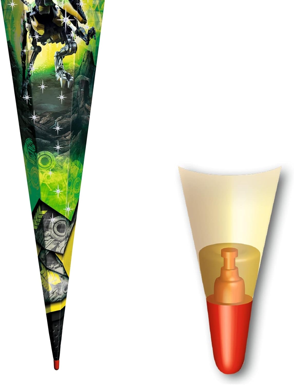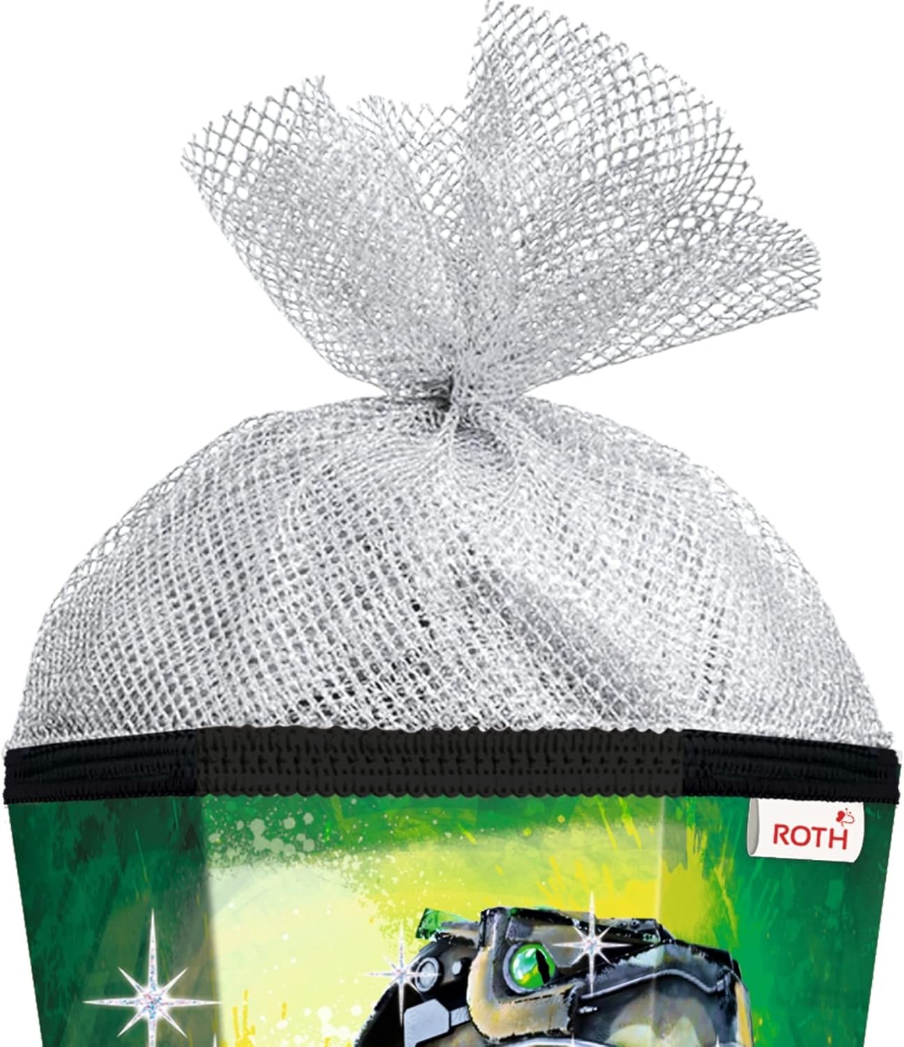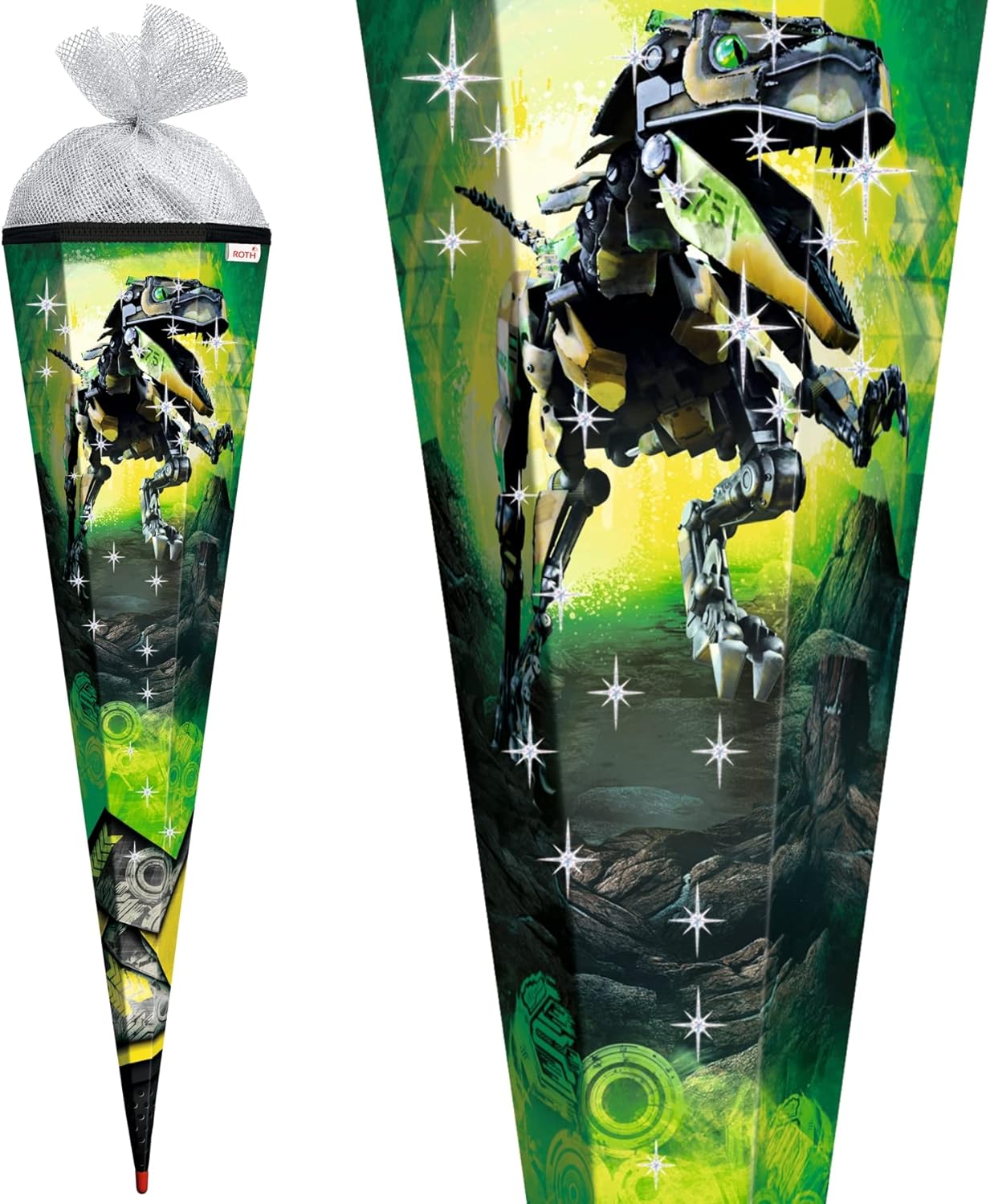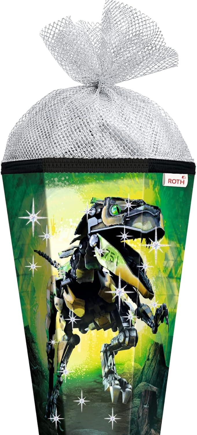 Cono scolastico con motivo Robo-Rex di alta qualità per tutti i coraggiosi fan dei dinosauri. Il cono scolastico con motivo è alto 85 cm, quadrato e chiuso con tulle nero. Effetto cono scolastico con tulle argentato e lamina sul motivo Diffonderà paura e terrore. Un riuscito connubio tra passato e futuro. Prodotto di qualità della ROTH in Sassonia