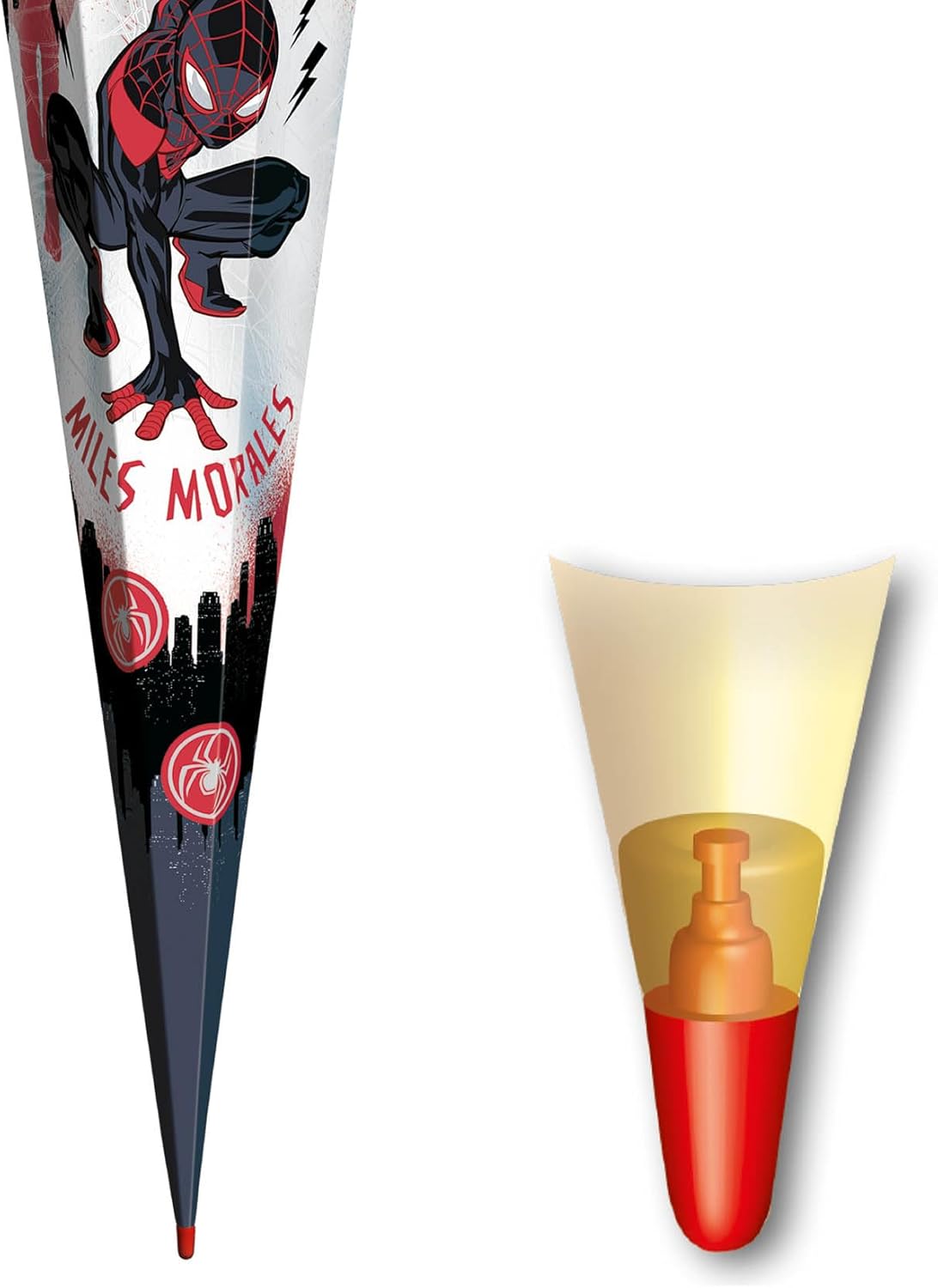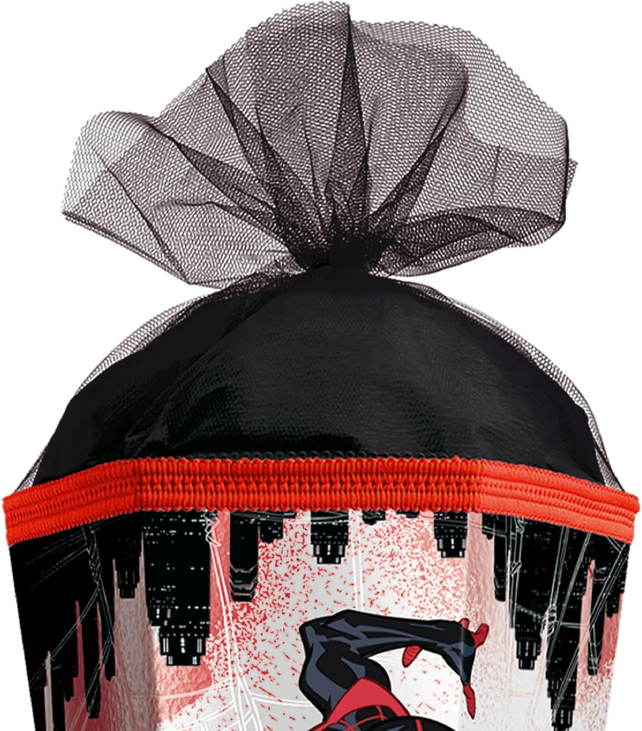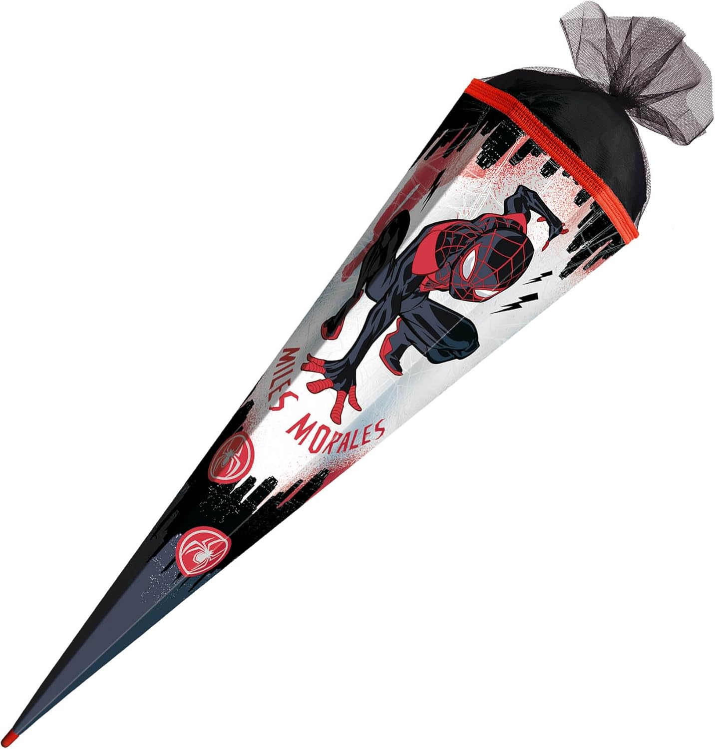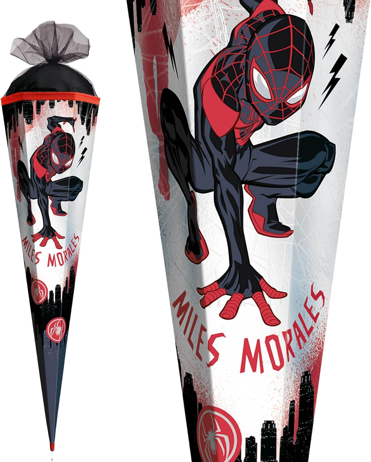 Miles Morales si siede con impazienza, pronto a sparare i suoi fili di ragno. Grazie allo sfondo in bianco e nero è particolarmente accattivante nel suo rosso e nero. Questo motivo fa brillare gli occhi dei bambini.