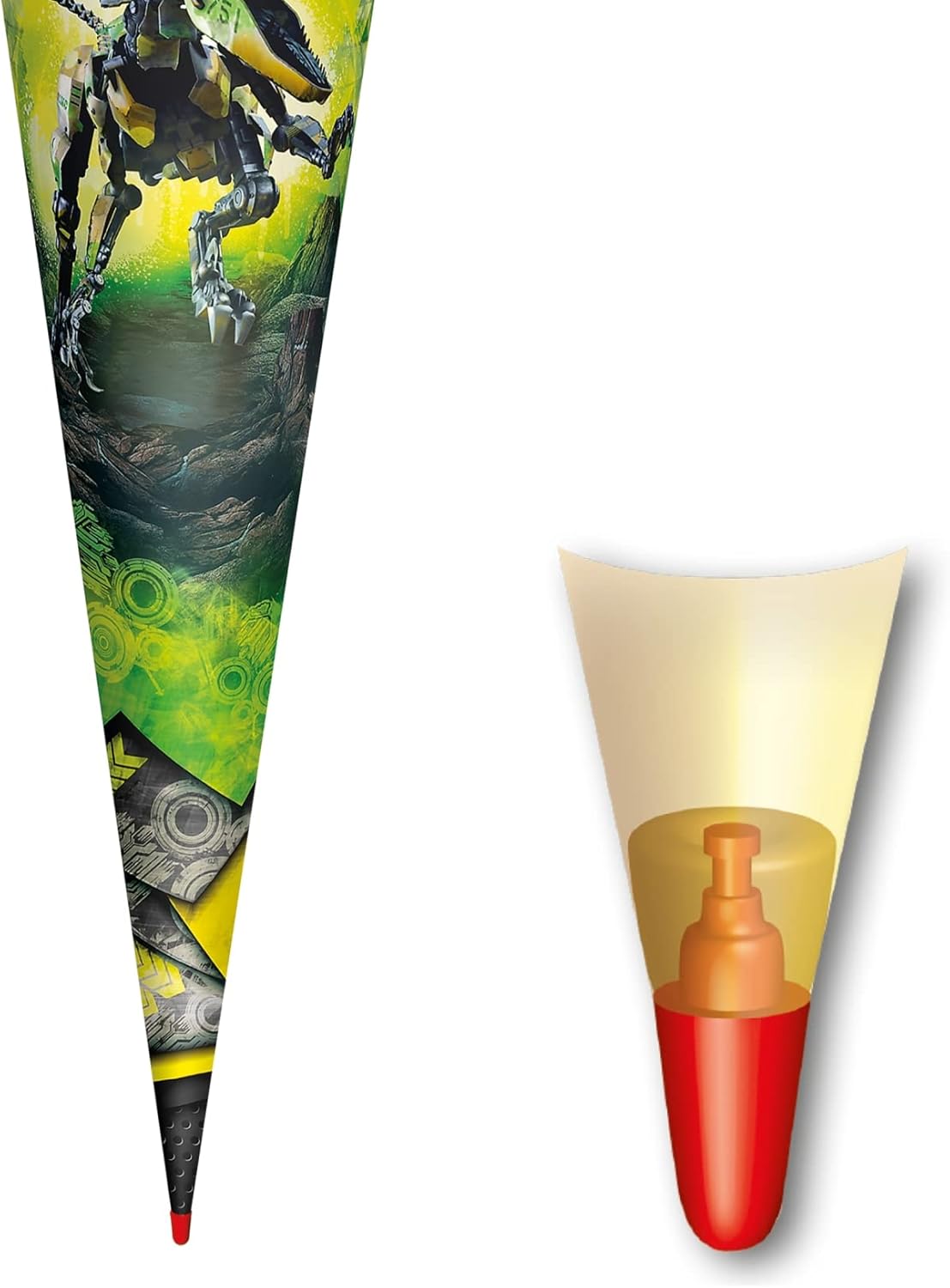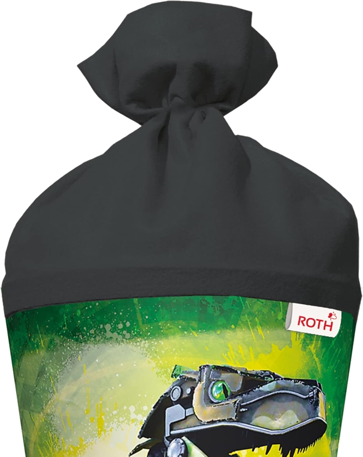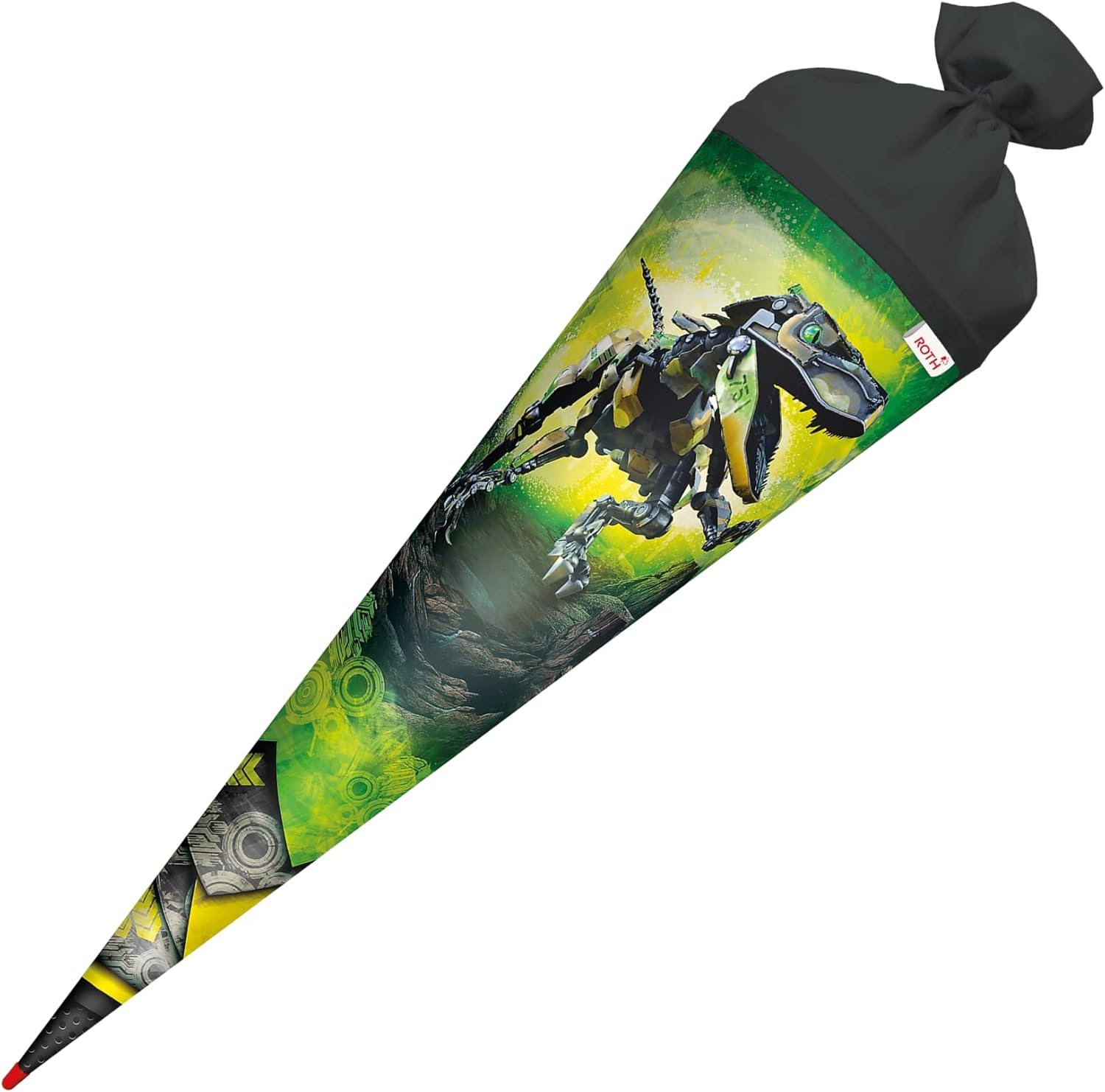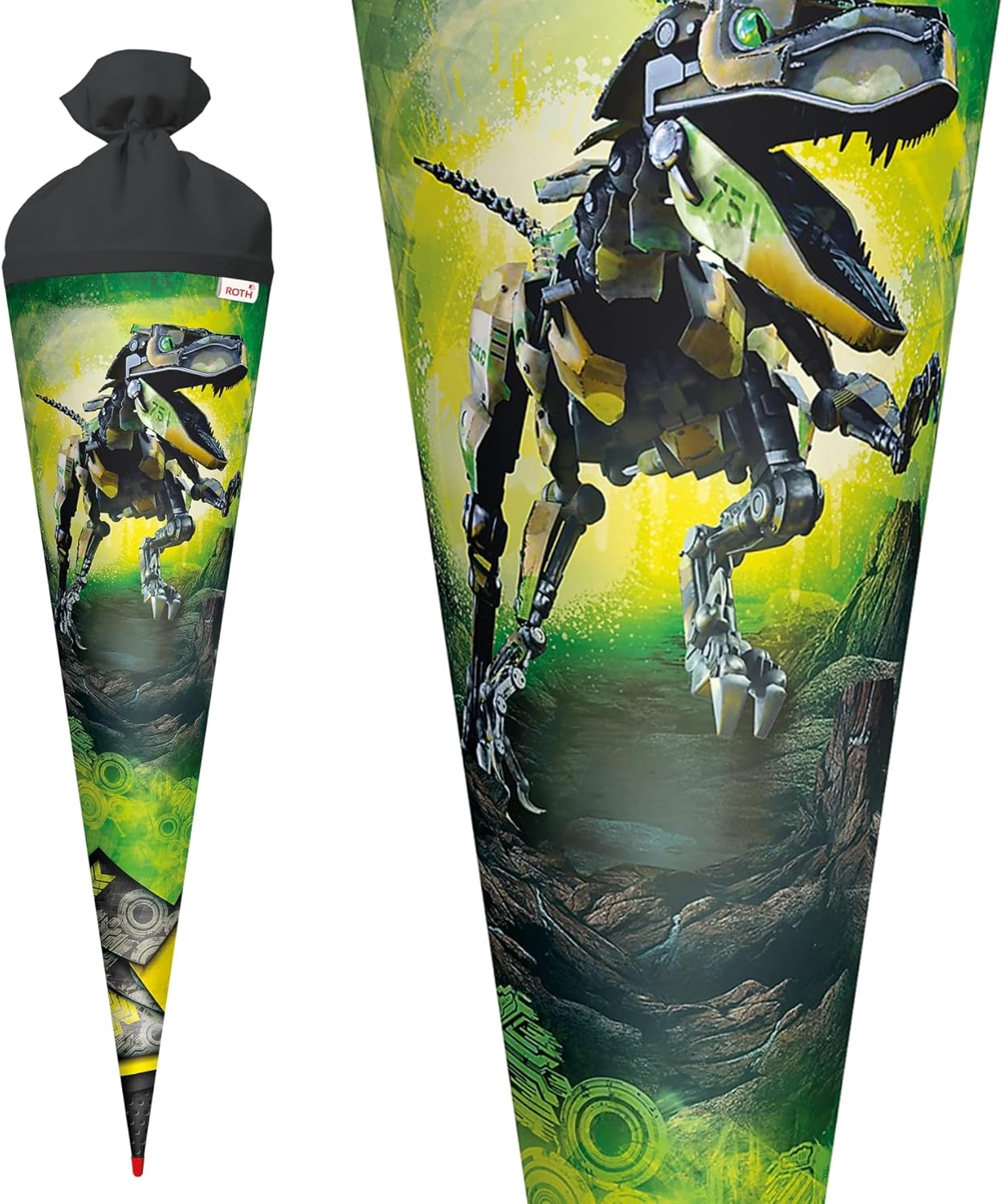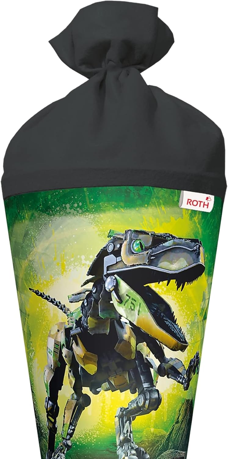 Cono per la scuola con motivo Robo-Rex di alta qualità per tutti i coraggiosi fan di dinosauro. Il cono per la scuola con motivo è alto 70 cm e rotondo e chiuso con feltro nero. Un T-Rex con design mimetico sui suoi componenti meccanici e gli occhi verdi luminosi. Diffonde paura e terrore. Una perfetta combinazione di passato e futuro. Prodotto di qualità della casa ROTH in Sassonia