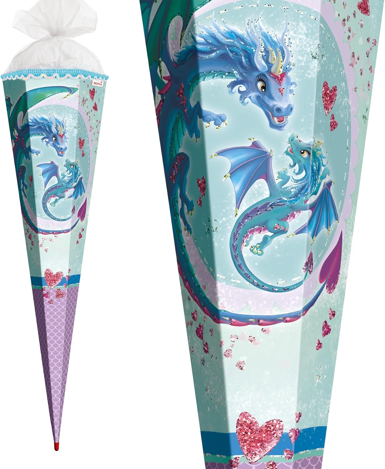 Cono di alta qualità, motivo drago amore per ragazze Il cono per la scuola misura 85 cm, esagonale e chiuso con tulle bianco Glitter fini e un bordo con paillettes completano il motivo La scelta giusta per tutti gli appassionati di draghi Prodotto di qualità del marchio ROTH in Sassonia