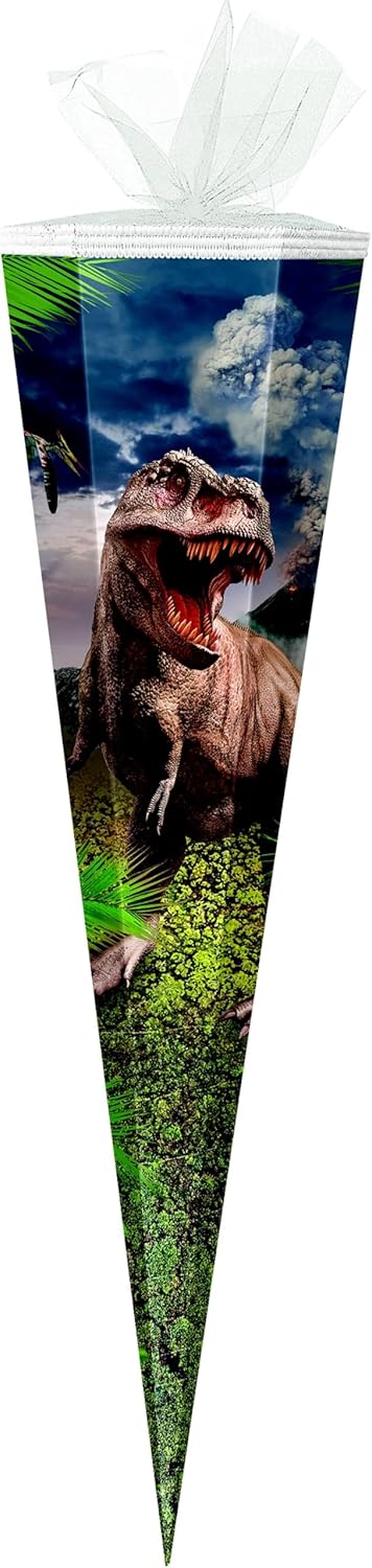 Cono di alta qualità con motivo Tyrannosaurus per ragazzi Il cono regalo per la scuola misura 35 cm e rotondo e chiuso con tulle nero Per tutti i coraggiosi principianti della scuola, questo cono è la scelta giusta Il potente motivo raffigura un pericoloso tirannosauro nel mezzo della foresta primordiale di un paesaggio montano Prodotto di qualità del marchio ROTH in Sassonia