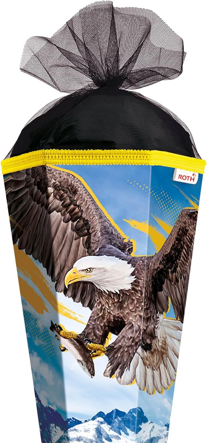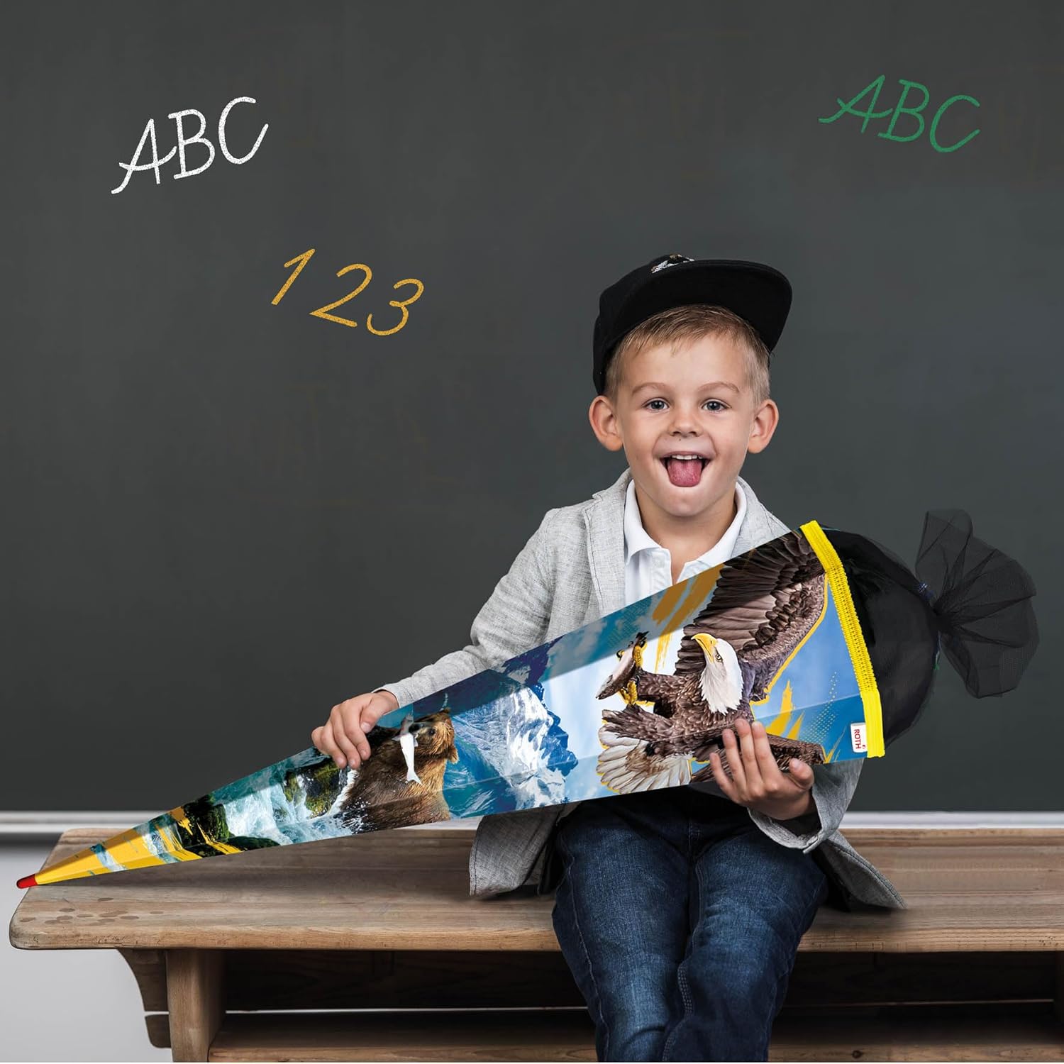 Cono scolastico con motivi di alta qualità per i nostri amanti della natura Il cono scolastico è alto 85 cm, esagonale e chiuso con tulle nero. Motivo potente grazie all'interazione tra animali e natura. Prodotto di qualità della ROTH in Sassonia