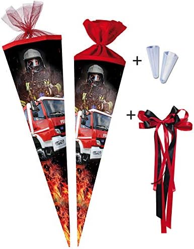Set di sacchetti di alta qualità "Drago di fuoco" per ragazzi Il cono pronto per la scuola misura 68 cm e esagonale Con punta Roth brevettata, chiusura increspata e nastro di chiusura abbinato Corpo in cartone ondulato con parti in gomma espansa pretagliate Consegna piatta