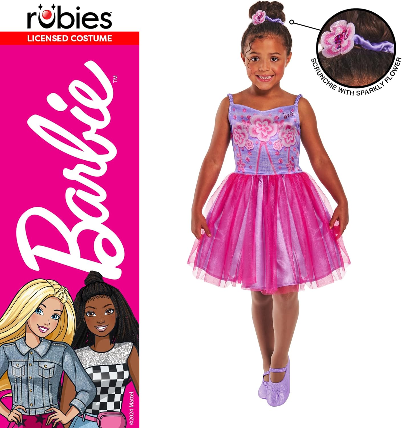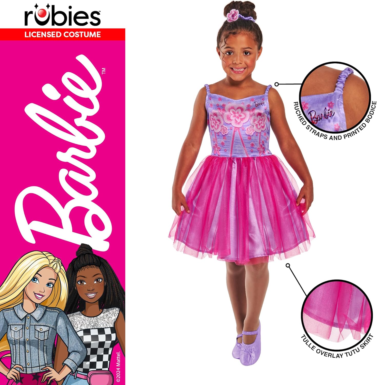 Abito classico Barbie Ballerina creato da Rubie's Include un abito rosa da ballerina con marchio Barbie con elastico per capelli a fiori abbinato Il prodotto con licenza ufficiale Rubie's è stato testato e soddisfa tutti gli standard europei e britannici, incluso l'EN71 Prodotto progettato nel Regno Unito, si prega di fare riferimento alla tabella delle taglie per riferimento Vestito ideale per feste a tema, Halloween e Giornata mondiale del libro